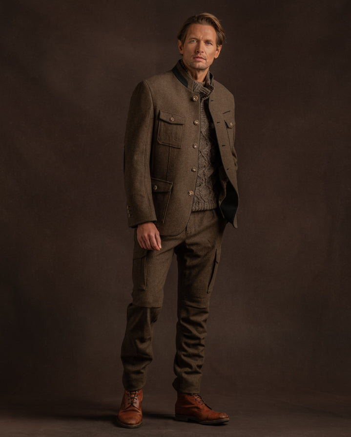 The Adrian Jacket by Habsburg is a time tested classic that we are pleased to offer to our hunting enthusiast clients. Stylish, smart, and fir for purpose, this traditional Austrian style jacket features 4 patch pockets, hand warmer pockets, real horn buttons and an action back for ease of movement. Crafted from a wool blend herringbone, this handsome jacket is ready for town or country.