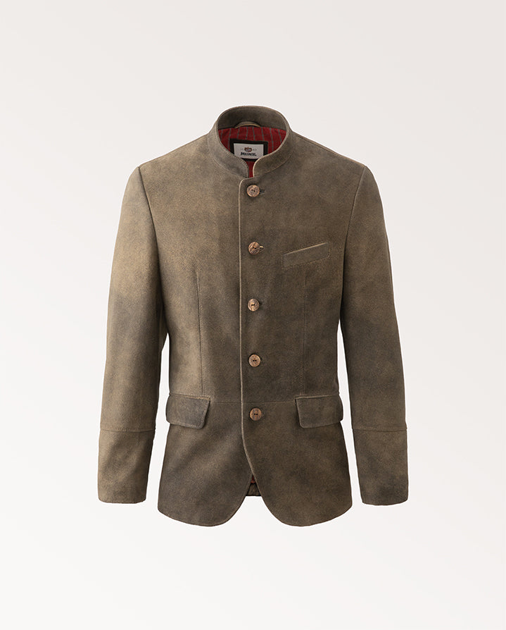 The Meindl Konrad Jacket showcased in the photo embodies traditional Austrian styling with its refined design. Crafted from premium deerskin leather, this jacket offers a sophisticated yet rugged appearance. Its classic stag horn button-front closure and tailored fit make it an elegant choice, blending heritage craftsmanship with modern functionality. Perfect for those who appreciate timeless style and quality.