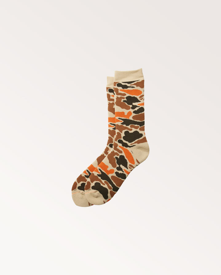 The Camo Crew Socks by Rototo are high quality and designed with comfort and fit in mind. These thick socks have a camouflage outer design and a natural soft fleece-back. Finished with a elasticated band and a contrasting red hand-linked seam. Rototo makes their premium sock in Nara, Japan using an eco low-gauge sock using a mixture of natural organic cotton and robust synthetic threads.