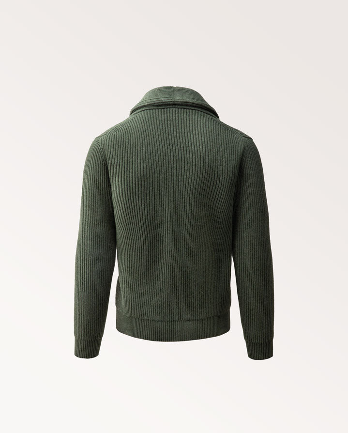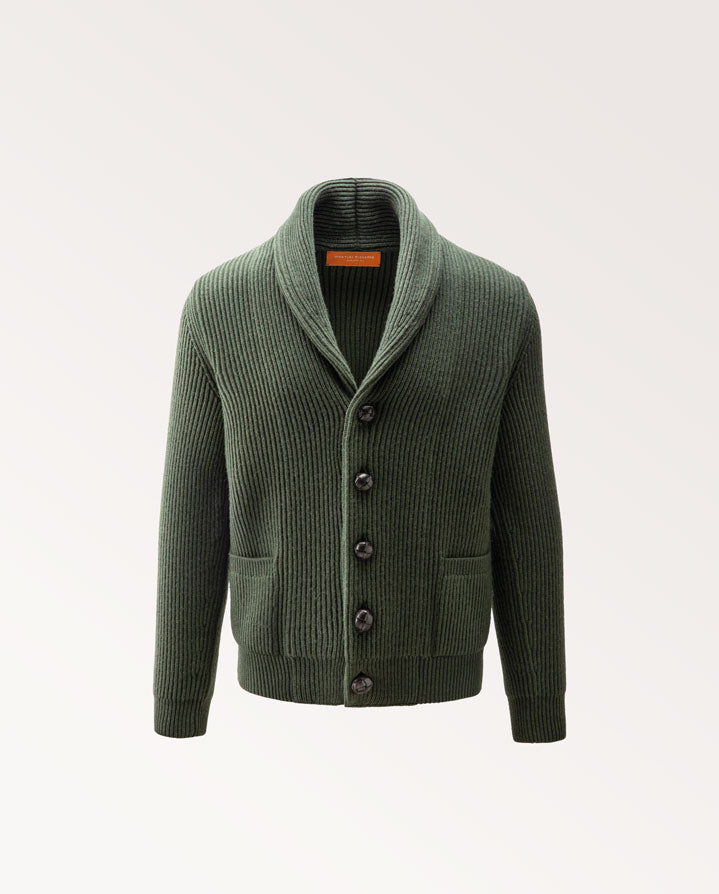 Knitted in Scotland from a luxurious blend of wool and cashmere, the Anglesey Cardigan is a robust yet refined layer for the colder months. Its heavy rib knit construction and shawl neck collar provide warmth and structure, while leather buttons add a touch of heritage detail. Presented in a deep Forest hue, this cardigan embodies the timeless style of the Westley Richards sportsman, equally at home in the field or by the fireside.