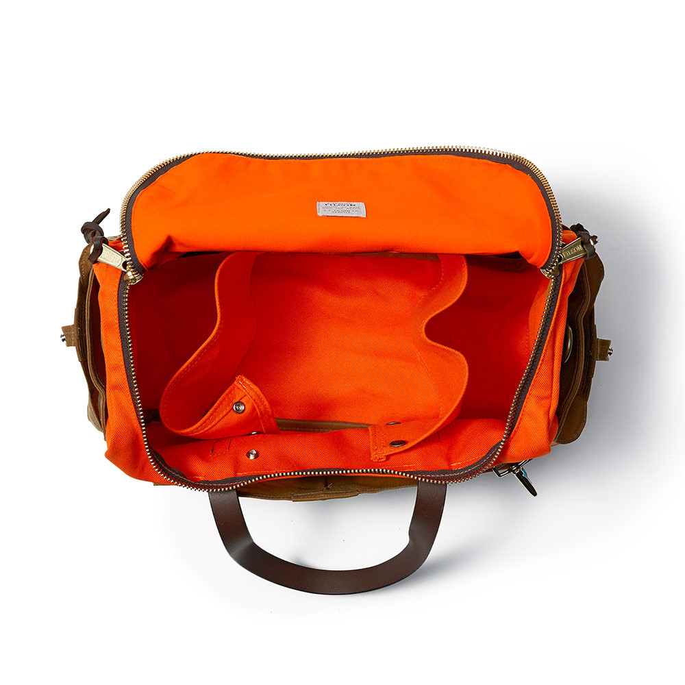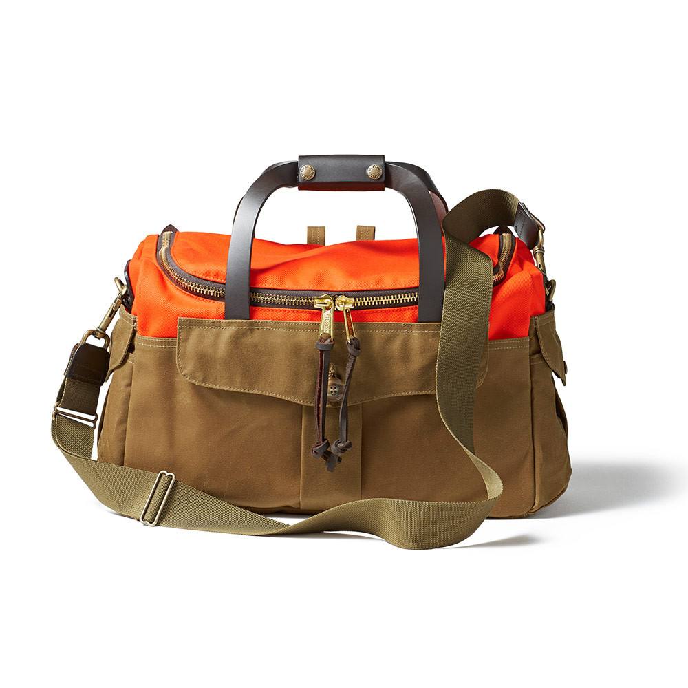 Durable and functional Sportsman Bag comes with features inspired by Filson's best-selling hunting jackets. Front outer pocket, 2 end pockets with 2-finger snaps. Double back pocket, 1 with game bag-style opening. Spacious main compartment with 2 snap-out panels to divide the space into halves or thirds as needed (to separate dirty clothes from clean, shoes from towels, etc.). Rust resistant brass fittings, heavy-duty 2-way brass zippers, Genuine Bridle Leather grip.