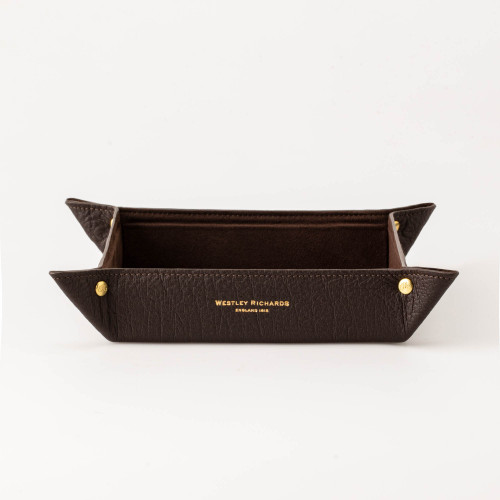 Handmade in England from fine Buffalo leather and lined with soft Alcantara, this elegant valet tray is perfect for organising everyday essentials. Finished with brass riveted corners and gold-embossed branding, it’s a practical and stylish addition to any home or office and makes an excellent gift for the discerning gentleman.