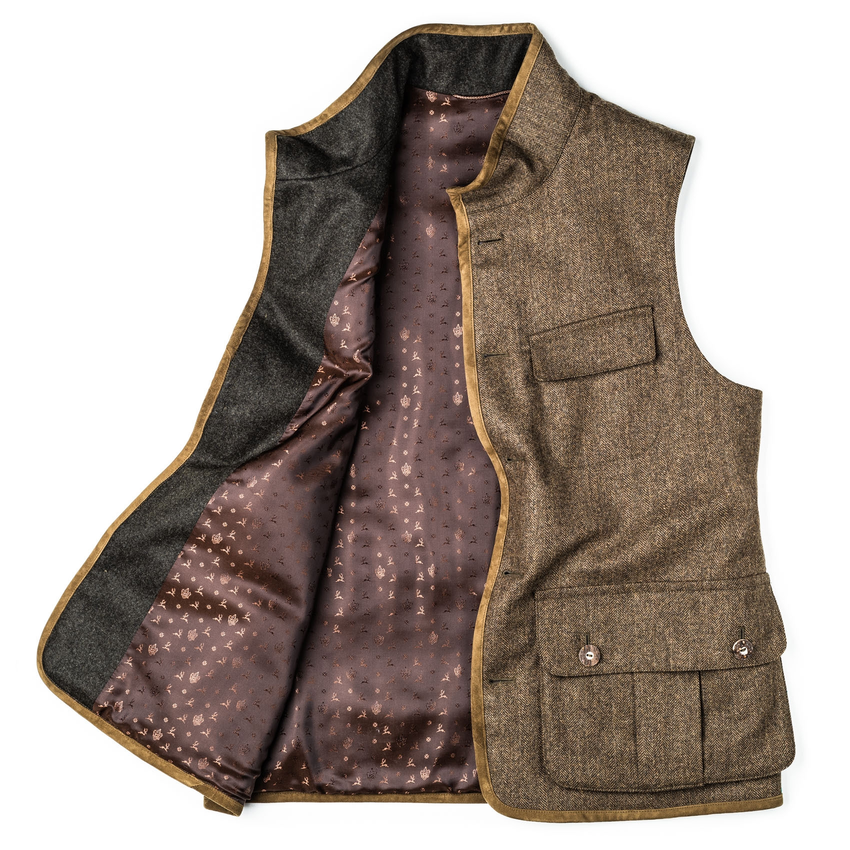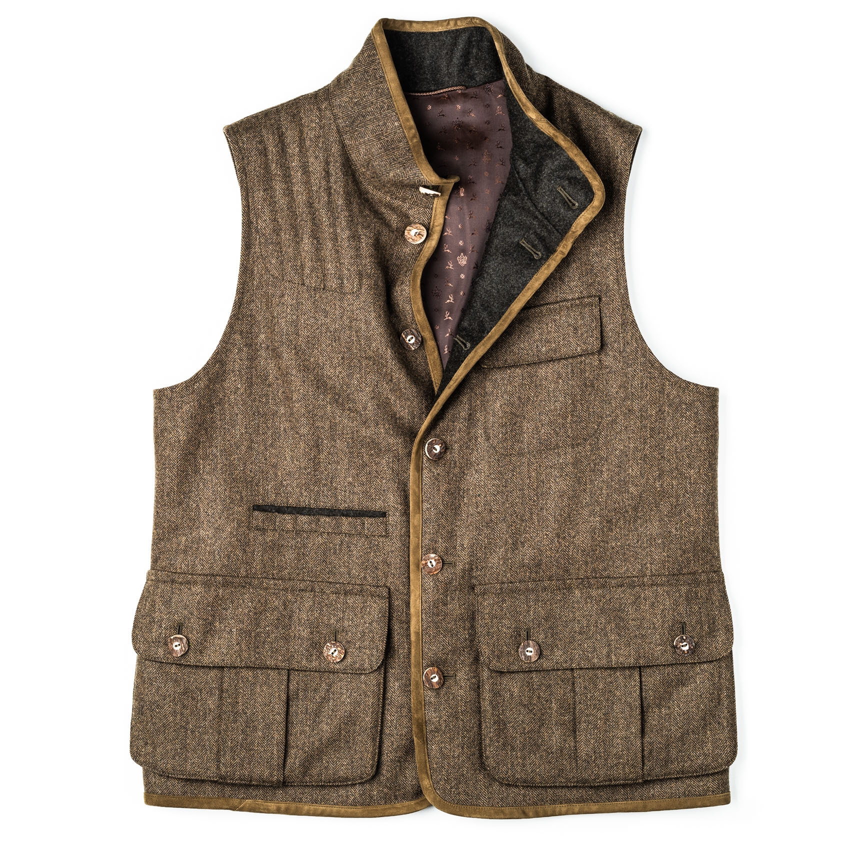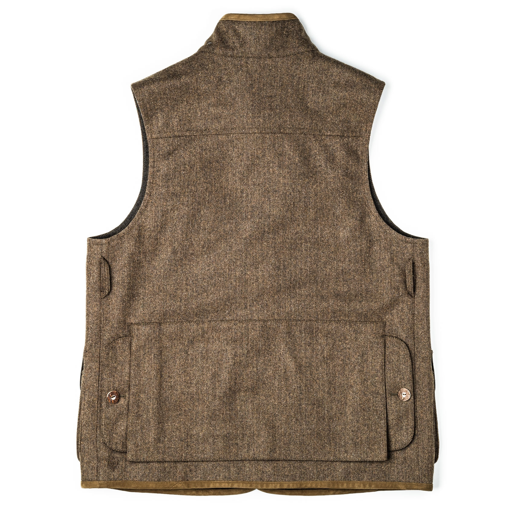 The Men's Ambros Herringbone Tweed Waistcoat is the perfect layer for in the field or ruggedly handsome addition over your favourite jumper in the winter. This classic design features real horn buttons, suede details, roomy bellows pockets on the front and a game pocket on the rear.