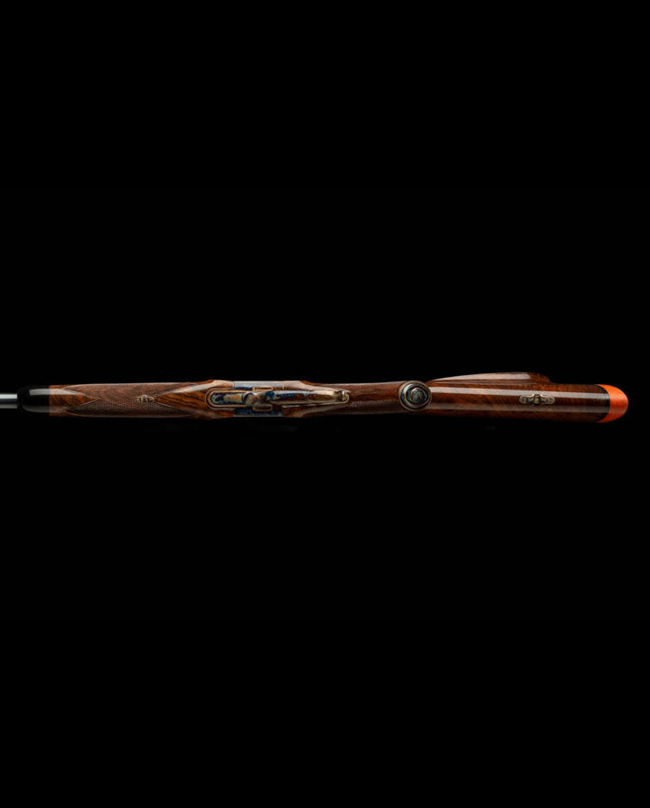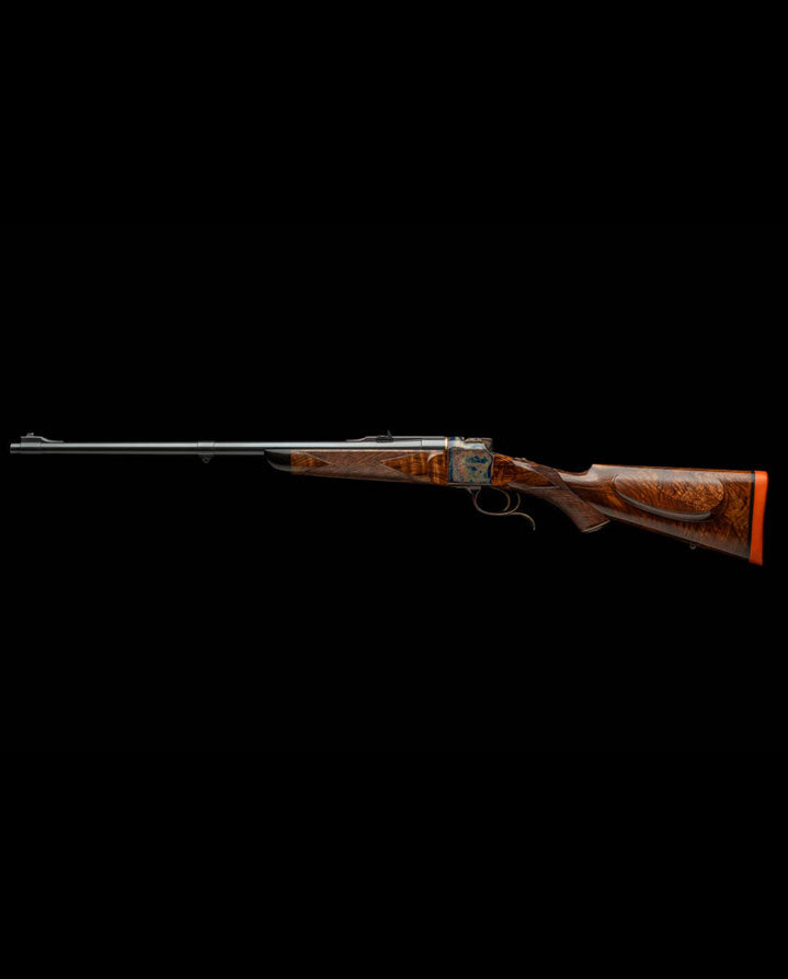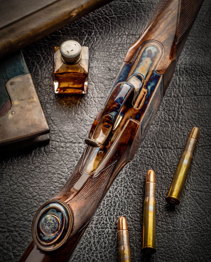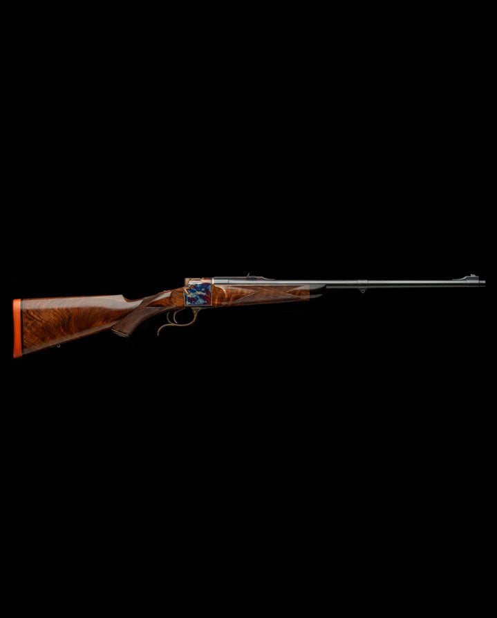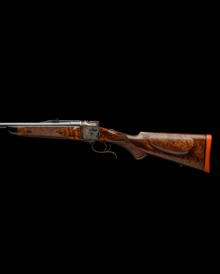 The finish is top class throughout, with the aesthetic of a purposeful hunting rifle. Sparse engraving but first rate where it is found, a well figured walnut pistol-hand stock with steel grip cap. Fully colour-case-hardened throughout.