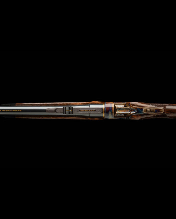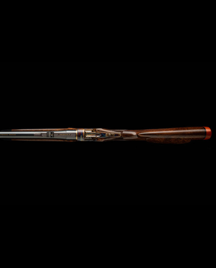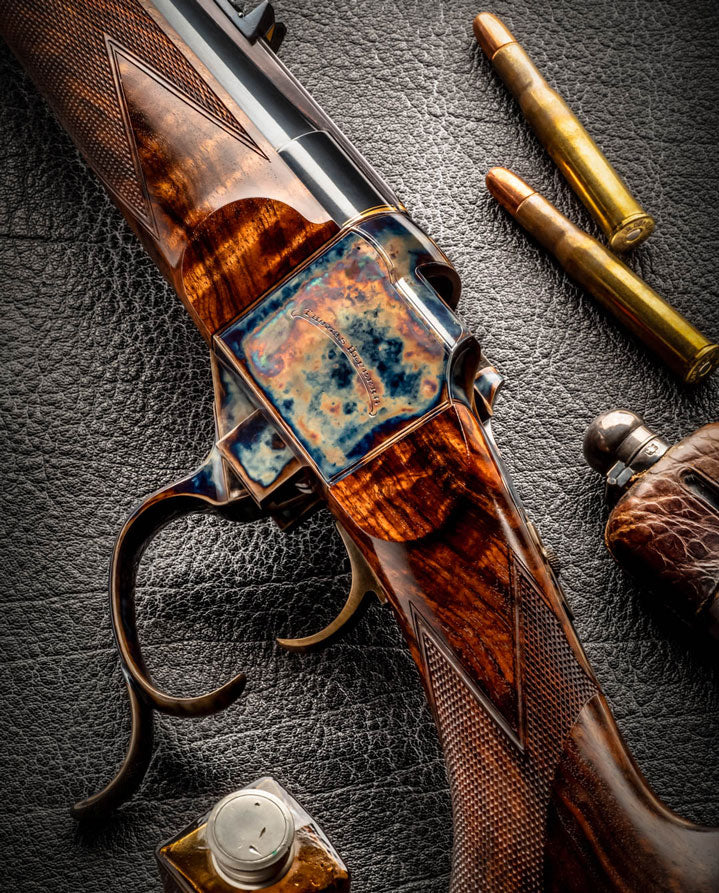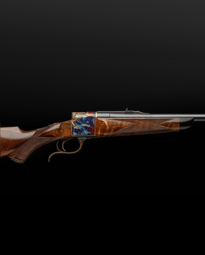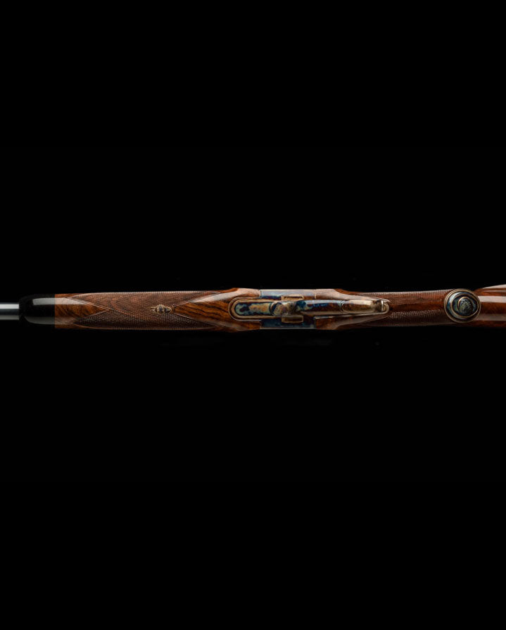 The finish is top class throughout, with the aesthetic of a purposeful hunting rifle. Sparse engraving but first rate where it is found, a well figured walnut pistol-hand stock with steel grip cap. Fully colour-case-hardened throughout.
