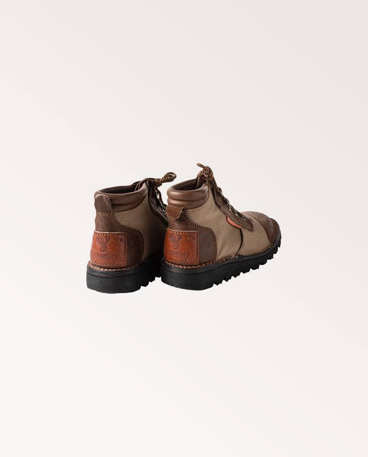 Safari is Swahili for 'long journey' and this four inch ankle boot with low soft Impala leather collar and tongue is designed for just that. This new style of Courteney Safari boot in canvas is a brilliant lightweight alternative, featuring the same robust hand crafted construction, speed lacing and natural rubber tyre tread sole.