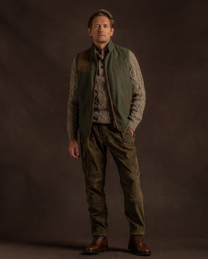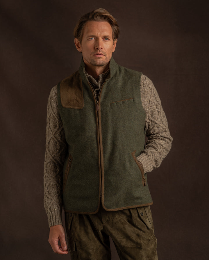 The Habsburg Drasing Shooting Waistcoat combines refined Austrian tailoring with true sporting functionality. Expertly crafted from premium materials, it features a traditional shooting shoulder patch for enhanced comfort and control, along with practical front cartridge pockets for convenience in the field.