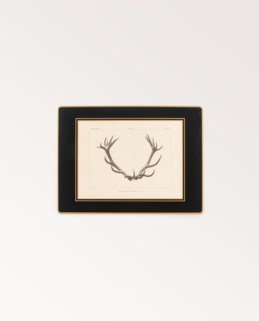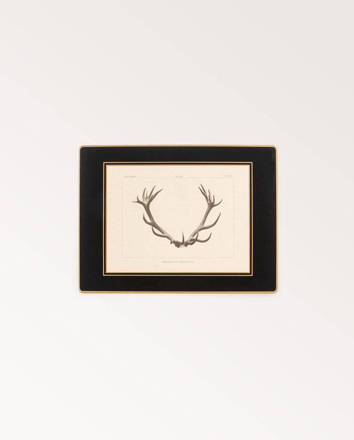 These unique antler prints are part of a set of thirty prints first published in Leipzig in 1891. Handmade exclusively for Westley Richards in England this handsome set of 4 mats is finished with a durable, heat-resistant lacquer, making them easy to clean. The edges of the mats are hand gilded and finished with a flocked back.