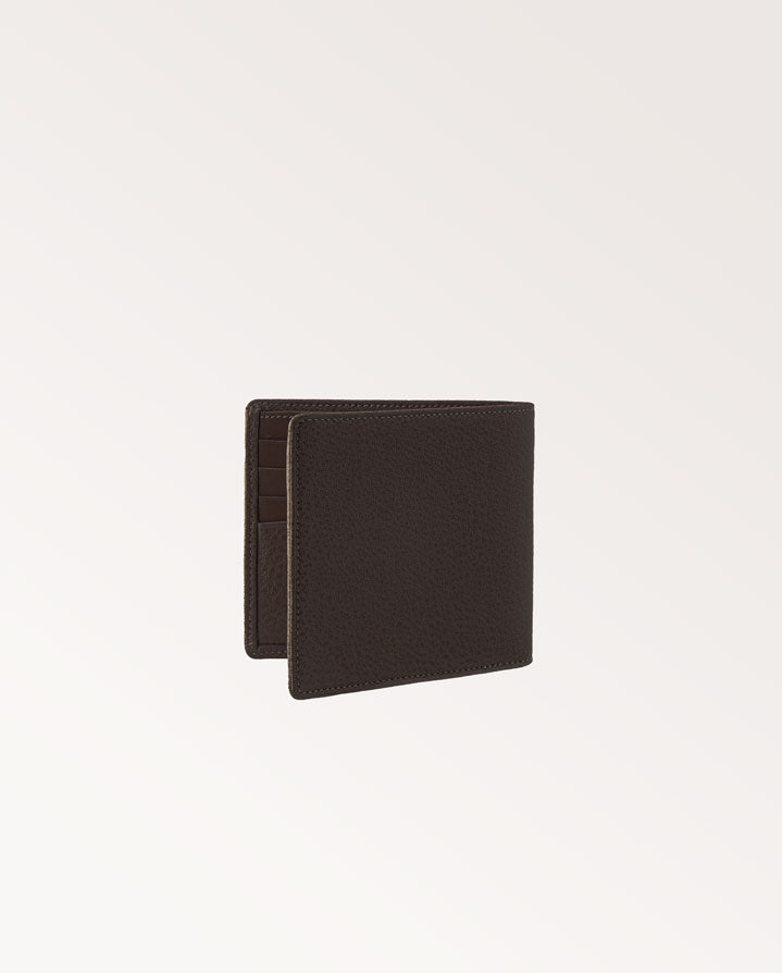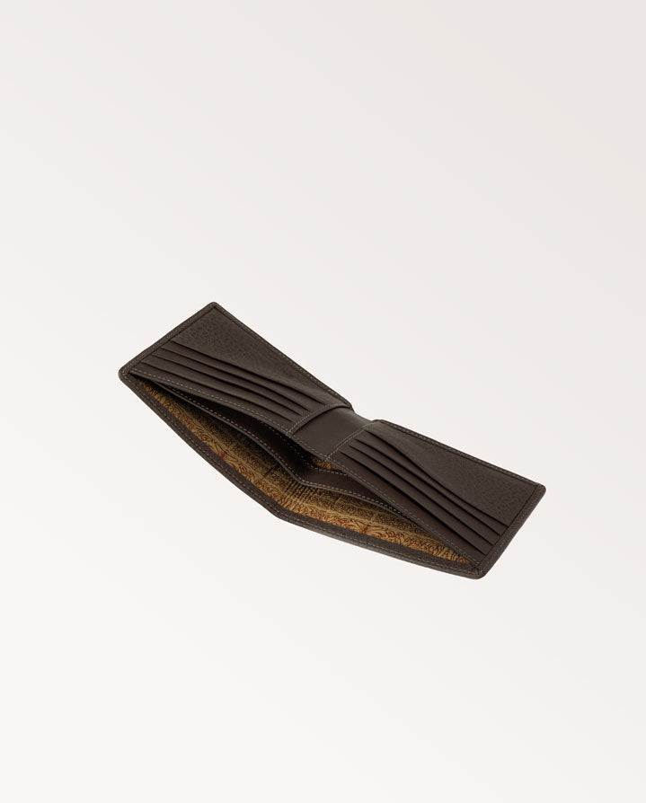 Our Aston Billfold Wallet combines buffalo and smooth traditional dark-tanned leathers. It is made up of 8 interior card slots, 2 large gusset note holder, lined with a bespoke Westley Richards engraving design and finished with our Westley Richards classic motif, in blind. This exclusive leather gains patina quickly and was selected for its ability to last for generations when used for our wallets.