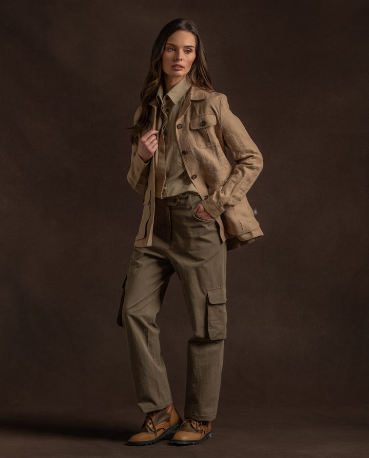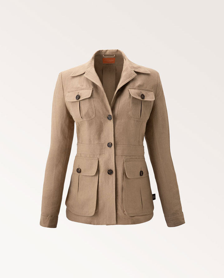 Indulge in timeless elegance with the Ladies Linen Safari Jacket, proudly crafted in England. Imbued with heritage charm and refined sophistication, this jacket seamlessly blends classic safari-inspired design with luxurious linen fabric. Its tailored silhouette exudes understated grace, while the breathable linen ensures comfort and versatility, making it ideal for both outdoor pursuits and urban escapades.