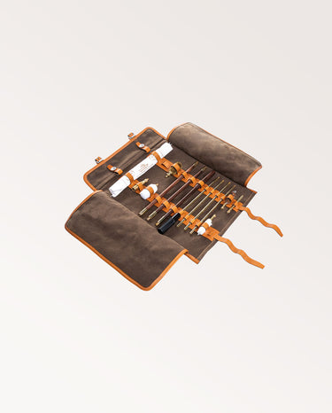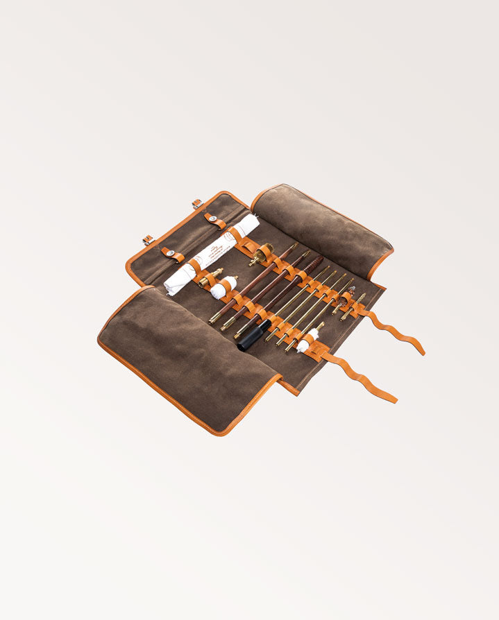 This useful tool roll including cleaning rods and brushes (shown in image) is our modern reproduction of a classic piece of kit. Originally used by the Swiss Army and packed with all of their essential tools, our spin on the old classic has been made to fit all the accessories needed to care for your gun.
