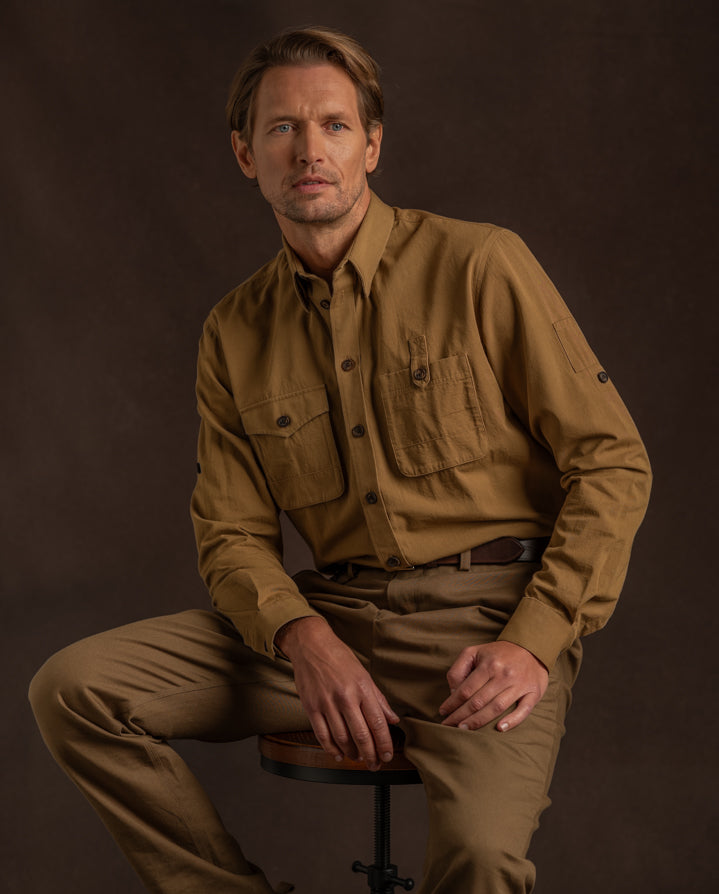 The Tusker Safari Shirt is crafted from lightweight Japanese cotton that has been washed and sun-dried for a vintage, lived-in feel. The material offers a soft, wearable texture that only improves with time and is ideal for any adventure.
