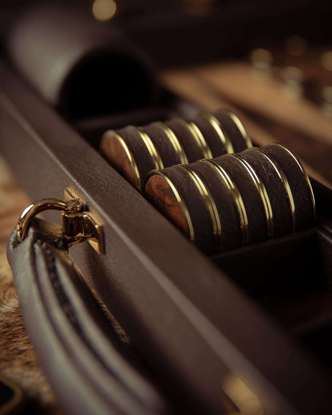 The Westley Richards Backgammon set is beautifully created in large format with a buffalo-hide covering and a board surface of burr walnut and birds-eye maple. The ‘men’ (Americans call them ‘checkers’) are gilt and leather and there is subtle but distinctive Westley Richards branding on the case.