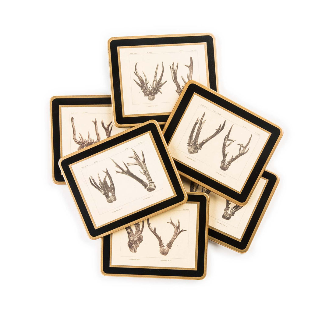 Every glass needs a coaster to prevent it from damaging the table-top. What better companion to our whisky glasses than a set of stag or roe buck antler coasters, hand made especially for Westley Richards in England, using antler prints first published in Leipzig in 1891?