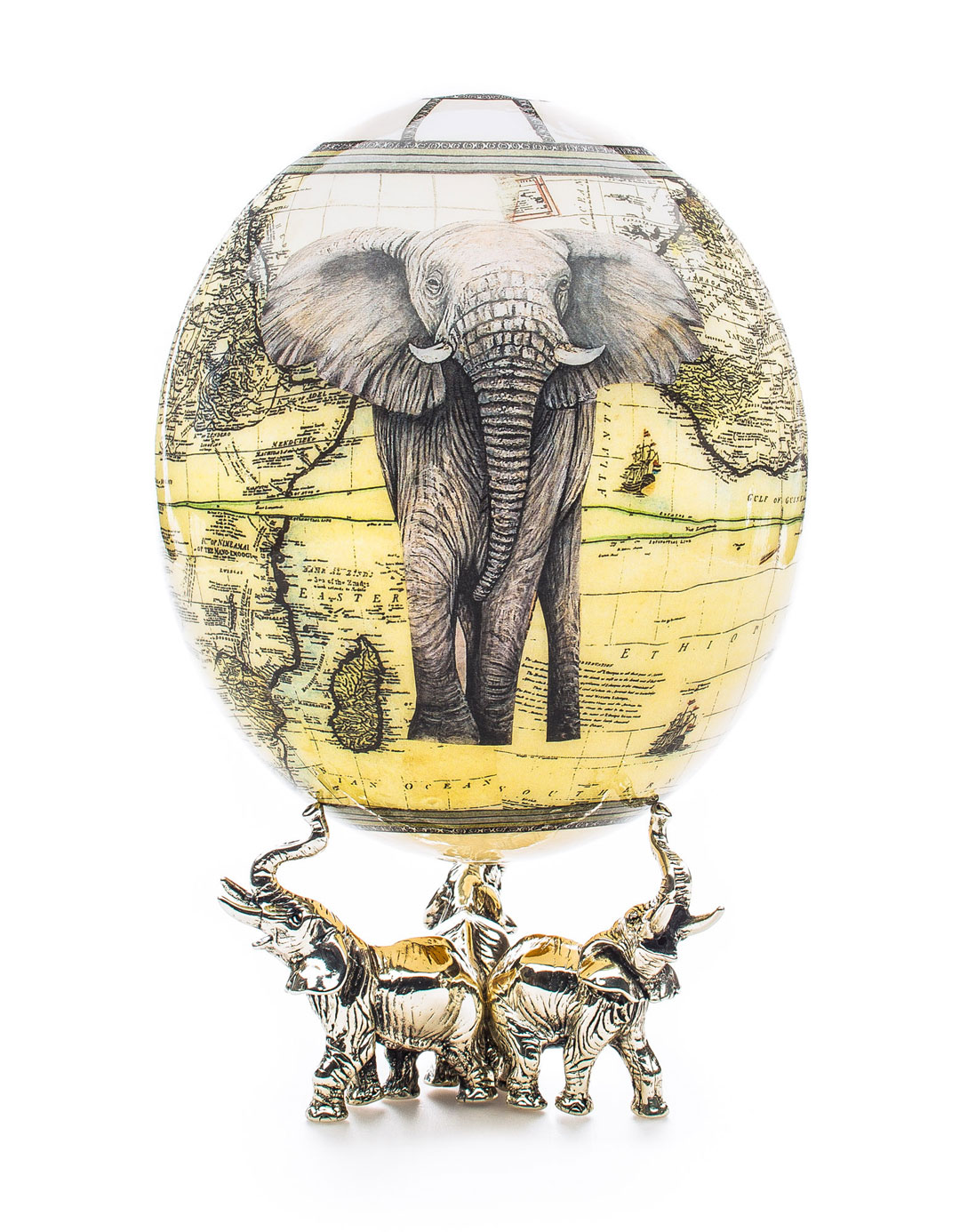 Few objects are as well suited to a hunting inspired room as our Greggio Ostrich eggs with wax-cast silver bases. Each egg is unique, hand decorated in Italy and typically features fifty layers of paint. Designed to provide a different view from every side, our elephant themed egg morphs into an antique map of Africa and stands on a silver base of three bull elephants.