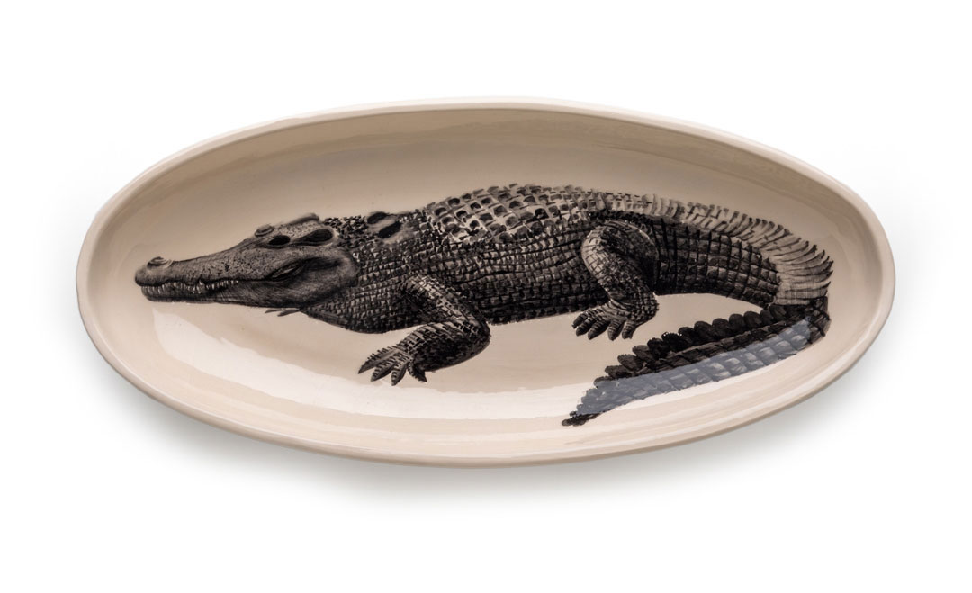 Changing the theme from elephant to crocodile, our large hand-painted dish featuring a portrait of one of these living dinosaurs makes an ideal serving dish for the dinner table or a receptacle for keys or pens in the office. Each one is uniquely hand-crafted and painted in Tunisia, exclusively for Westley Richards.