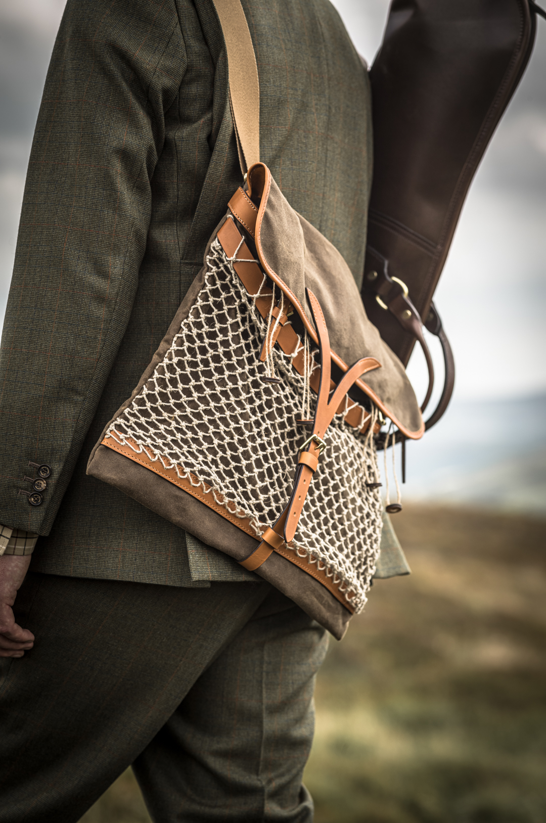 It features the very best vegetable-tanned leather straps and edging, with best canvas panels and shoulder strap and hand-woven hemp netting. The net pocket enables shot game to cool in the air as it is carried, rather than sweating in a sealed pocket. In addition, it has four loops for hanging shot game, maximising the cooling opportunity.