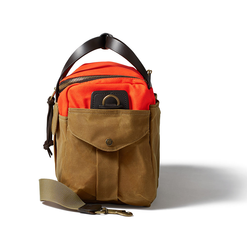 Durable and functional Sportsman Bag comes with features inspired by Filson's best-selling hunting jackets. Front outer pocket, 2 end pockets with 2-finger snaps. Double back pocket, 1 with game bag-style opening. Spacious main compartment with 2 snap-out panels to divide the space into halves or thirds as needed (to separate dirty clothes from clean, shoes from towels, etc.). Rust resistant brass fittings, heavy-duty 2-way brass zippers, Genuine Bridle Leather grip.