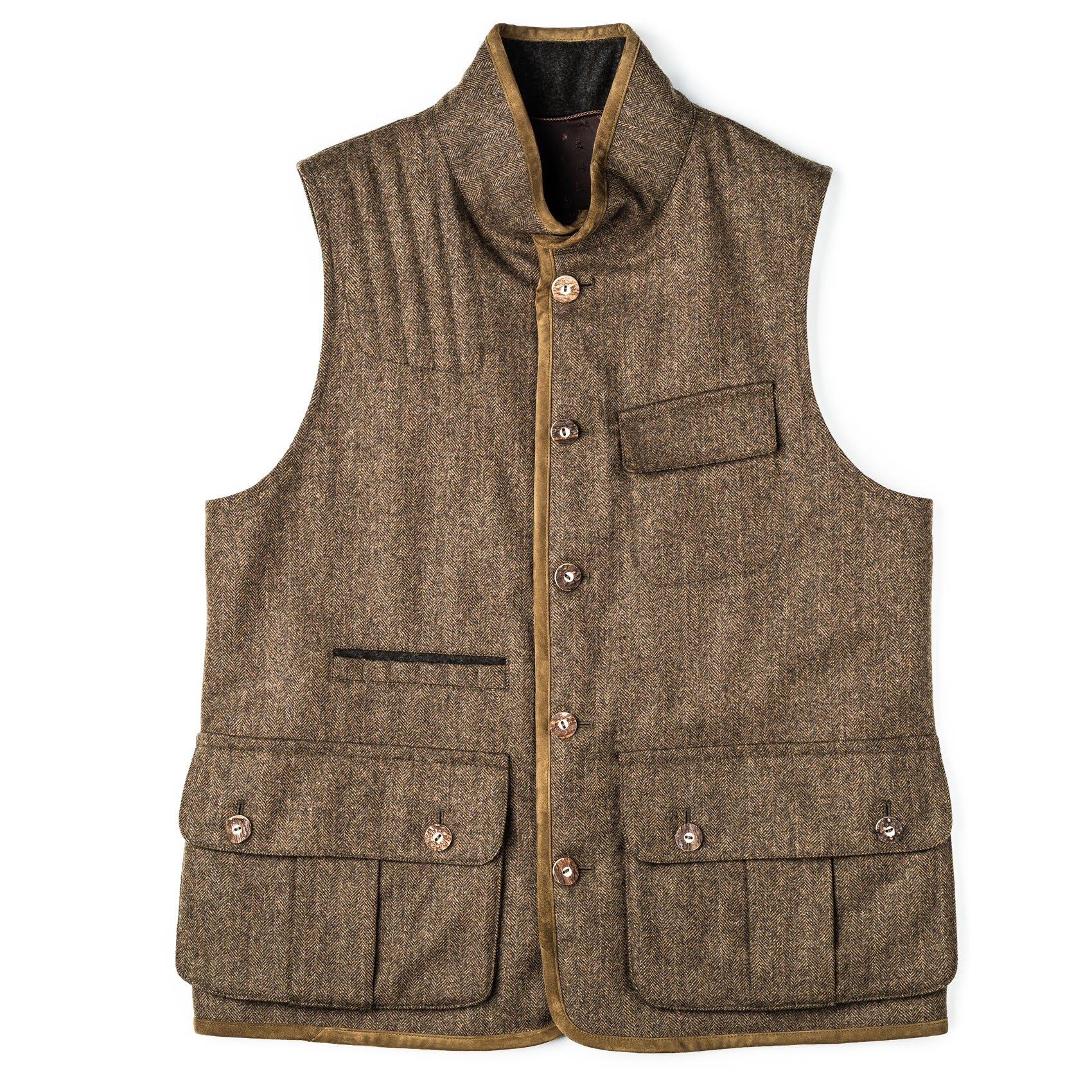The Men's Ambros Herringbone Tweed Waistcoat is the perfect layer for in the field or ruggedly handsome addition over your favourite jumper in the winter. This classic design features real horn buttons, suede details, roomy bellows pockets on the front and a game pocket on the rear.