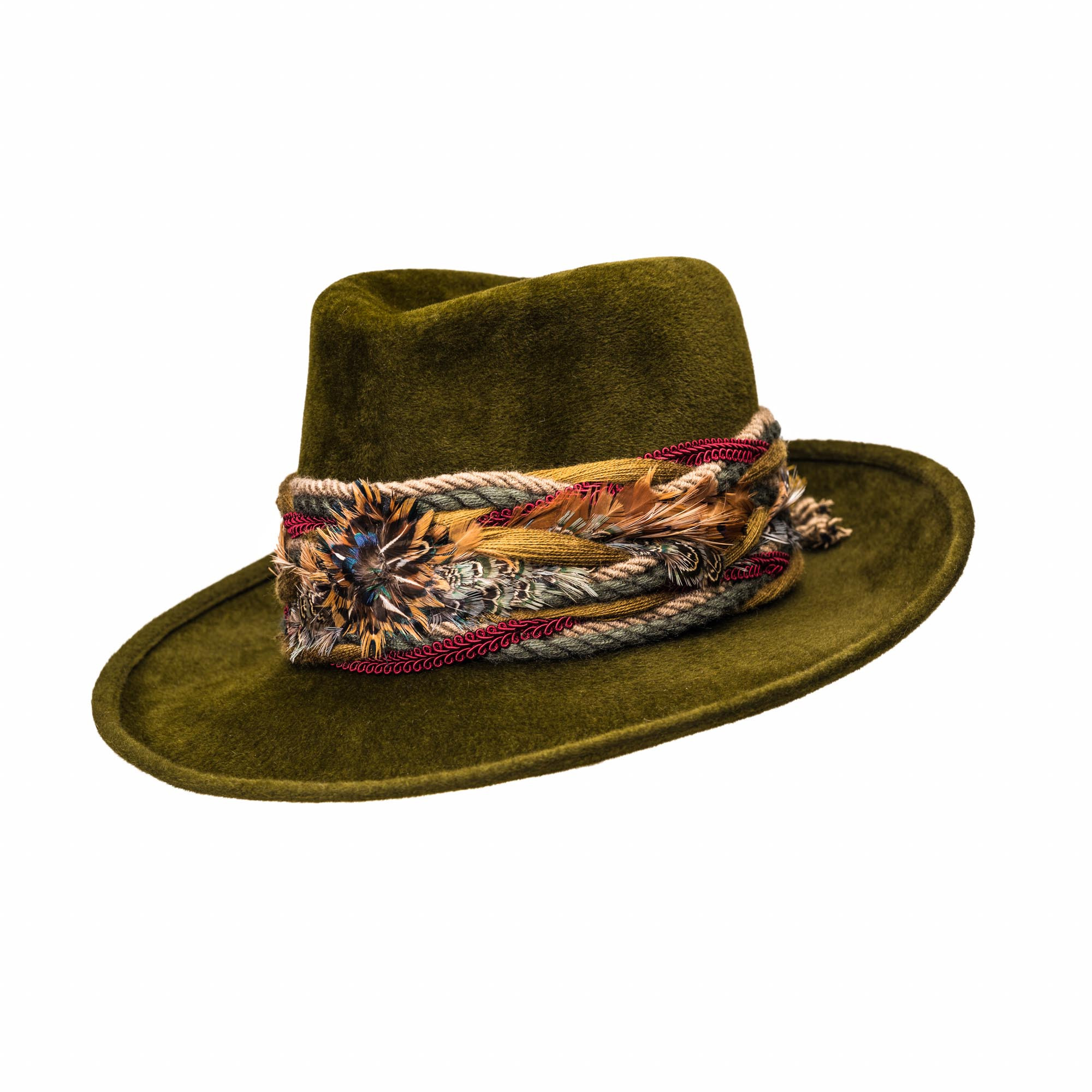 This luxuriously styled hat is made with 100% rabbit fur felt and finished beautifully with colourful ropes and flamboyant feathers that form a gorgeous flower pattern. Lined with T.ba's green grosgrain ribbon no detail has been over looked. This hand made classic is truly is a must have piece.