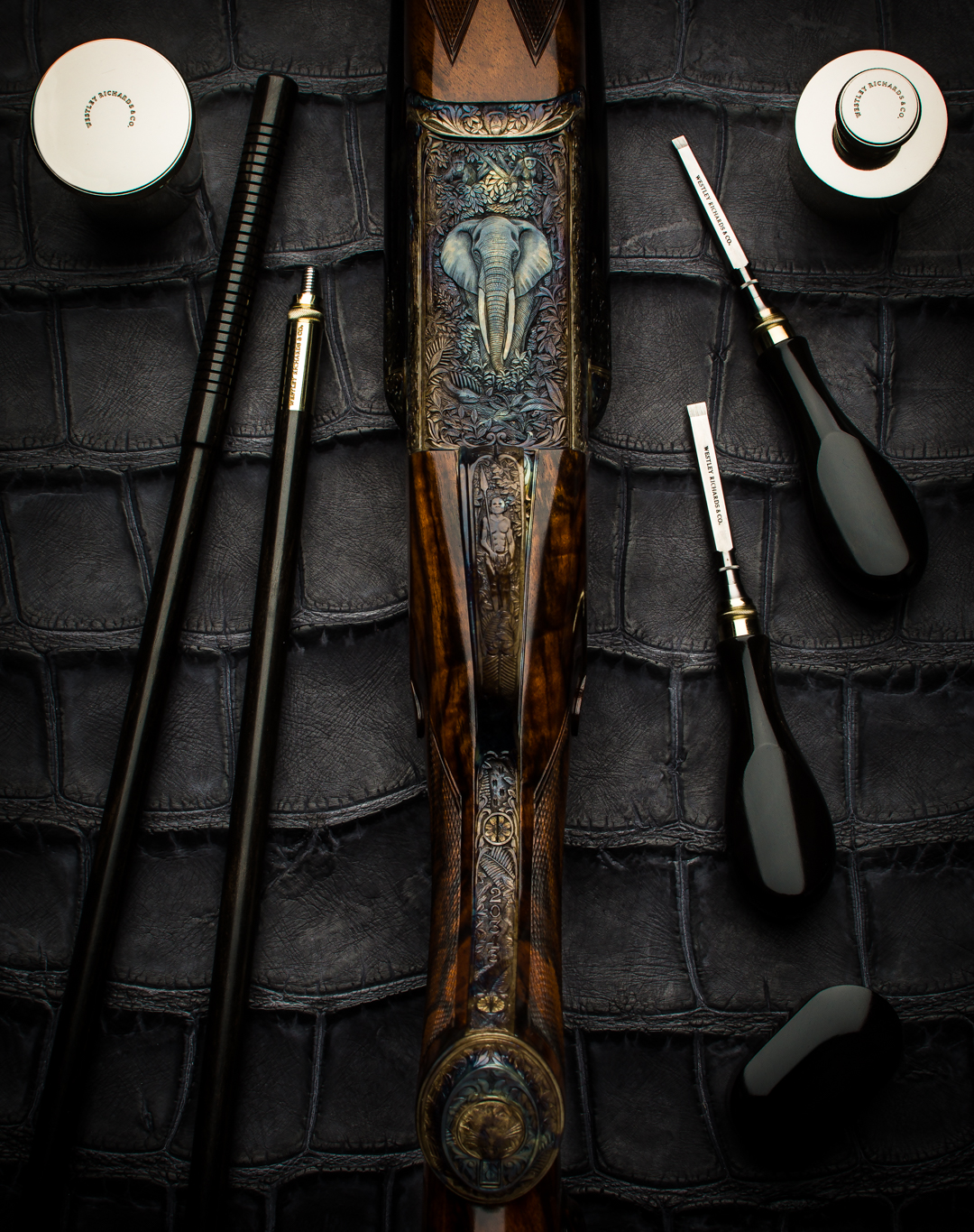 Five years in the making, the forest rifle is engraved by Bradley Tallett to honour the people and beasts of the forests of Central Africa.