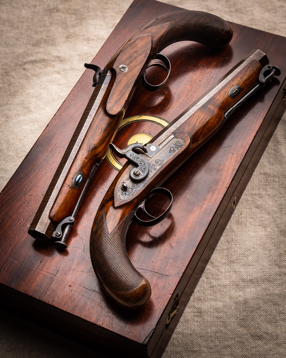 A “boxed” or cased set of pistols like this were a sign of status and they were finished to a very high standard. The locks, hammers, trigger guards and breach blocks are decorated with a traditional acanthus scroll engraving and the maker’s name is engraved on each lock plate.