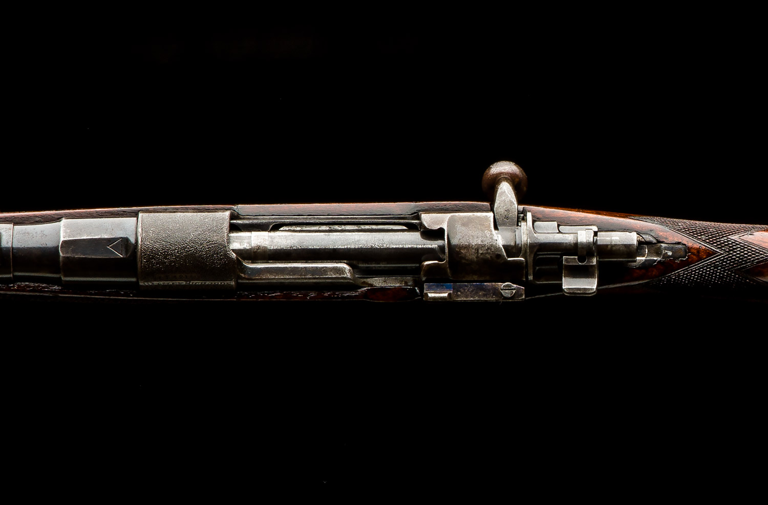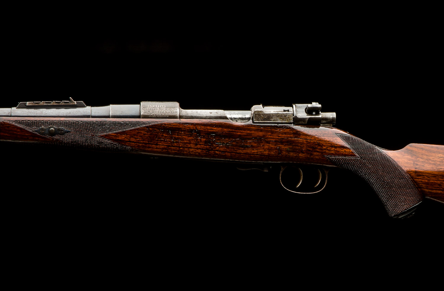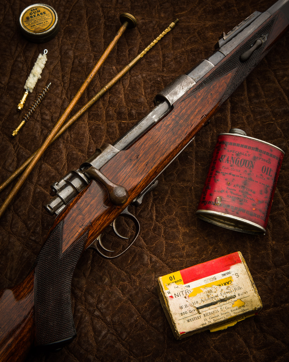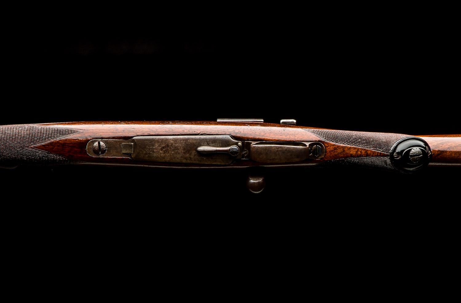 Westley Richards .318 take apart, bolt action rifle. Built for the Earl of Lovelace in 1930 it features a 21" detachable barrel with our combination foresight, barrel band, rear island express sight with one standing sight regulated at 100 yards and four folding leaves regulated to 500 yards. Built on a standard length Mauser action with the original flag safety, chequered horn bolt knob, double set triggers and lever release on the floor plate. Full pistol grip stock with no cheekpiece, sling stud, stock oval, Silvers recoil pad, horn forend tip and barrel release catch. The stock has been pinned and repaired below the action but the rifle remains in good, original condition.