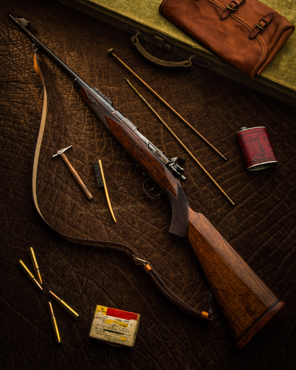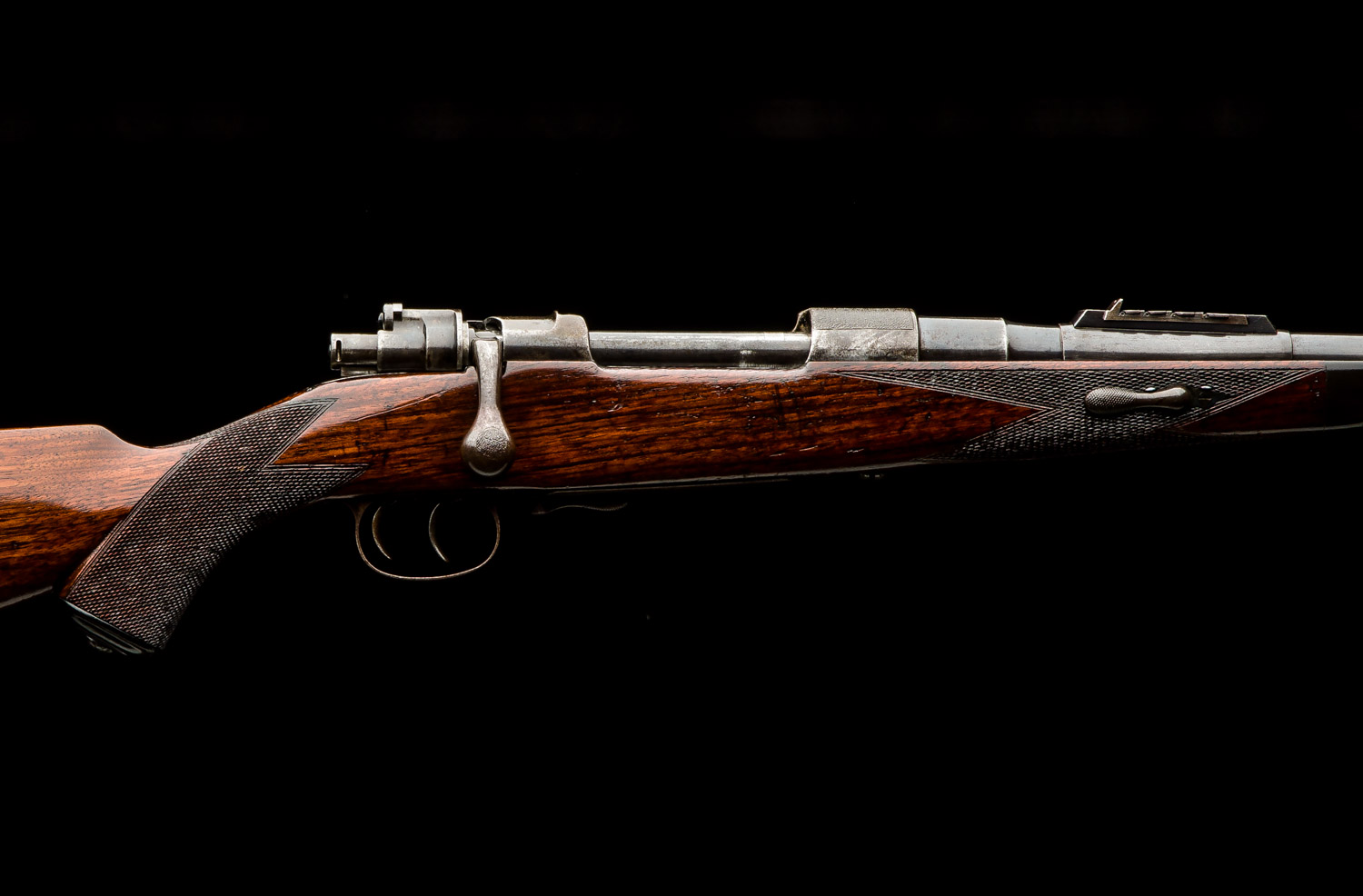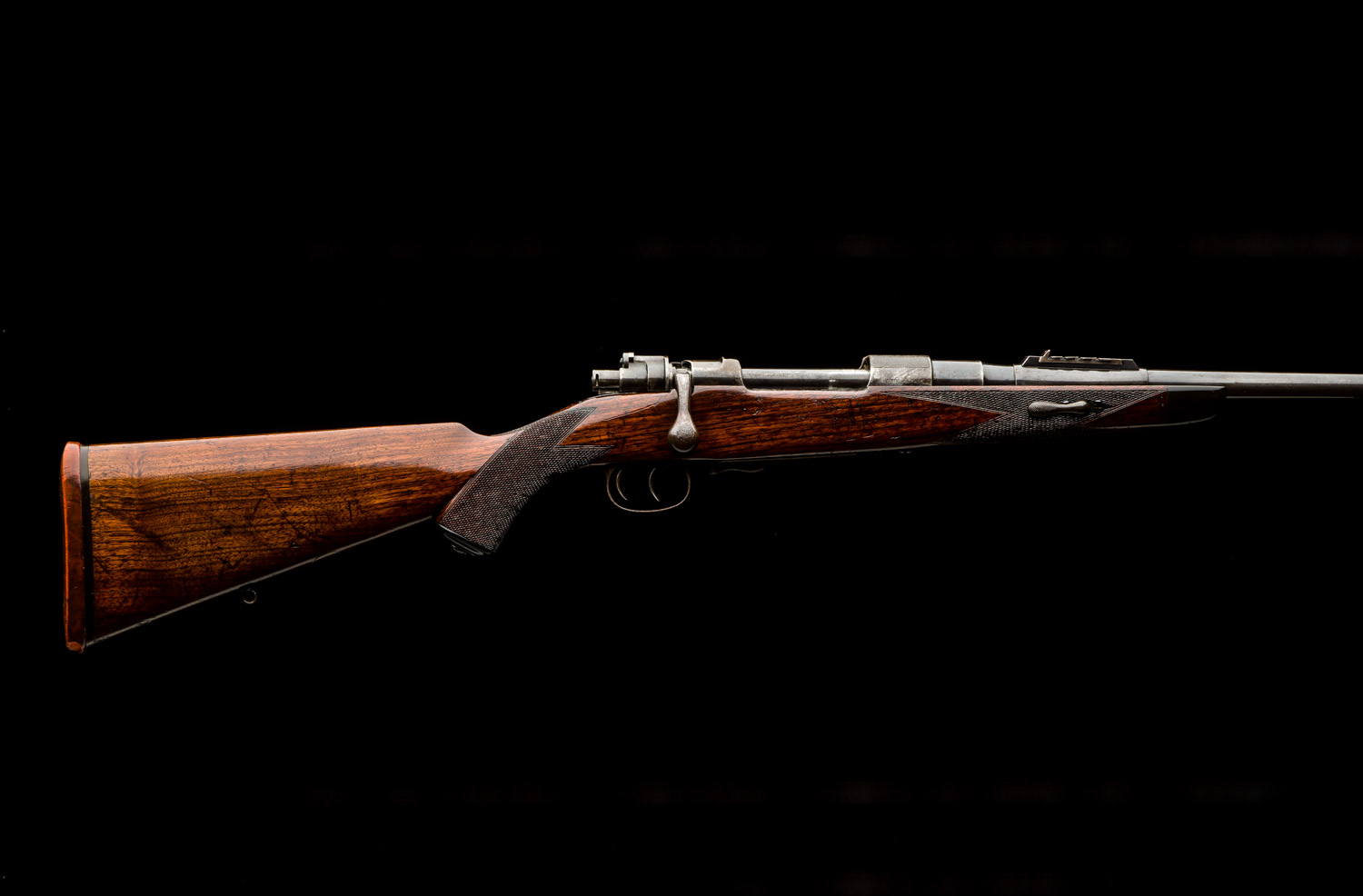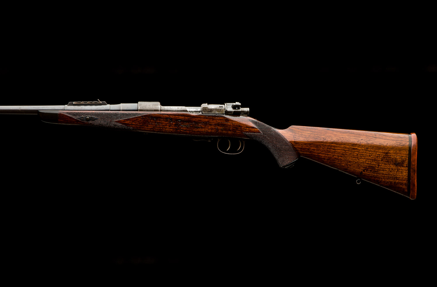 Westley Richards .318 take apart, bolt action rifle. Built for the Earl of Lovelace in 1930 it features a 21" detachable barrel with our combination foresight, barrel band, rear island express sight with one standing sight regulated at 100 yards and four folding leaves regulated to 500 yards. Built on a standard length Mauser action with the original flag safety, chequered horn bolt knob, double set triggers and lever release on the floor plate. Full pistol grip stock with no cheekpiece, sling stud, stock oval, Silvers recoil pad, horn forend tip and barrel release catch. The stock has been pinned and repaired below the action but the rifle remains in good, original condition.