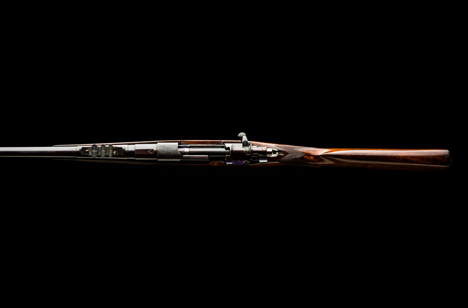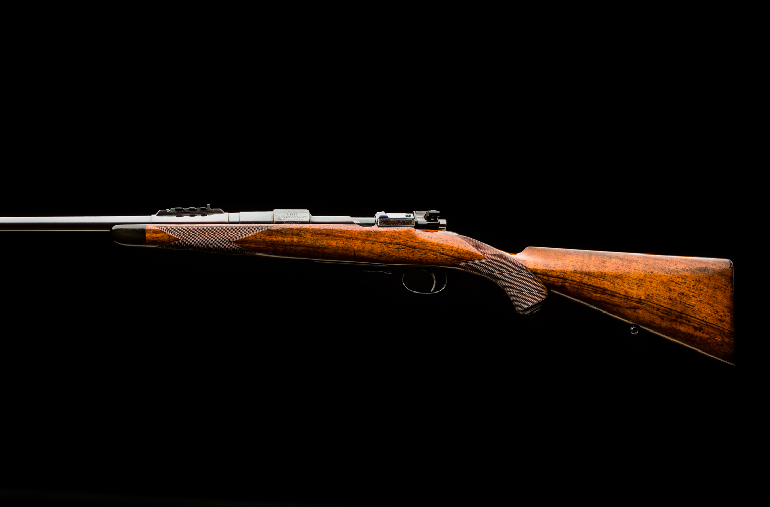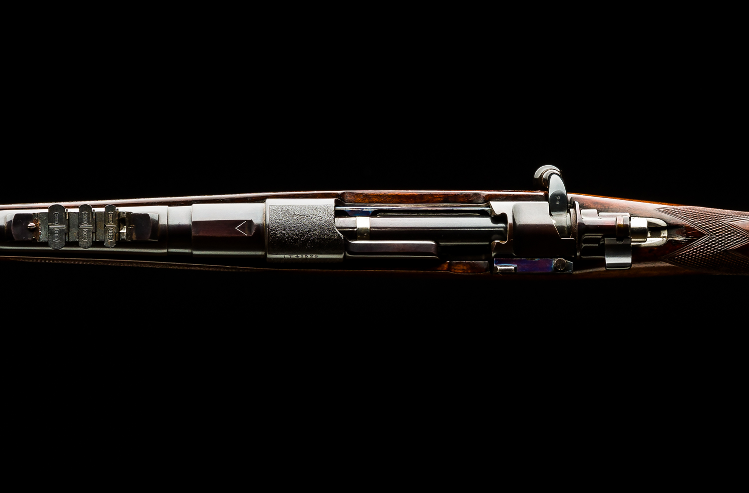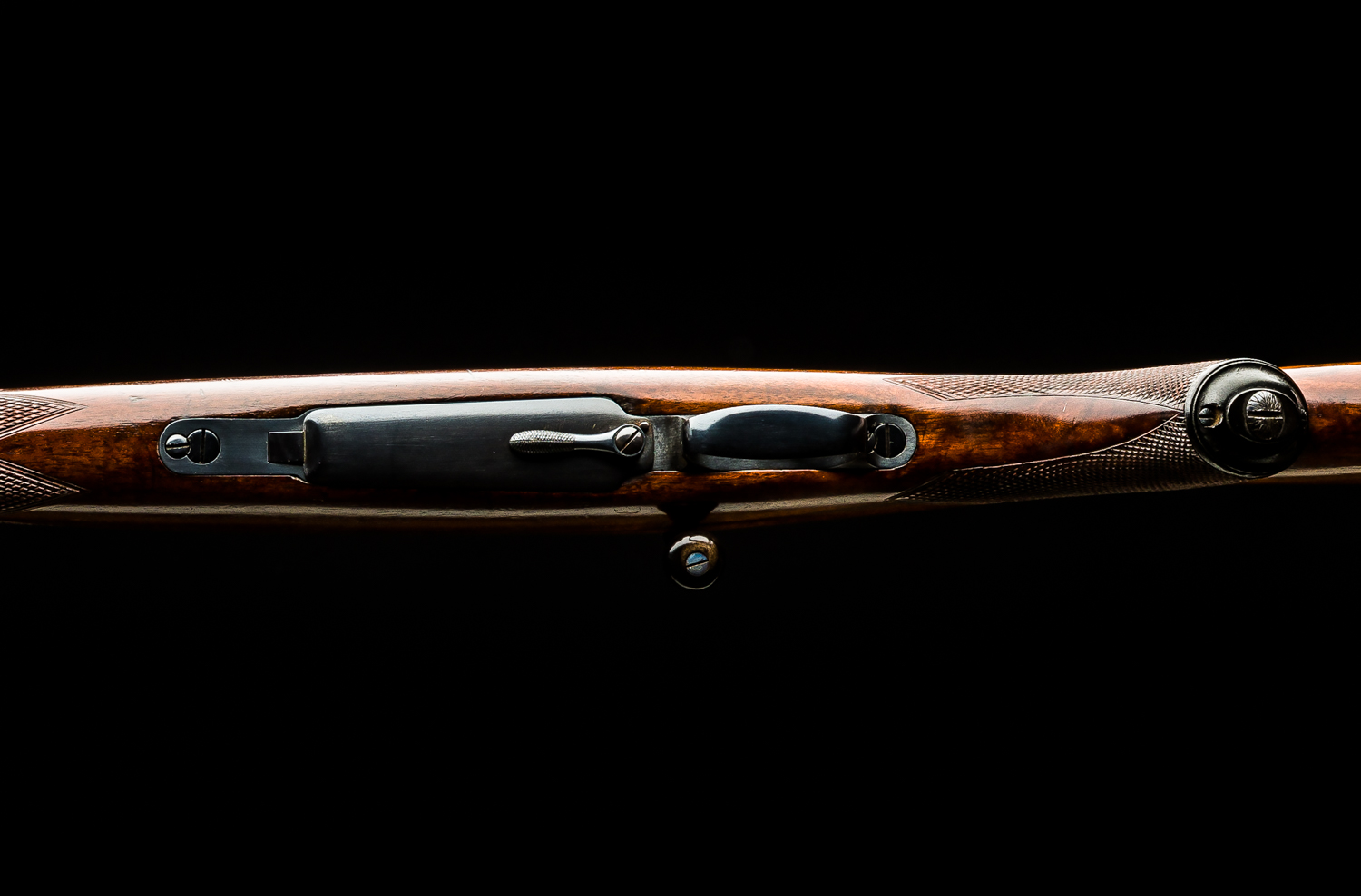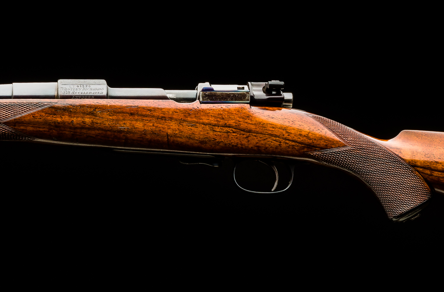 Westley Richards .318 bolt action rifle completed 1928. Built on a standard length Mauser action with flag safety, lever release floorplate and horn bolt knob. 25 1/2" barrel with our combination foresight, sling eye and rear island base with one standing plus three folding leafexpress sight, regulated at 100 - 400 yards. 14 1/2" full pistol grip stock with a steel butt plate with trap, horn forend tip, stock oval, sling stud and grip cap. A superb vintage .318 in very good condition which has spent many years in a private collection.