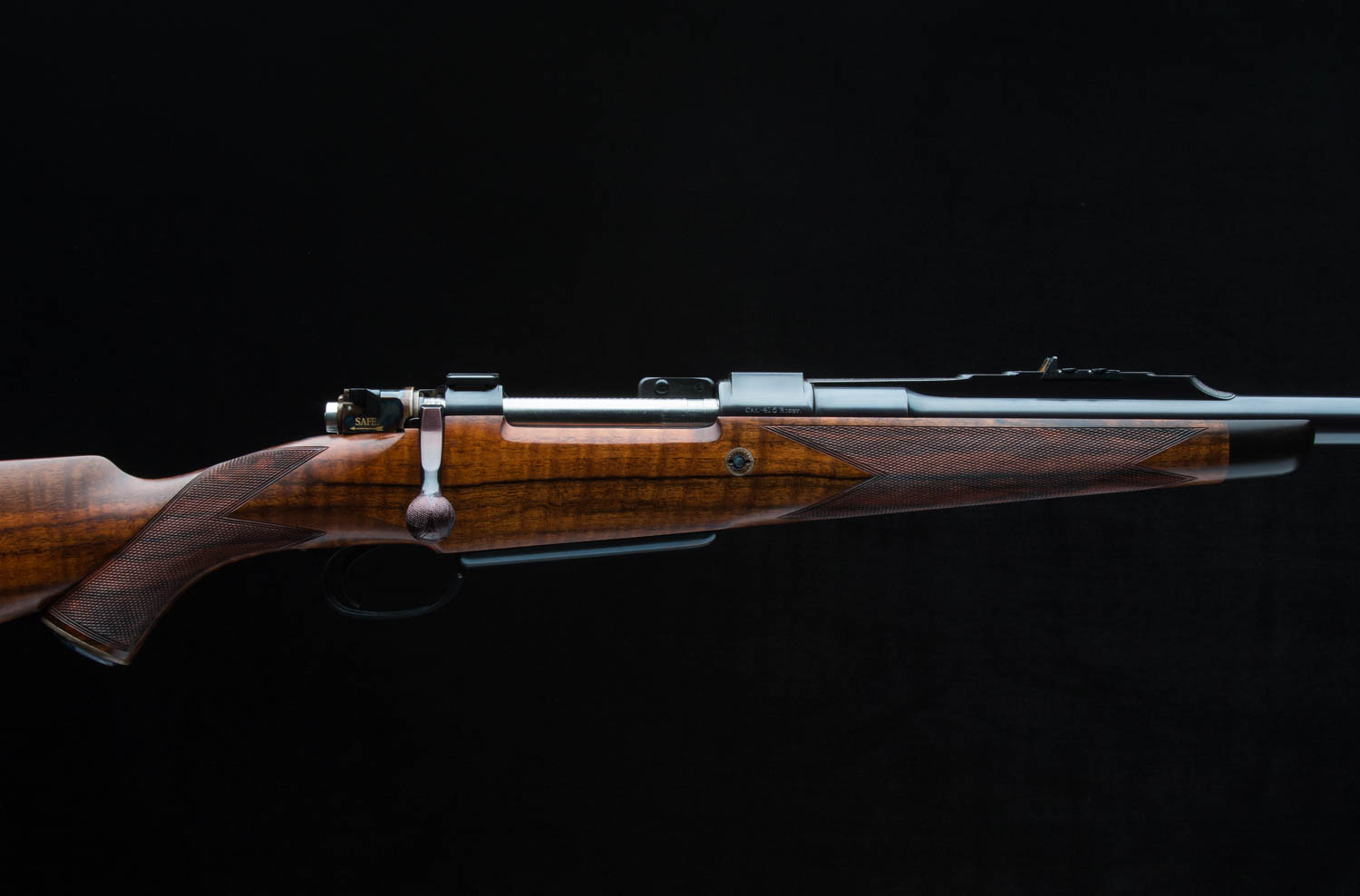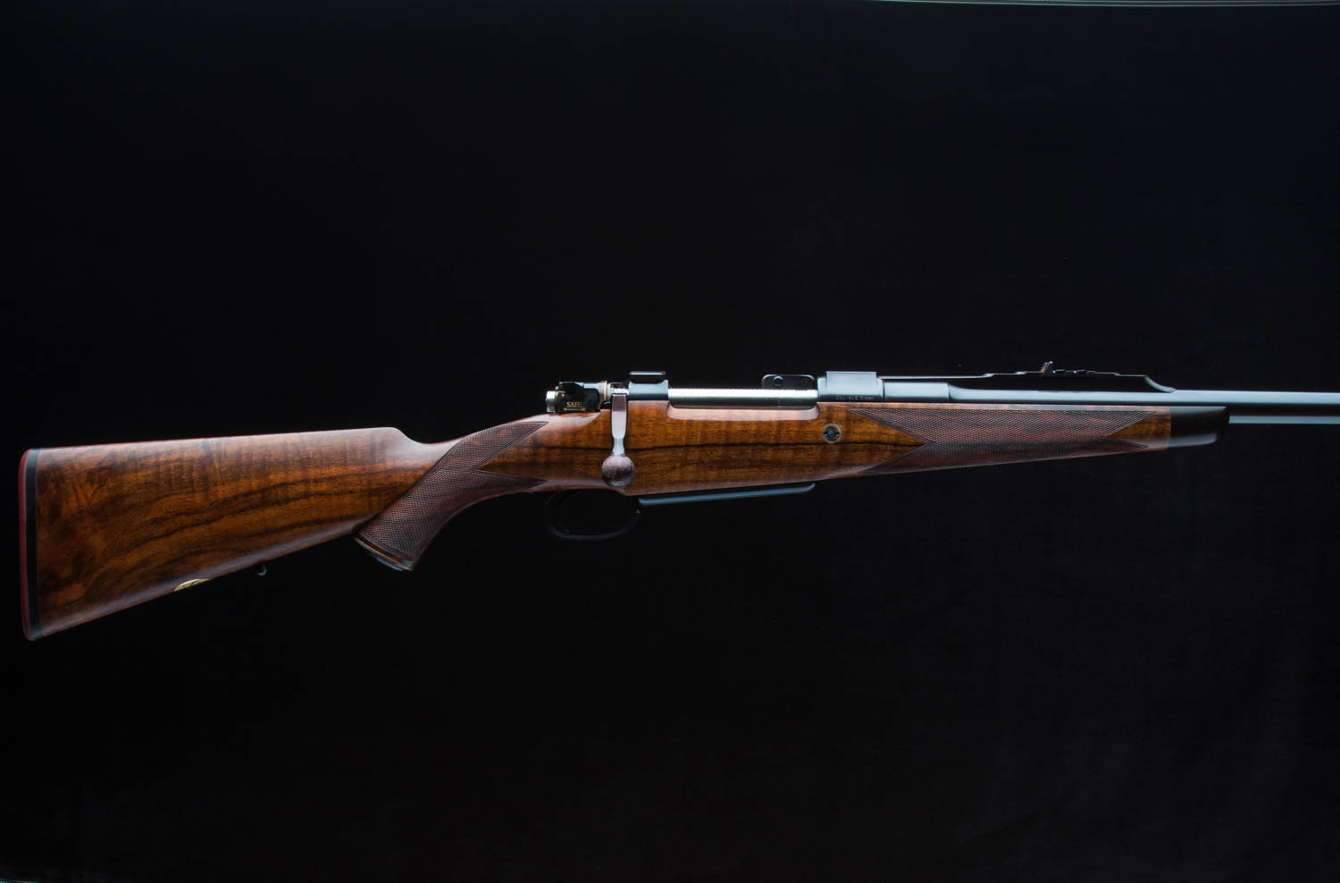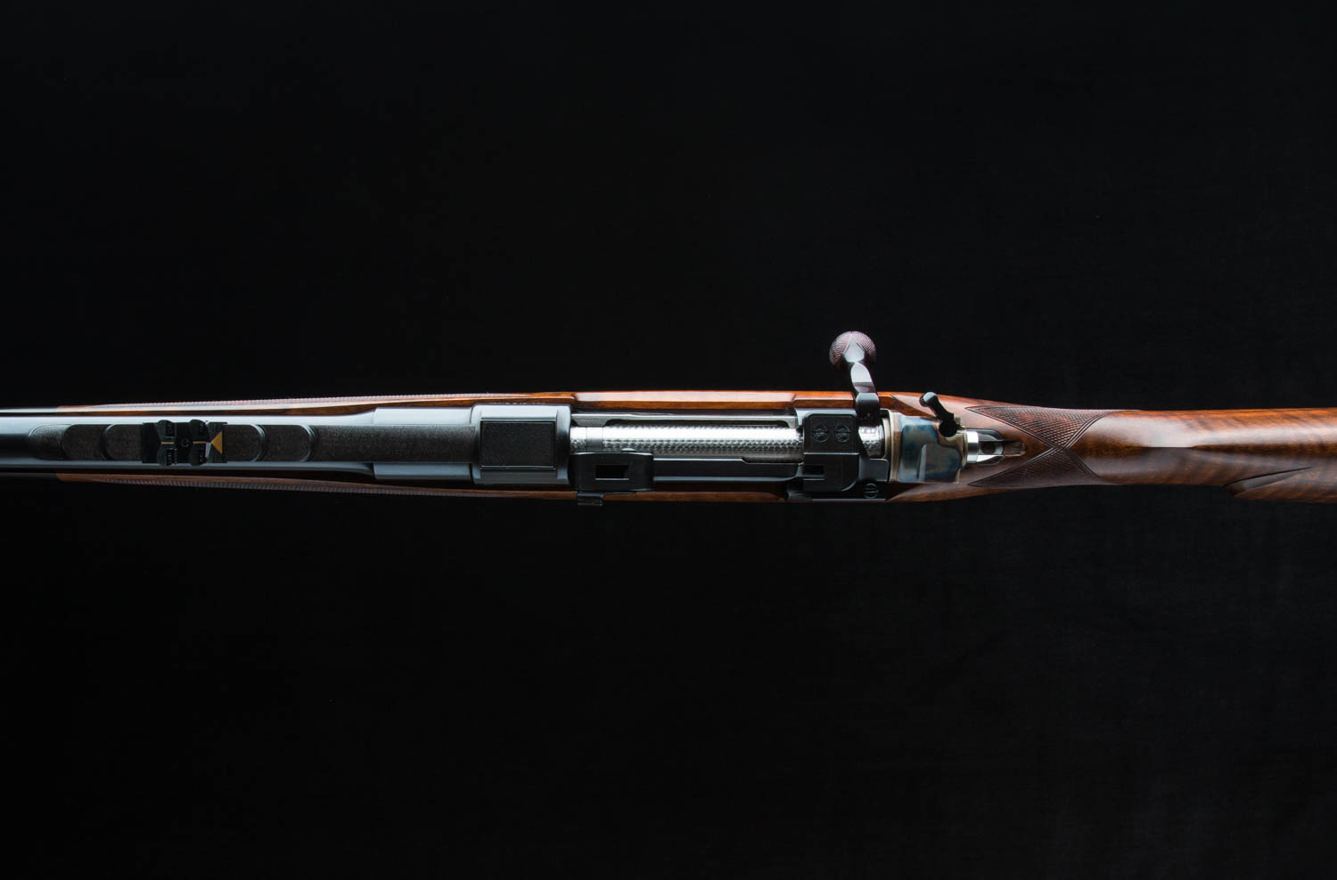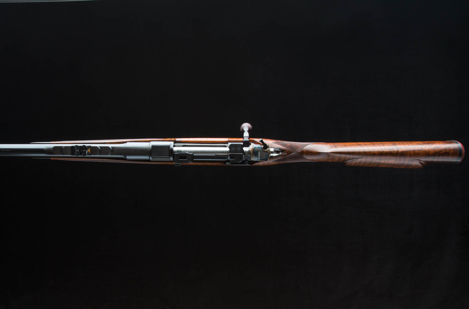 Finished in 2003 and built on a modern magnum length, double square bridge Mauser action with a drop belly straddle floor plate, allowing four rounds down, and an inside the bow release. The action is topped with H&H style quick release mounts and 30mm rings that are properly engraved with the Maker’s name and serial number. The bolt body is jeweled or “spotted”, and the bolt knob is checkered with three panels. The bolt shroud is color hardened with “SAFE” inlaid in gold and is fitted with a Model 70 type, three-position safety.