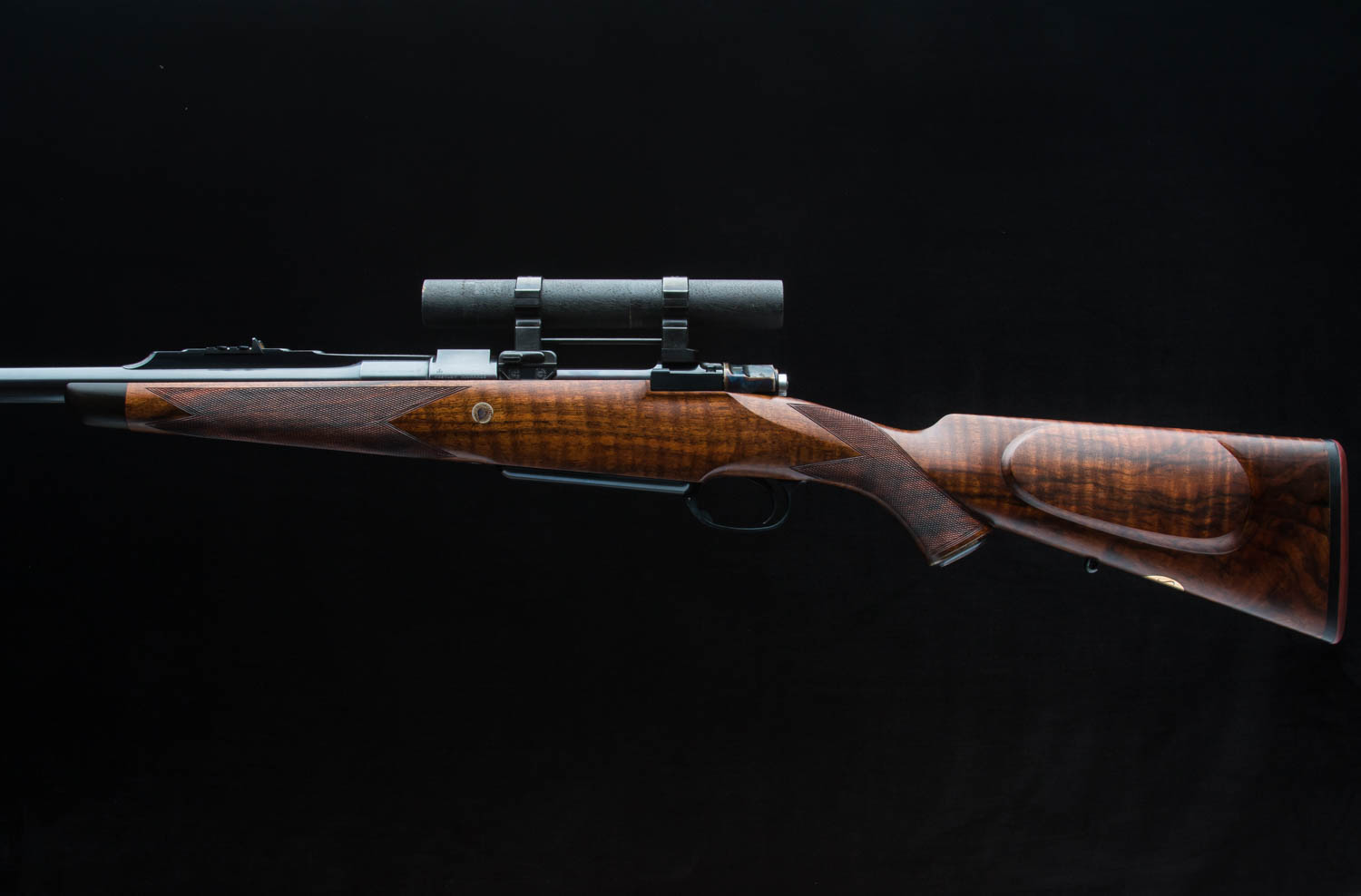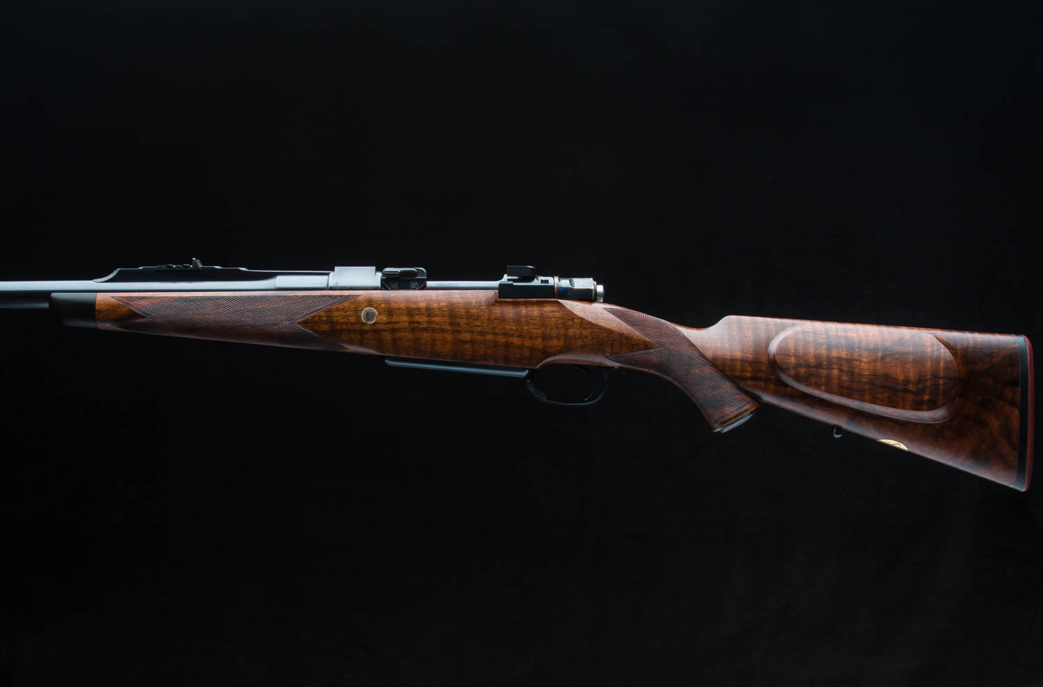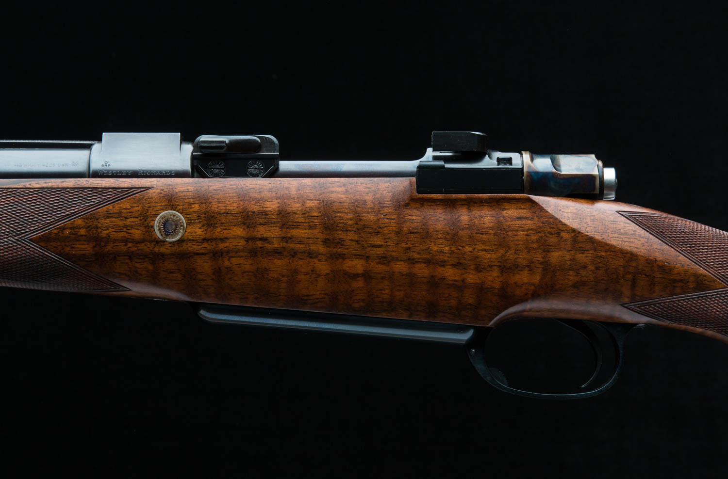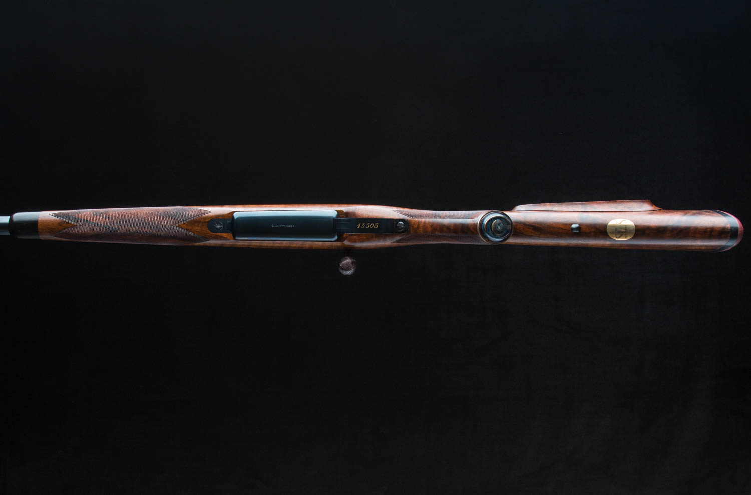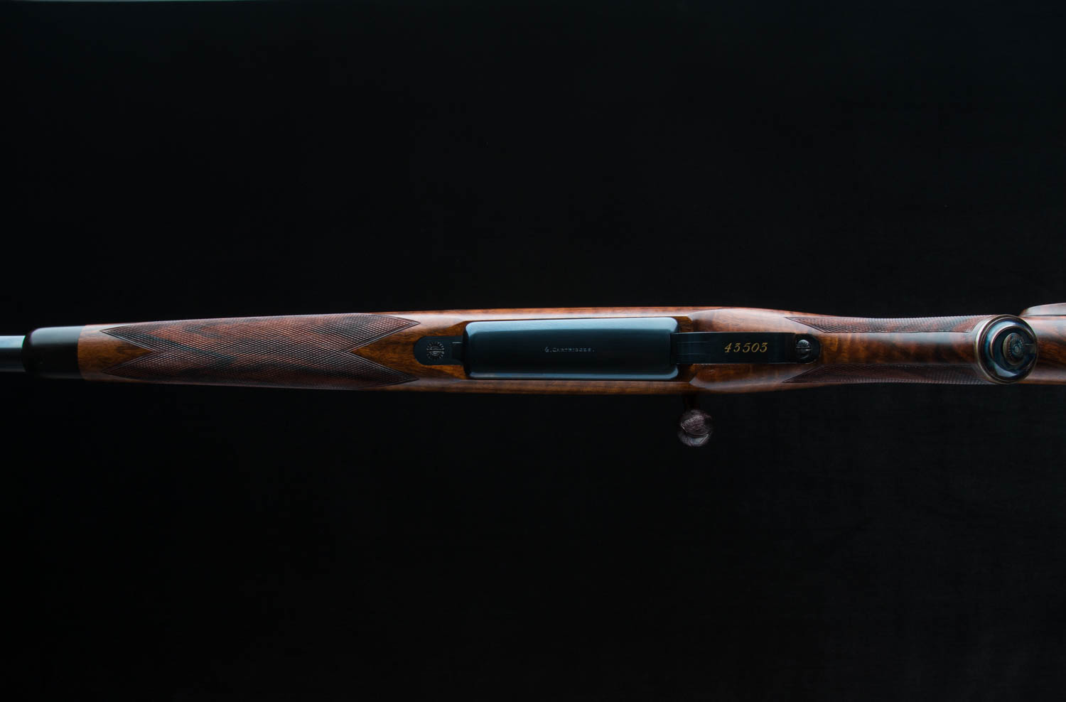The rifle’s action, barrel and bottom metal retain their original black and “4. Cartridges” is engraved on the floor plate. The serial number is inlaid in gold on the trigger bow and the action screws, grip cap and recoil bar have a touch of engraving.