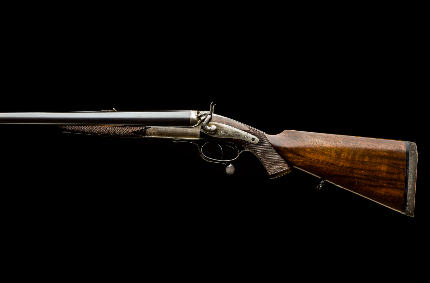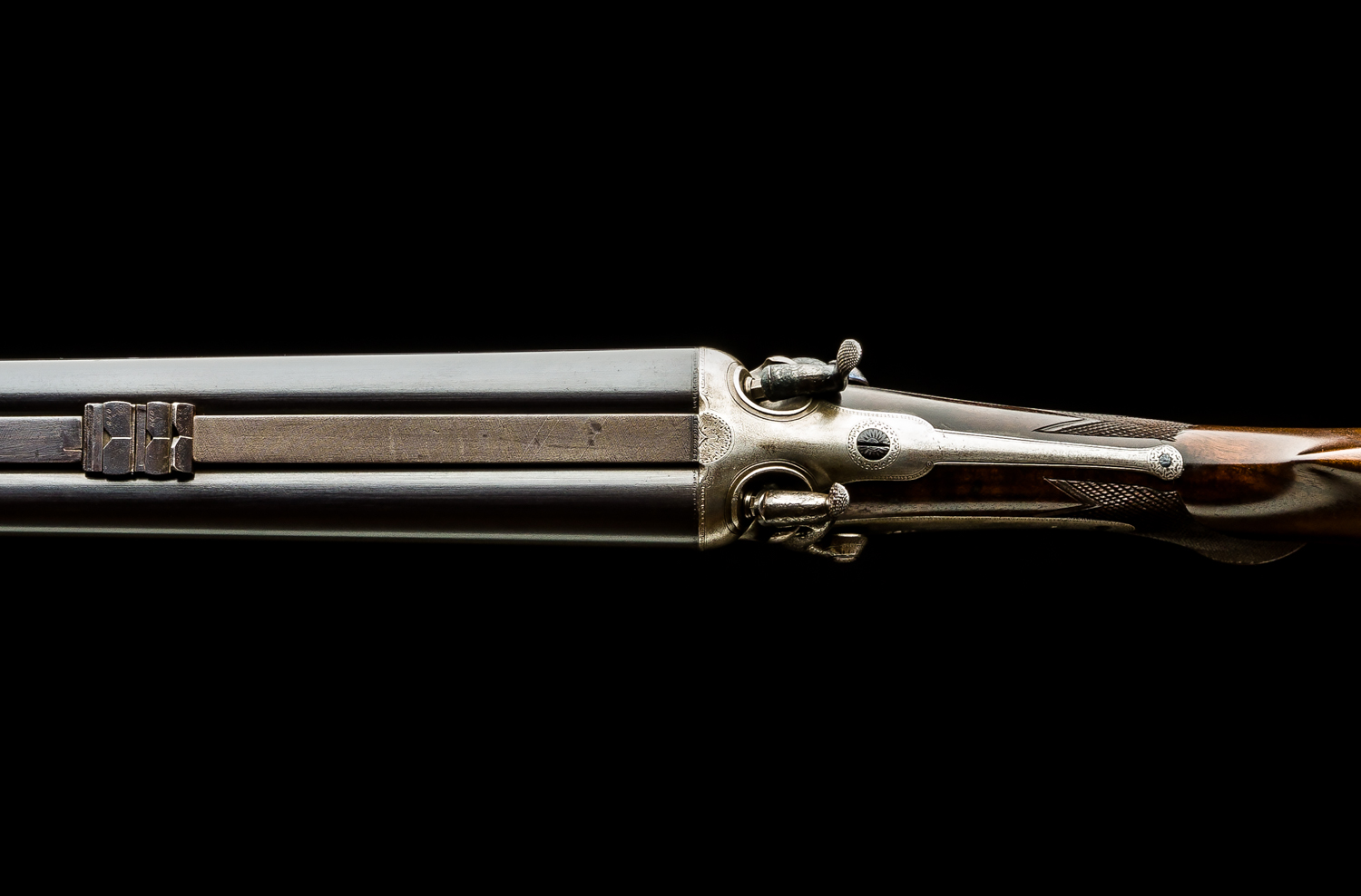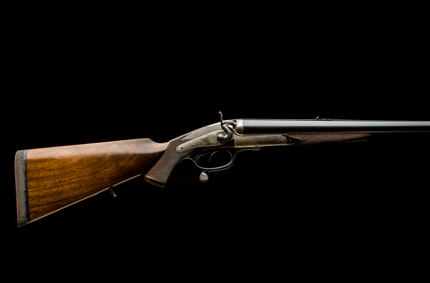 Holland & Holland .577 Black Powder Express double hammer rifle. Non ejector, back action rifle with Jones under lever, extended tang and two triggers. Name and border engraving with 'Charge 6 Drams Case 3 Inches' on the left side of the action, 'Holland & Holland 98 New Bond Street London Winners Of All The Field Rifle Trials London' on the top rib. Holland name engraved on the action. 26" barrels with good bores and full length rib, silver bead foresight and one standing and two folding leaf express sight. 14 1/4" full pistol grip stock with grip cap, cheekpiece, stock oval, sling stud, rubber recoil recoil pad, splinter forend with lever release catch.