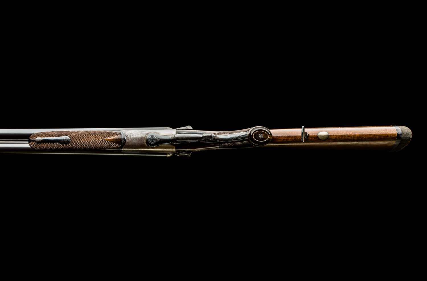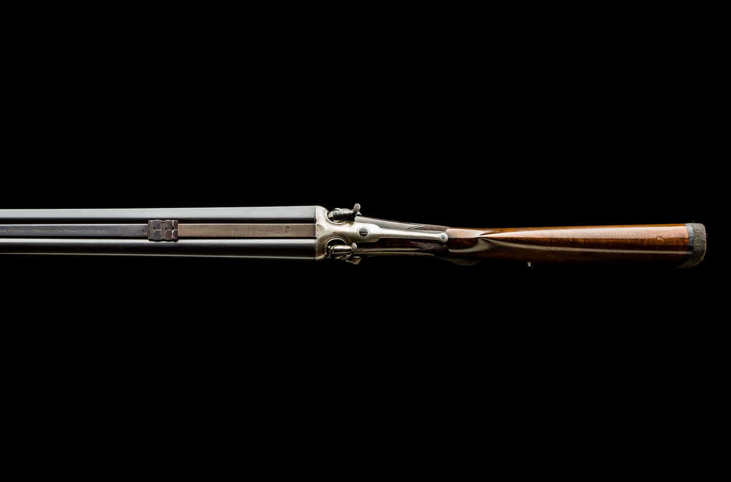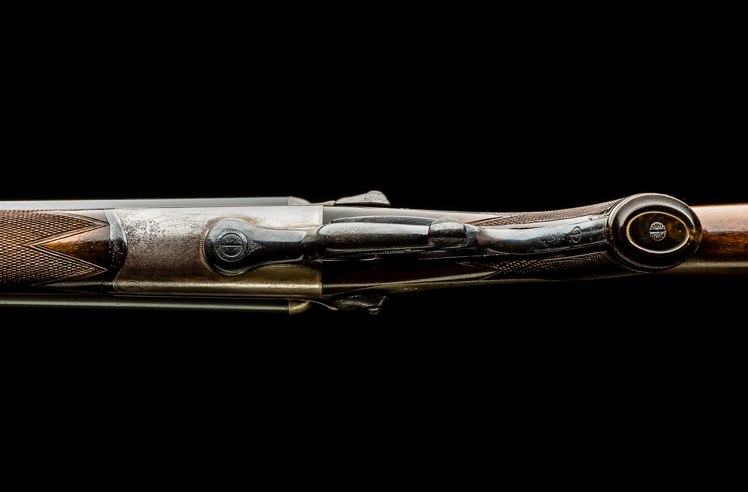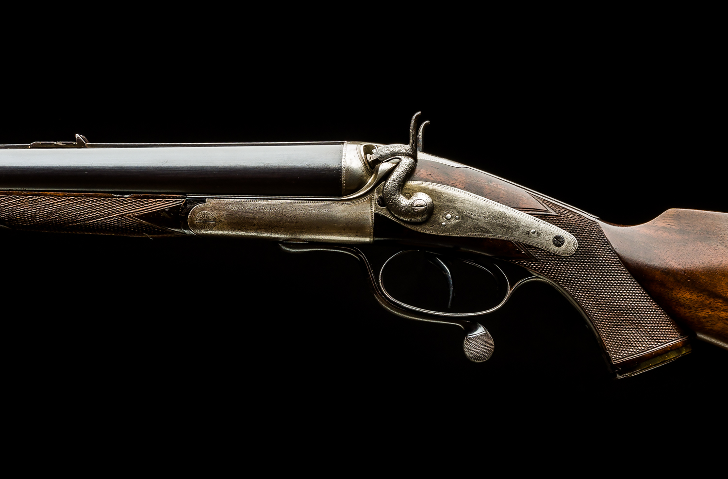 Holland & Holland .577 Black Powder Express double hammer rifle. Non ejector, back action rifle with Jones under lever, extended tang and two triggers. Name and border engraving with 'Charge 6 Drams Case 3 Inches' on the left side of the action, 'Holland & Holland 98 New Bond Street London Winners Of All The Field Rifle Trials London' on the top rib. Holland name engraved on the action. 26" barrels with good bores and full length rib, silver bead foresight and one standing and two folding leaf express sight. 14 1/4" full pistol grip stock with grip cap, cheekpiece, stock oval, sling stud, rubber recoil recoil pad, splinter forend with lever release catch.