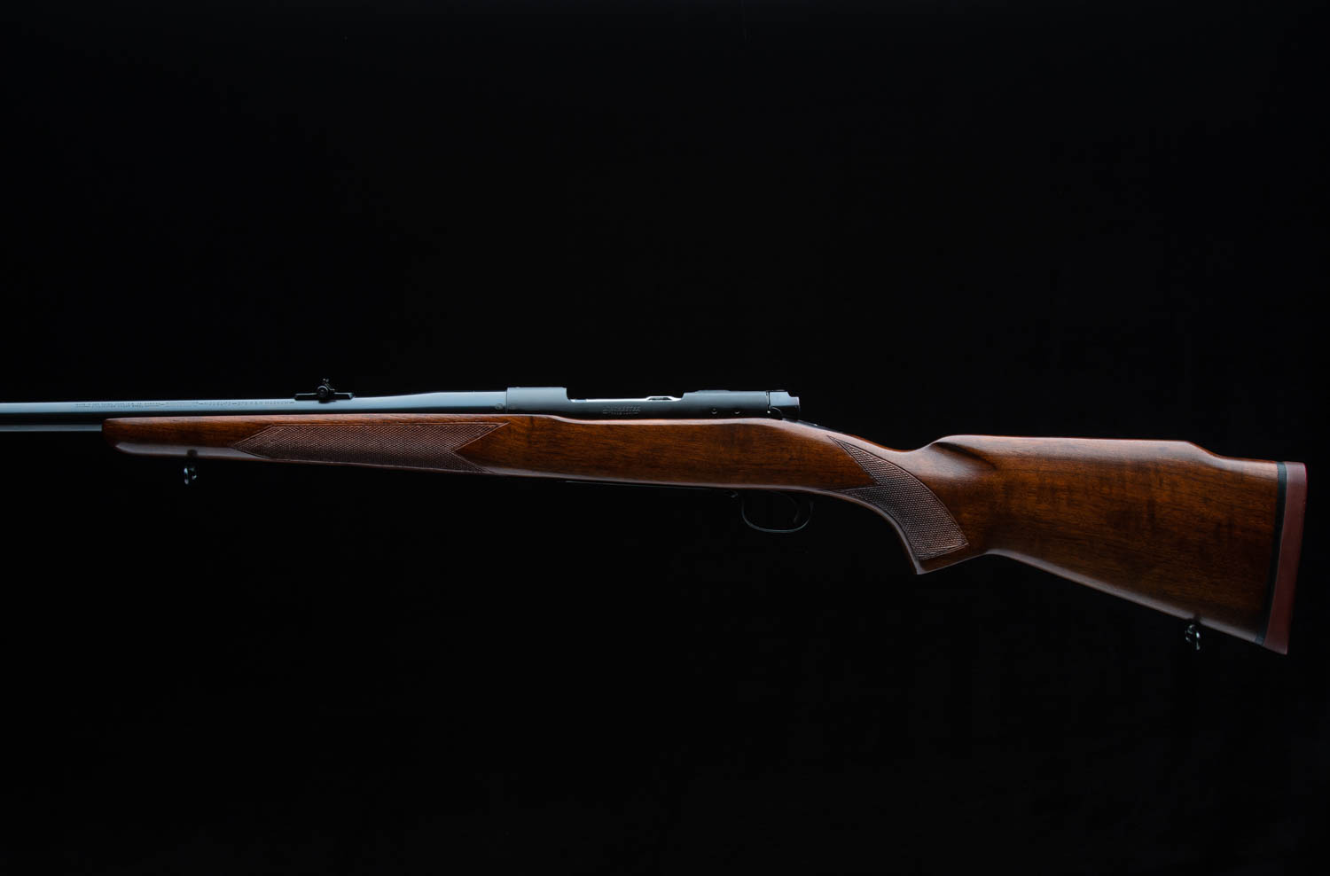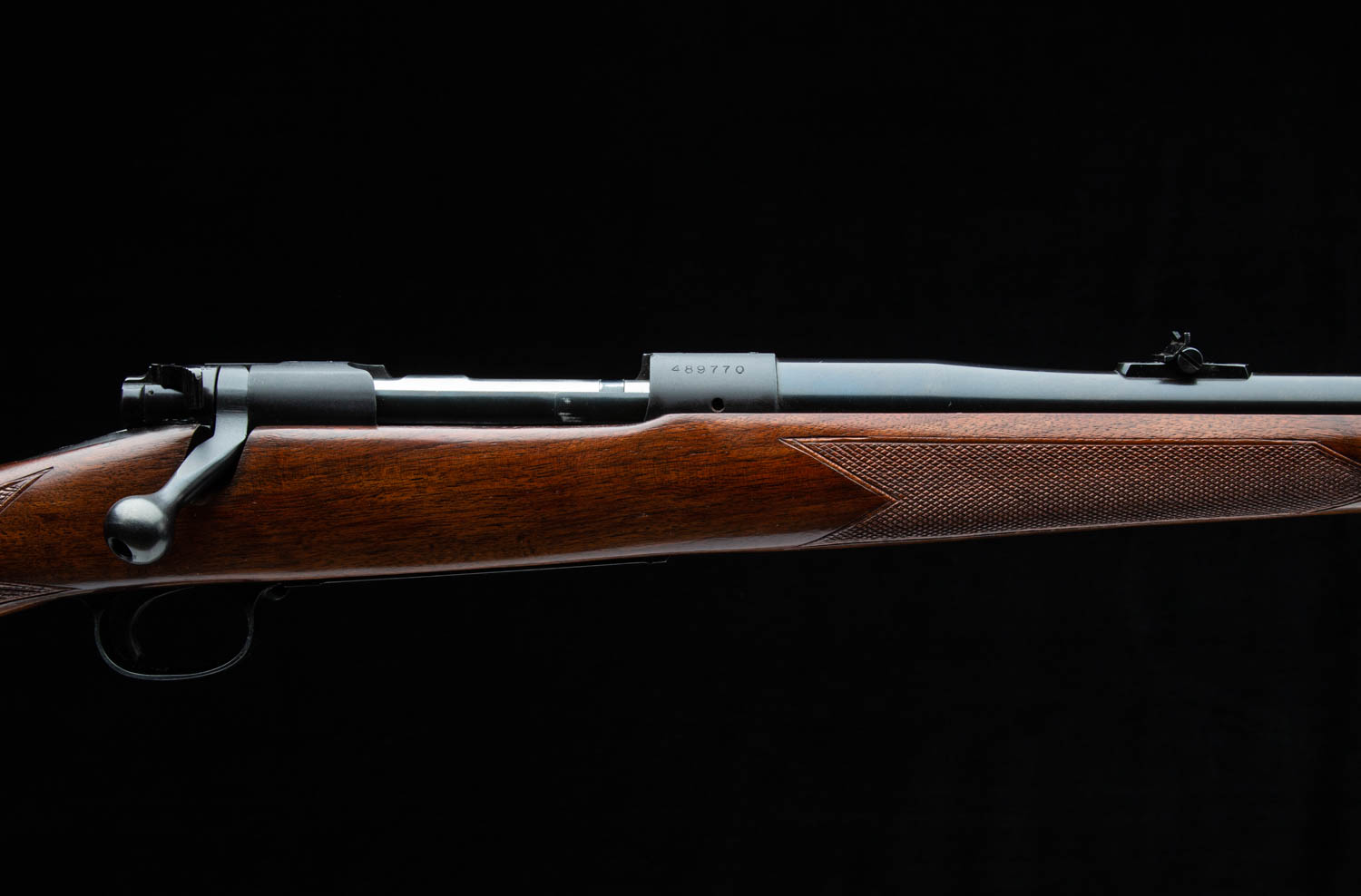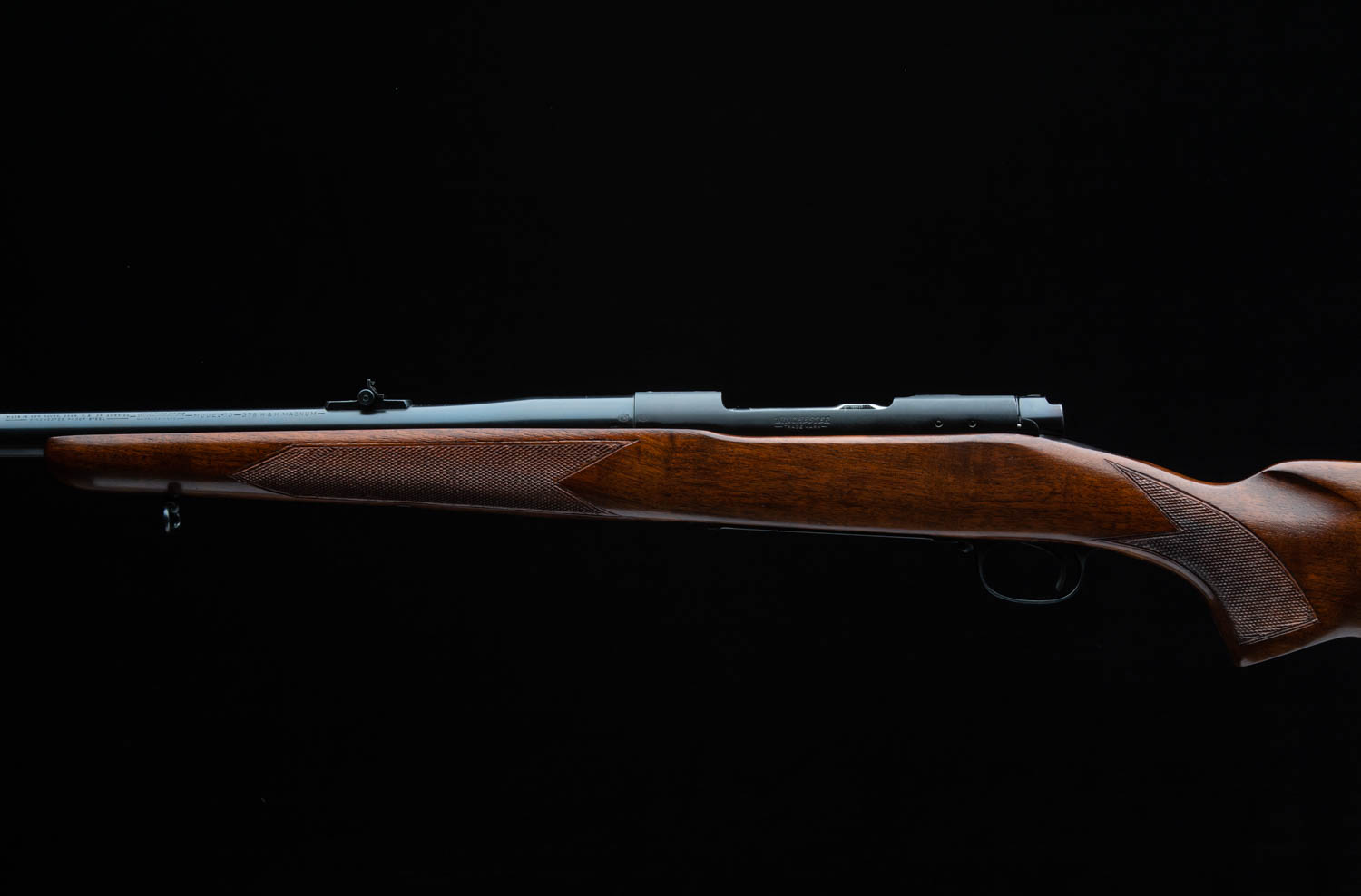 Original Monte Carlo shaped butt stock has a 14" LOP over the factory red "Winchester" solid rubber recoil pad, a checkered grip and forend, bow swivels and ball swivel posts.