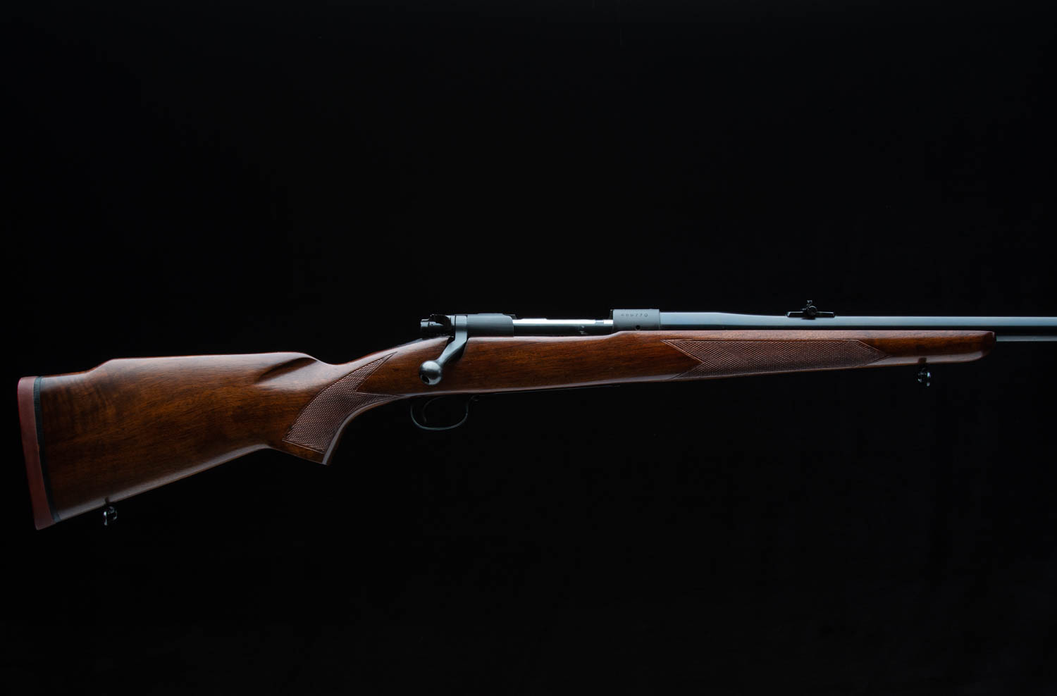 Winchester .375 H&H Magnum Model 70 Alaskan, serial number 489xxx made in 1960 with a 25" heavy barrel, special island rear sight with rotating sight blades and hooded ramp front sight.