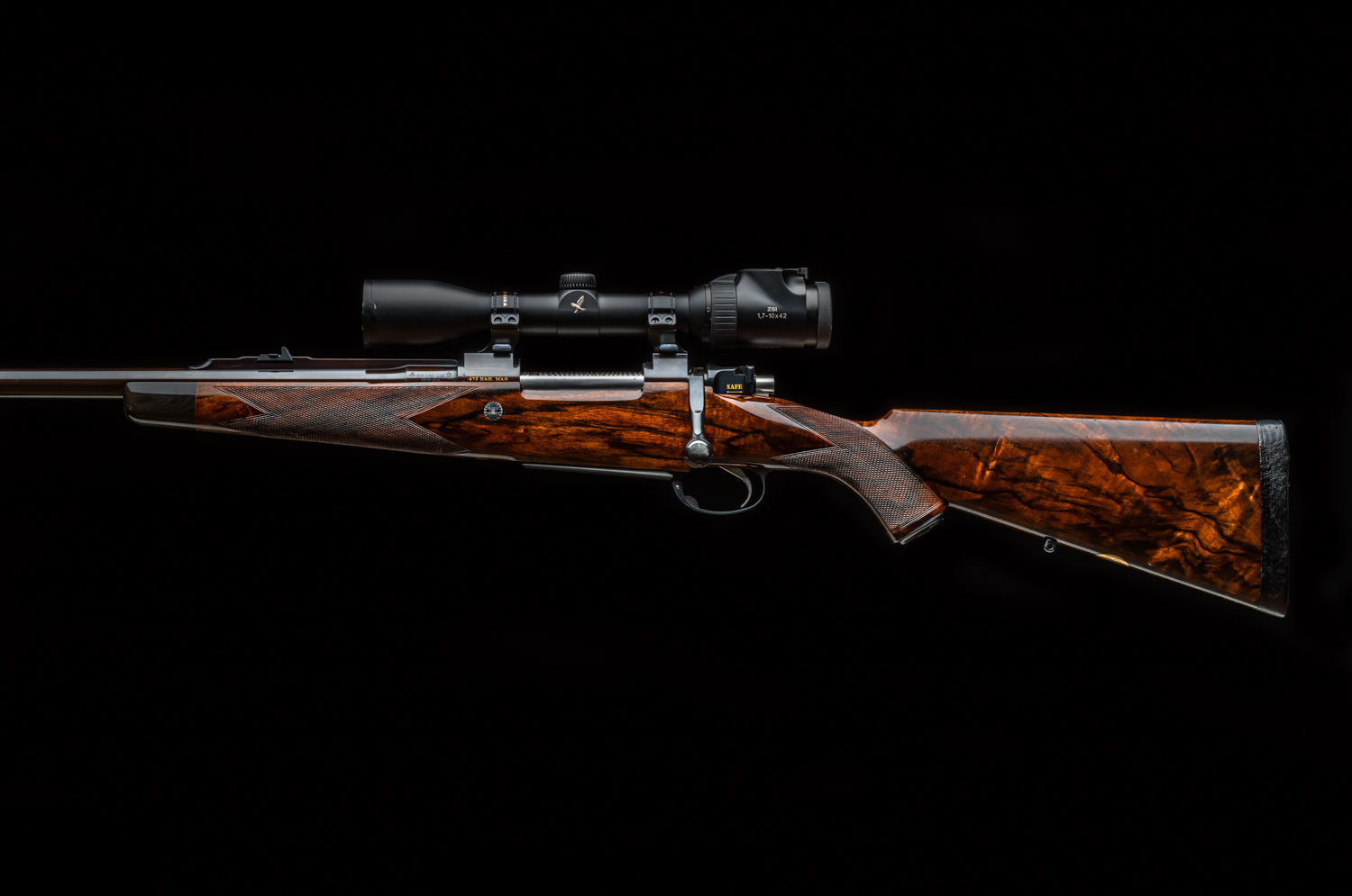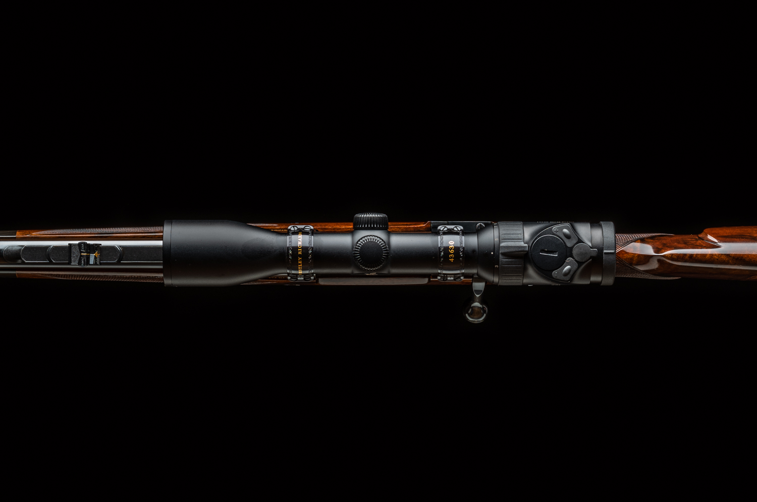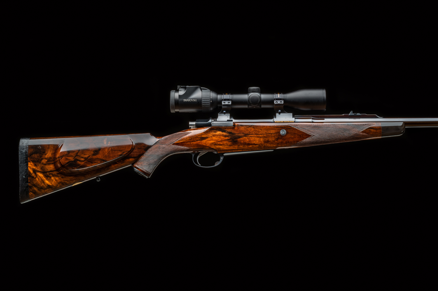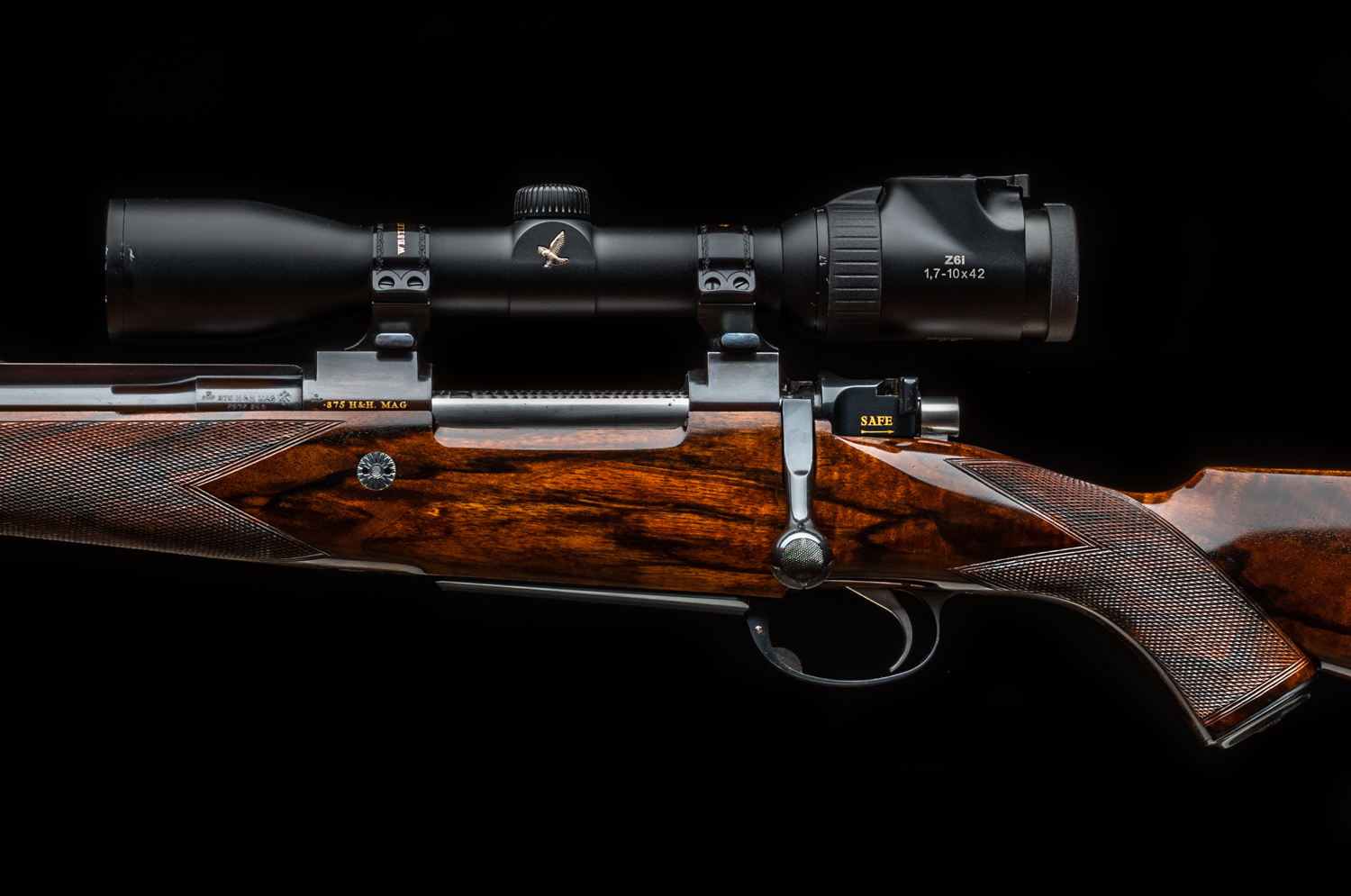 A best quality ‘Gold Name’ hunting rifle in .375 H&H Mangum, the double square bridge Mauser action, with left handed bolt, fitted with claw mounts and Swarovski Z6i telescopic sight.