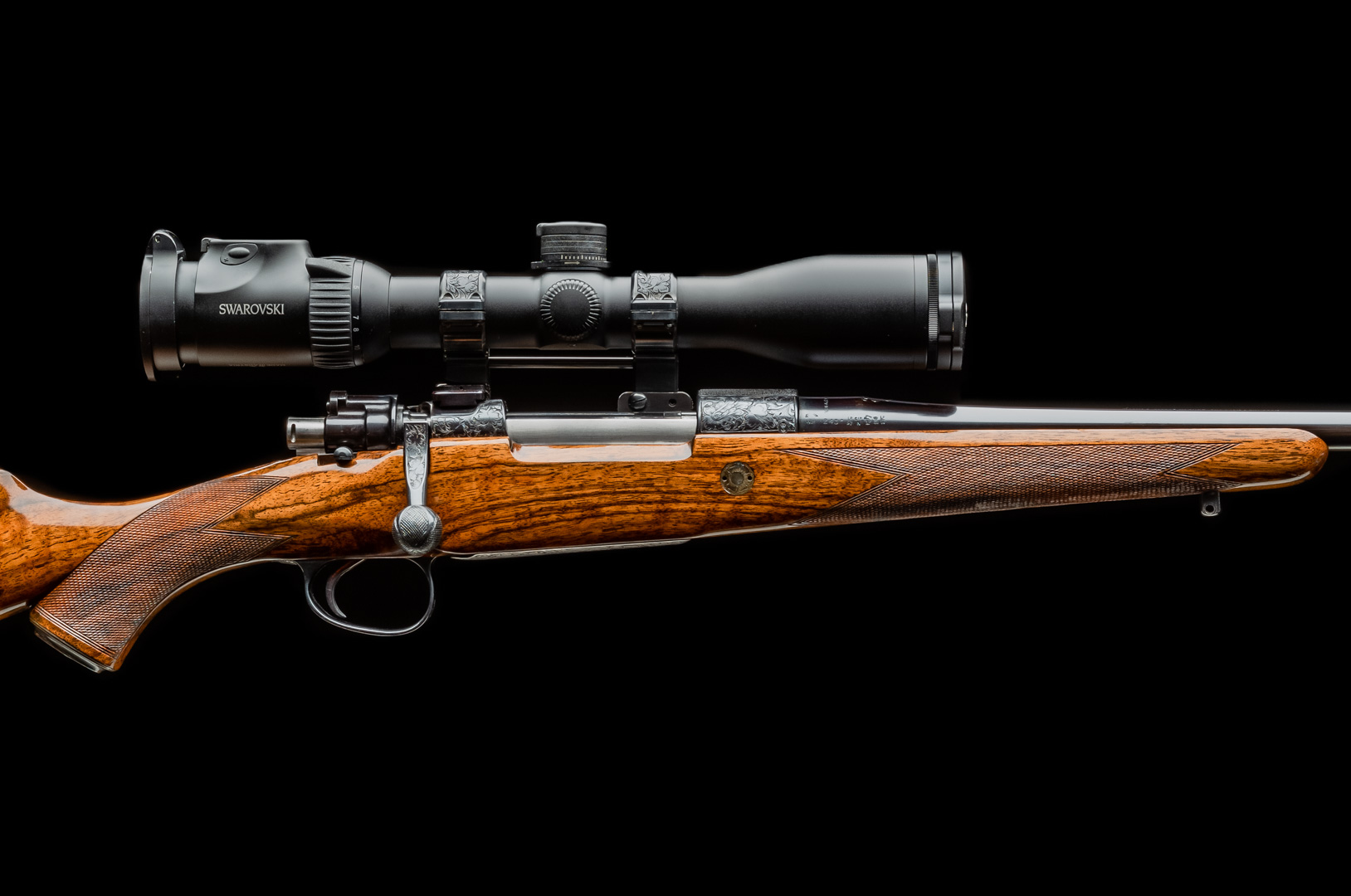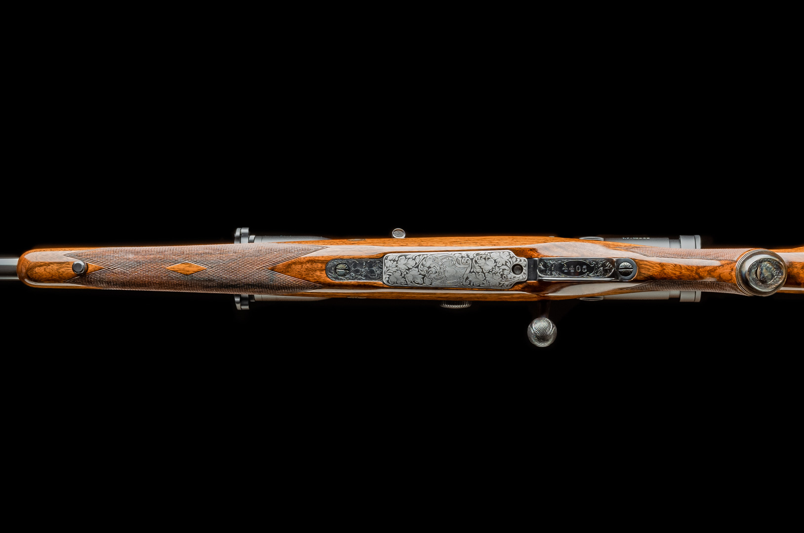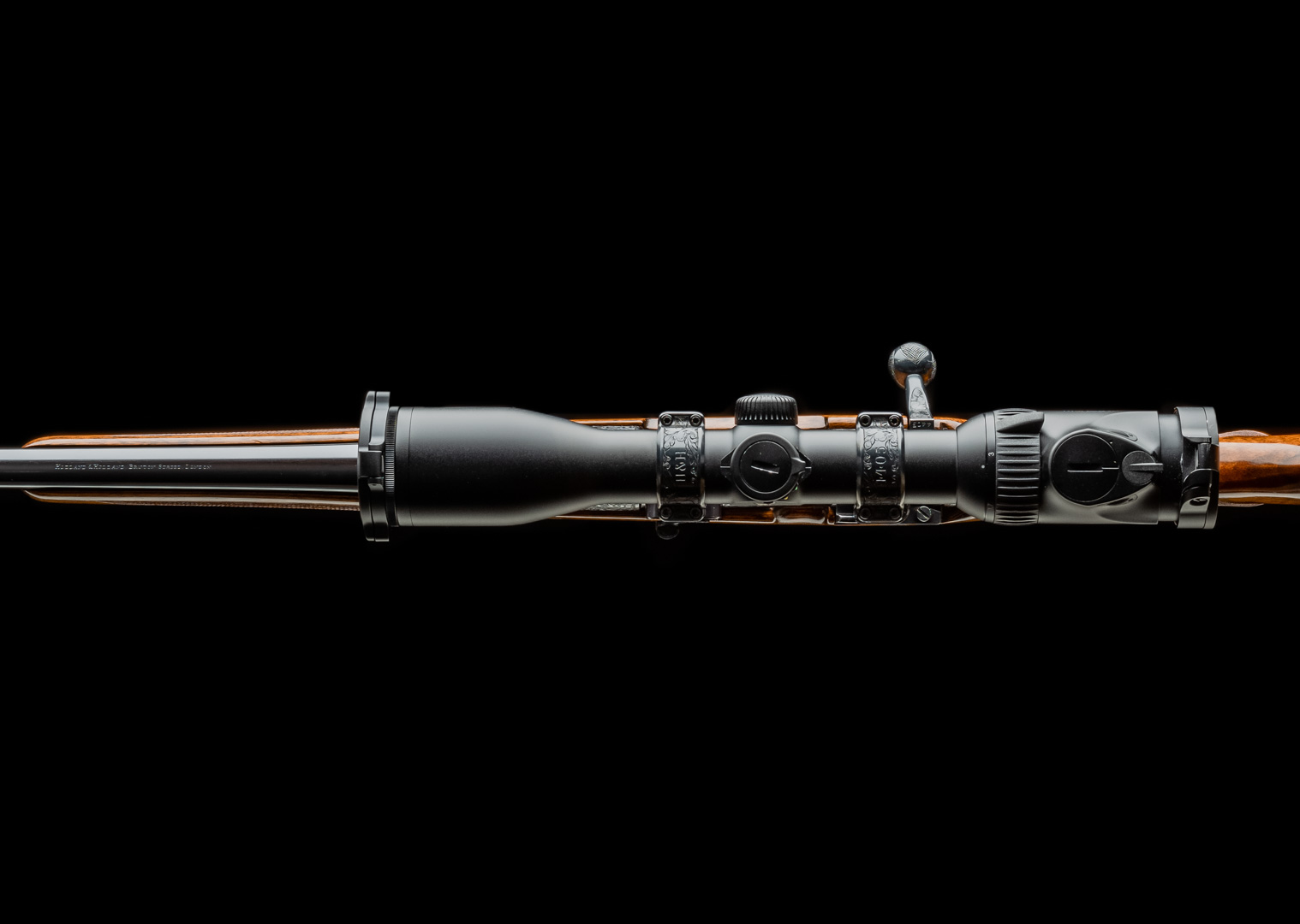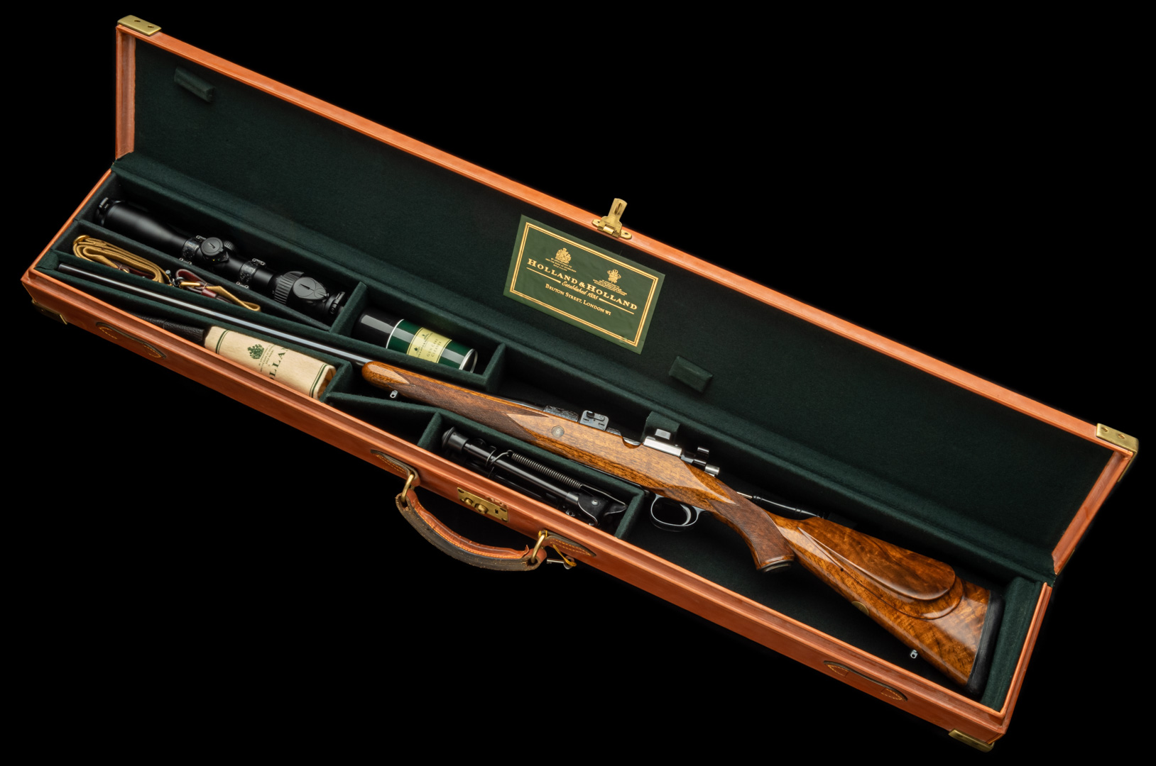 A best quality .243 stalking rifle by Holland & Holland. Bold foliate engraving with roaring red stag on magazine floor plate. Presented in its best Holland & Holland leather case with leather-trimmed canvas outer, containing Swarovski Z6i ‘scope, bipod, sling and cleaning accessories.