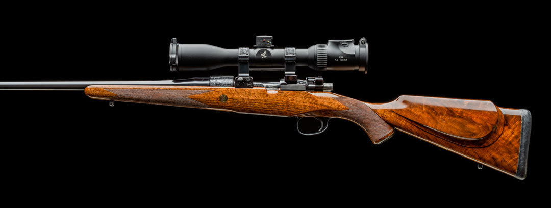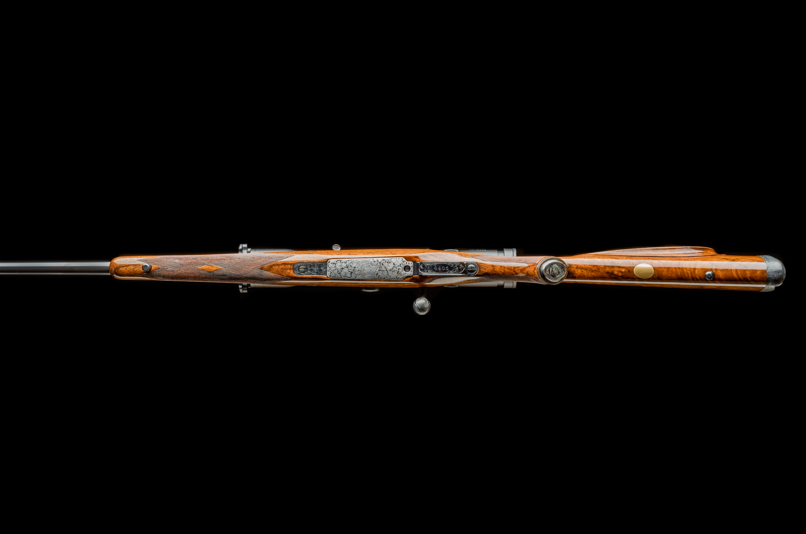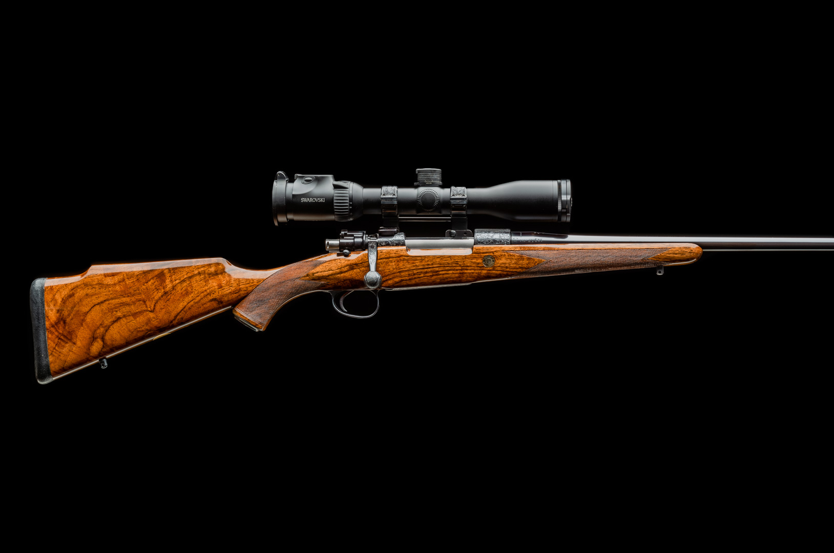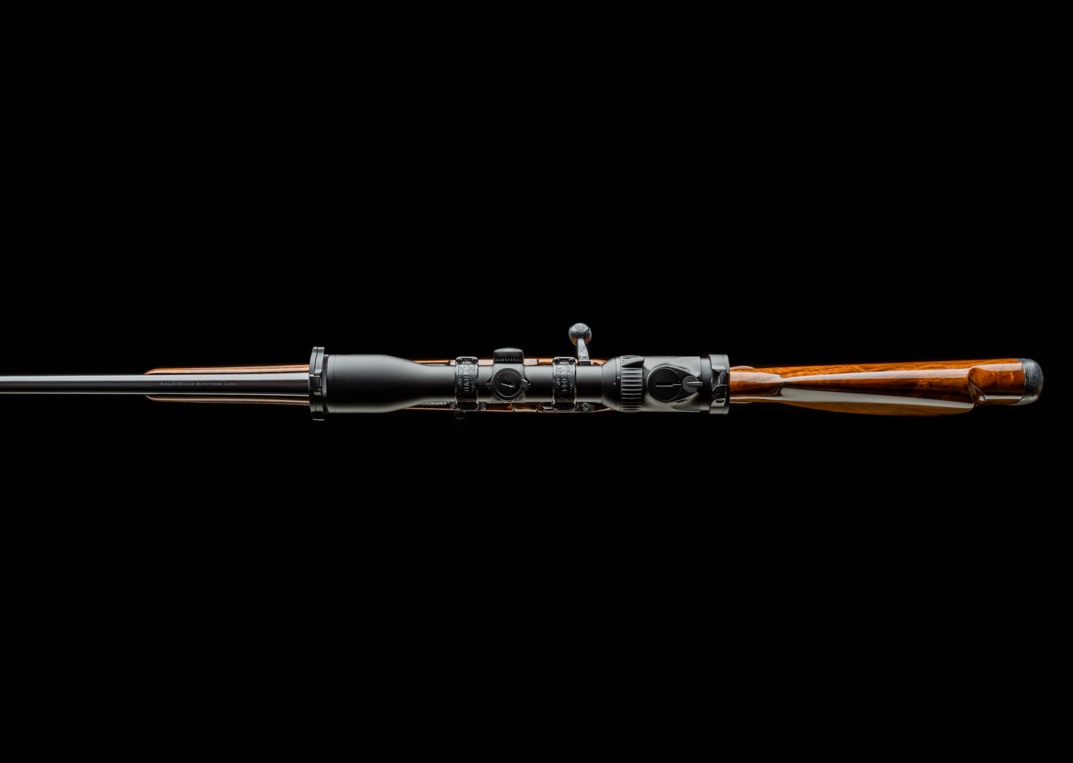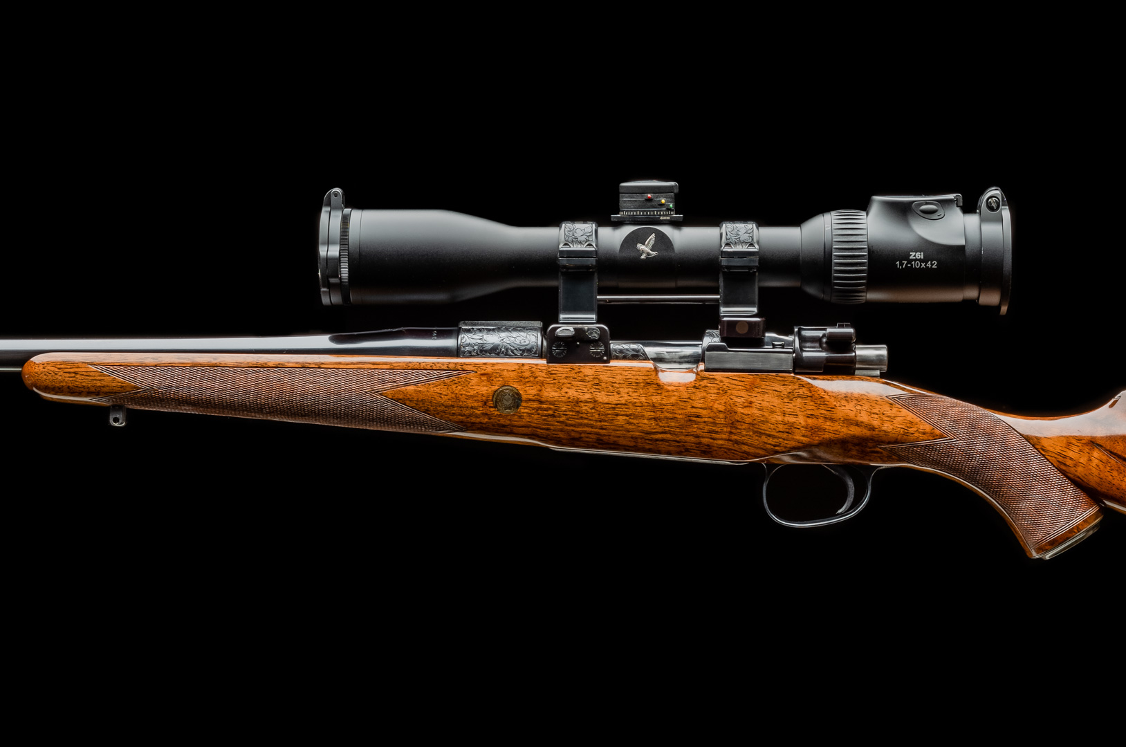 A best quality .243 stalking rifle by Holland & Holland. Bold foliate engraving with roaring red stag on magazine floor plate. Presented in its best Holland & Holland leather case with leather-trimmed canvas outer, containing Swarovski Z6i ‘scope, bipod, sling and cleaning accessories.