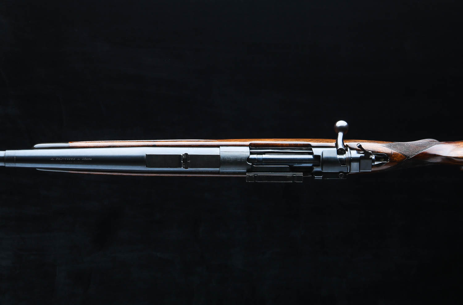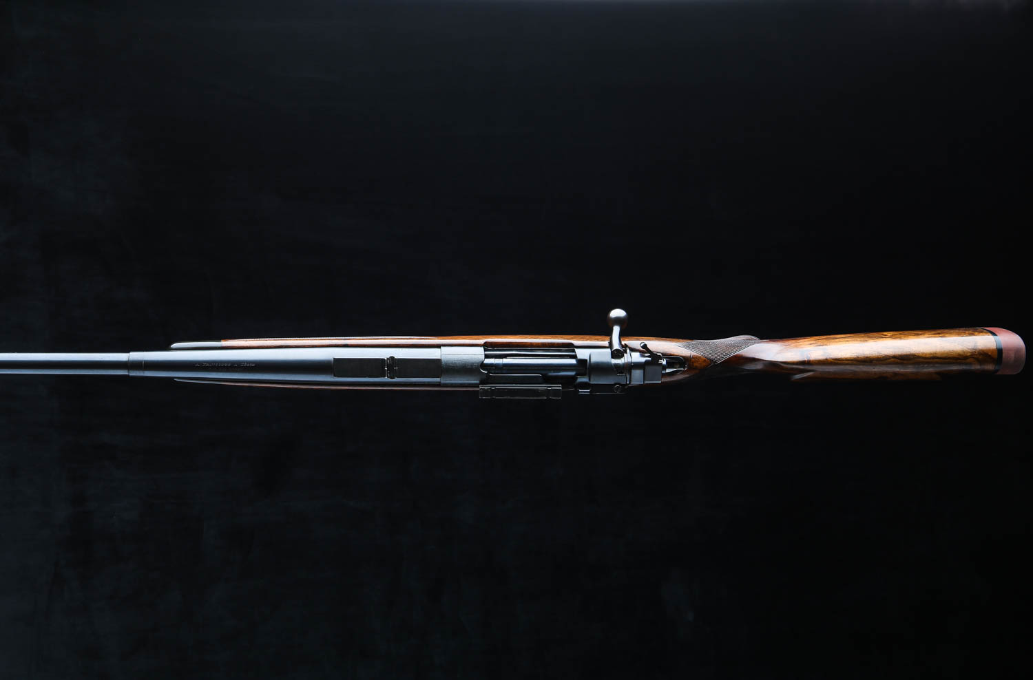Mauser action with drop belly magazine that holds 5 down to strip one out of the magazine for 5 rounds total and a lever-release floor plate.