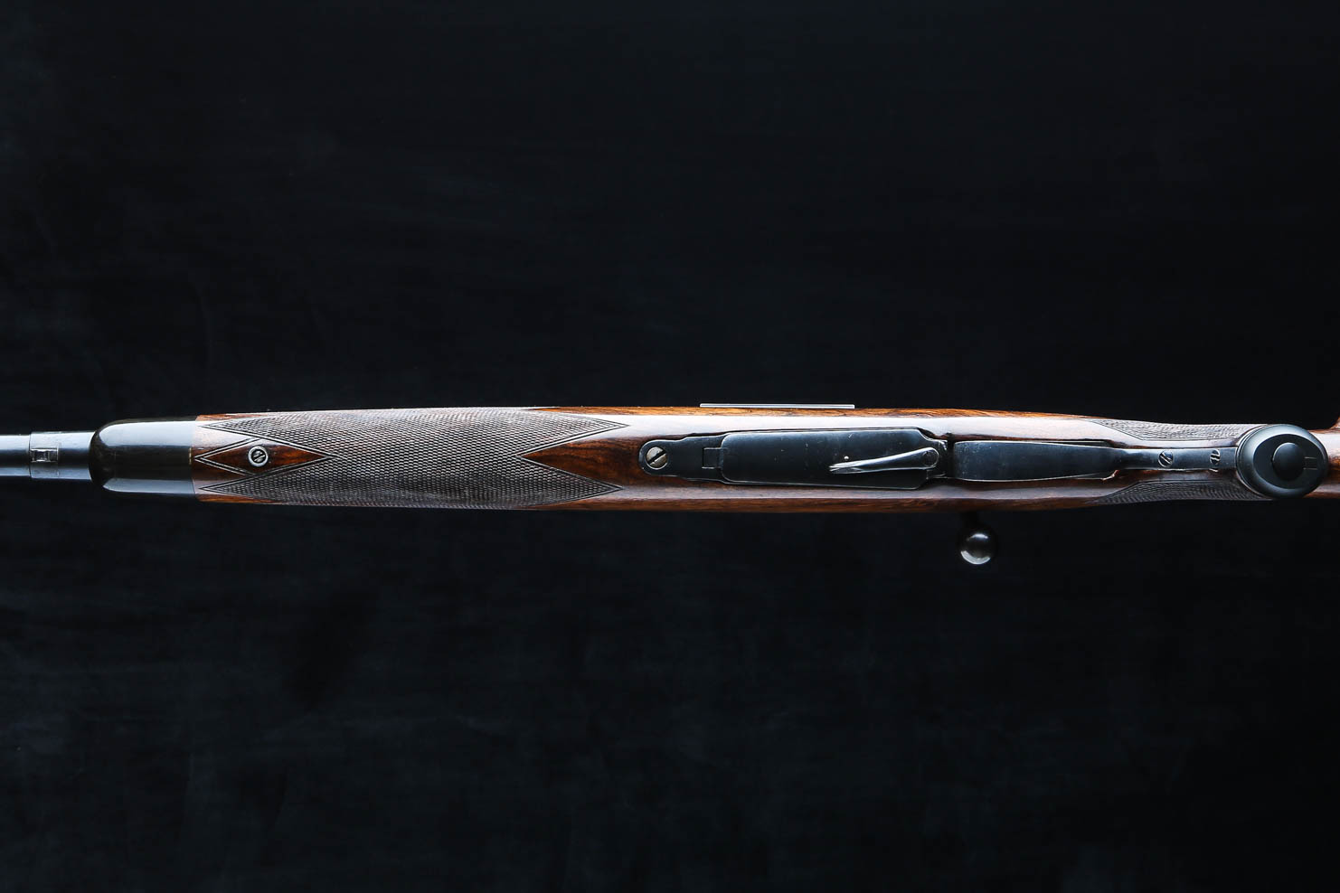 Uniquely tapered 26" barrel by Belgium barrel maker Laurent Lochet-Habran, has Rigby style quarter rib rear sight and a banded front sight. Rigby style sleeved on barrel mounted forward sling swivel, and stubby quarter rib with one standing/1 folding (100, 200 yds) rear sights.