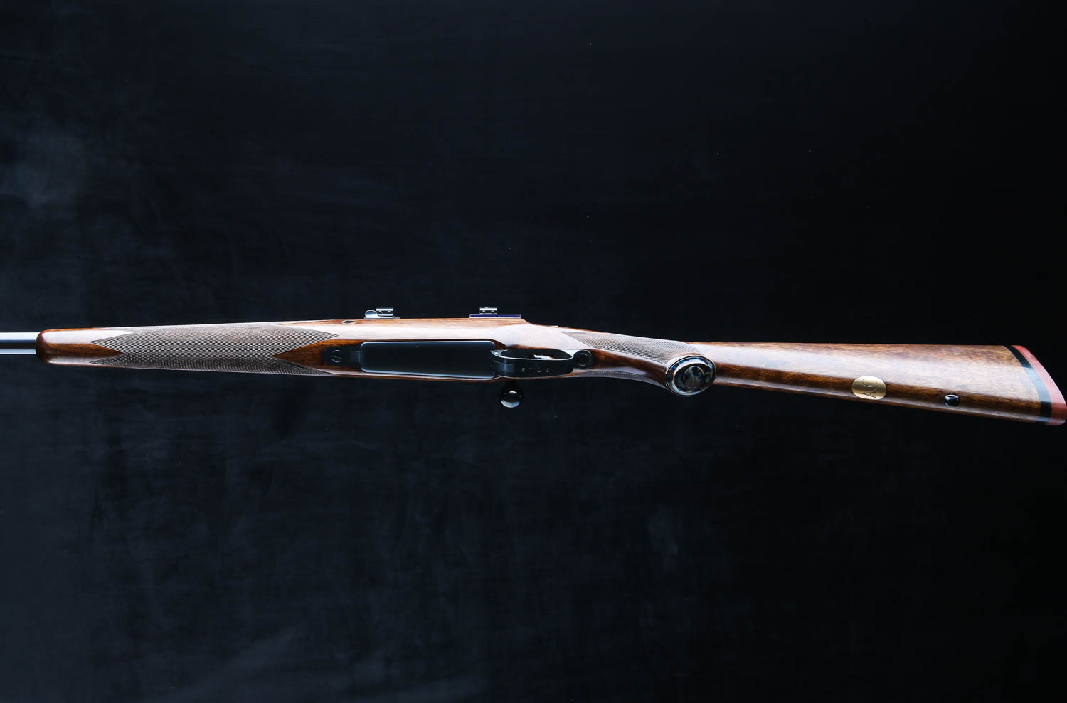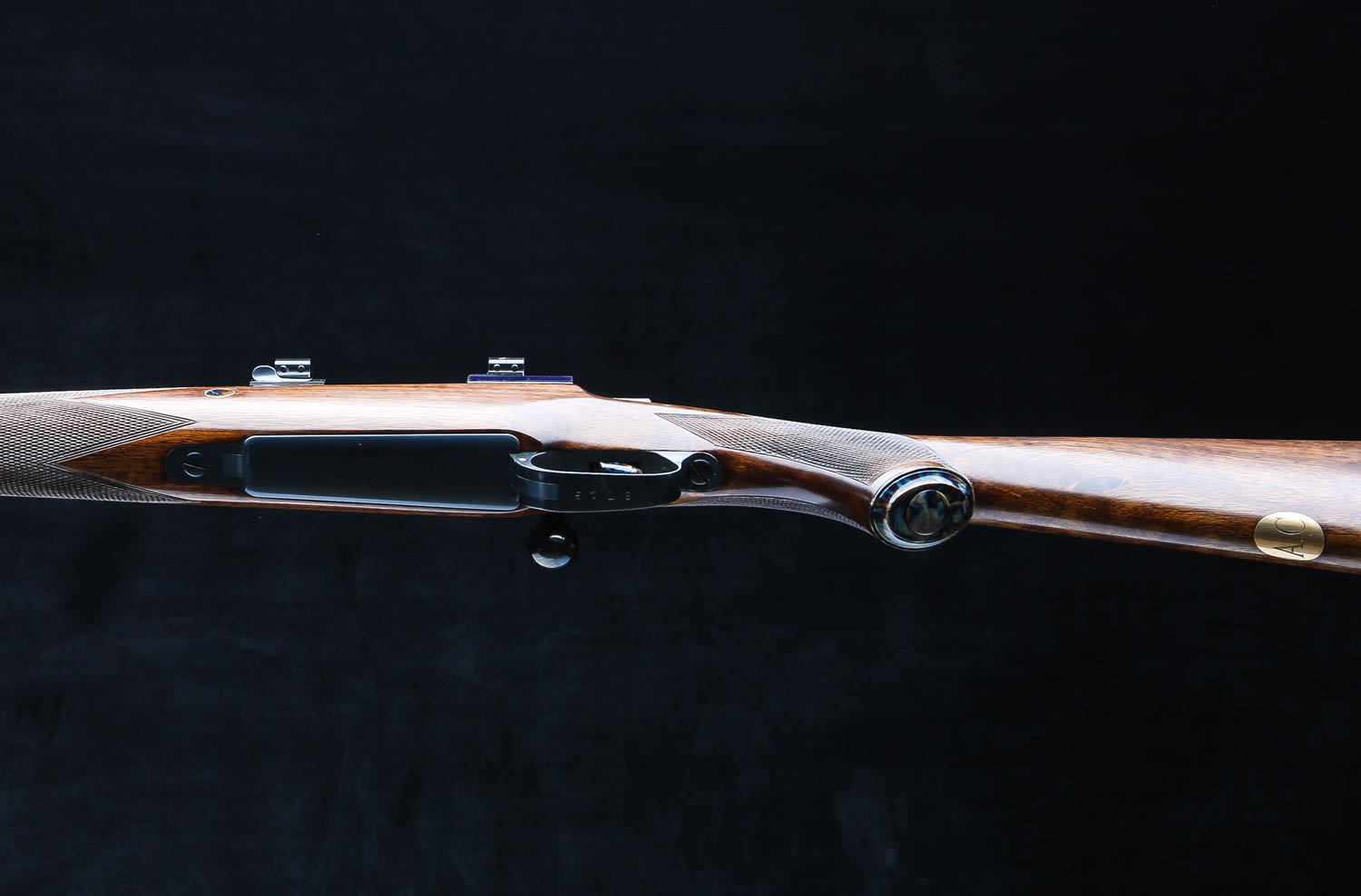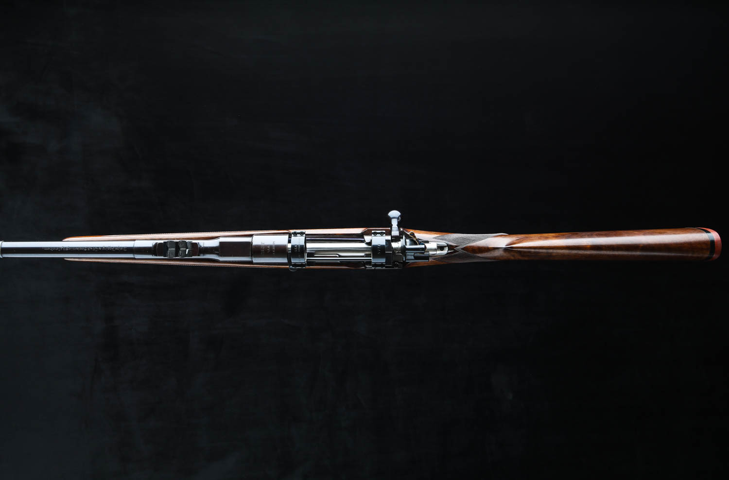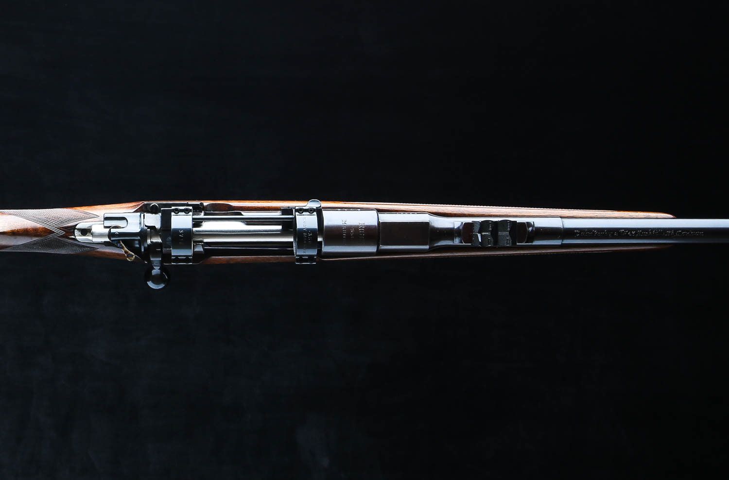 Originally sold in 1939 to Keep Bros., a retailer and exporter in Birmingham, England, the rifle is based on the original Oberndorf single square bridge magnum Mauser action. The top of the action’s front ring is engraved: “Rigby .350 Magnum” Original one-piece bottom metal with straddle floorplate and inside-the-bow release and Rigby’s serial number engraved on the guard bow.