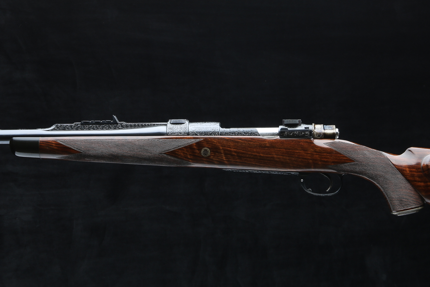 Based on a standard-length Mauser action with a modern bolt shroud and M70 type 3-position safety, a hinged straddle floor plate and an inside-the-bow release, spotted (e.g. jeweled) bolt body and a 3- panel checkered bolt knob. Timney trigger, and claw scope mounts. The word “SAFE” is inlaid in gold on the bolt’s shroud over a gold inlaid arrow pointing rearward.