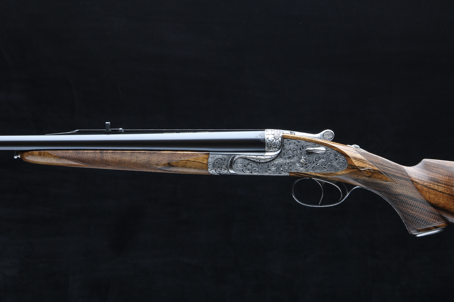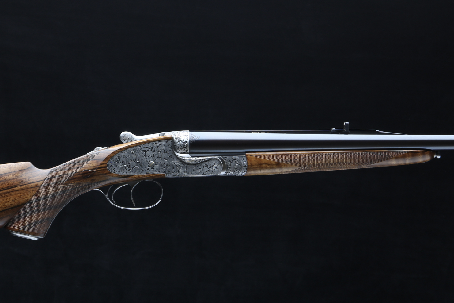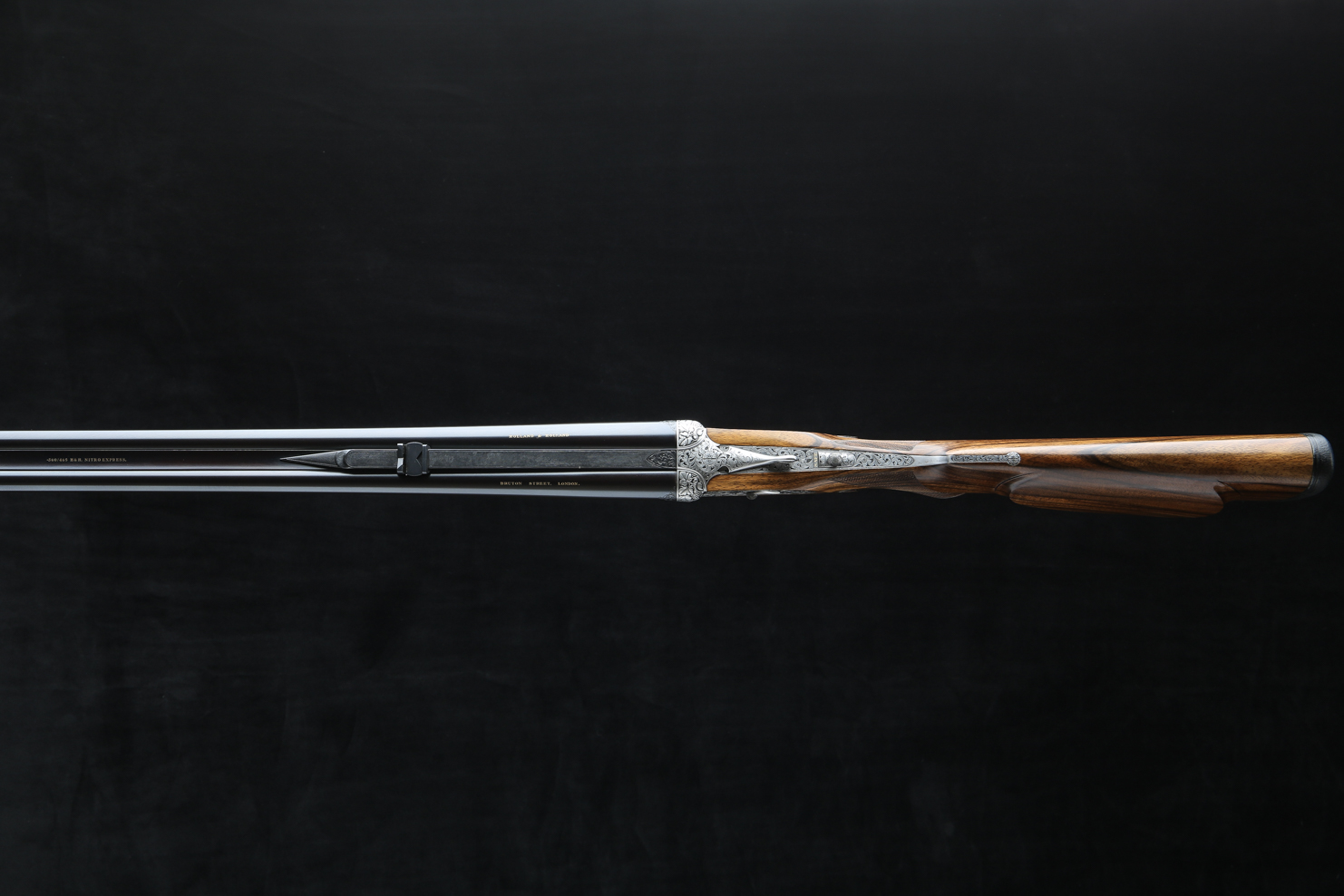 Holland & Holland .500/.465 NE Royal Model de Luxe Sidelock Ejector Double Rifle. Based on Holland's "Royal" Model back-action sidelock ejector featuring Holland's hand detachable locks patented in 1909 and the very distinct and graceful bolstered action body, introduced a few years later. The action also has all the hallmark features of best quality London made sidelock double rifle such as disk-set strikers, hidden third fastener, manual safety, gold lined cocking indicators, two triggers (the front articulated and both cast for a RH shooter), rolled-edge guard bow also for the RH shooter, a guard tang extending to the grip cap, and a strap over comb which was first introduced by Holland's in the late 1800's.