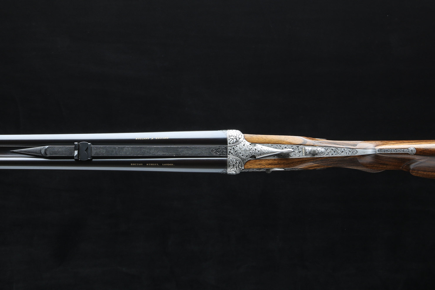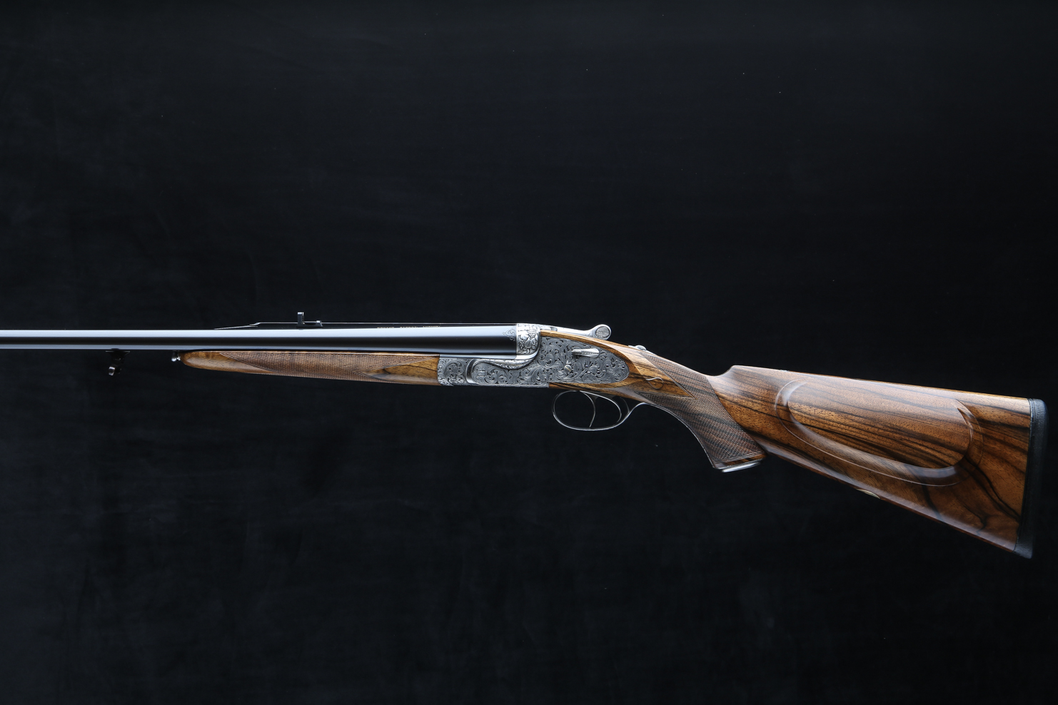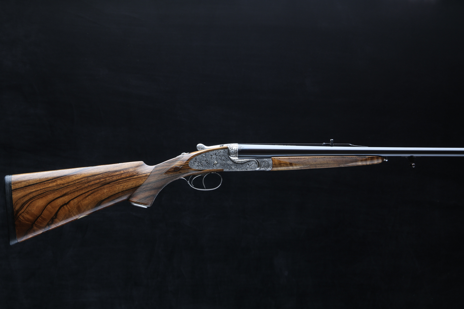 Holland & Holland .500/.465 NE Royal Model de Luxe Sidelock Ejector Double Rifle. Based on Holland's "Royal" Model back-action sidelock ejector featuring Holland's hand detachable locks patented in 1909 and the very distinct and graceful bolstered action body, introduced a few years later. The action also has all the hallmark features of best quality London made sidelock double rifle such as disk-set strikers, hidden third fastener, manual safety, gold lined cocking indicators, two triggers (the front articulated and both cast for a RH shooter), rolled-edge guard bow also for the RH shooter, a guard tang extending to the grip cap, and a strap over comb which was first introduced by Holland's in the late 1800's.