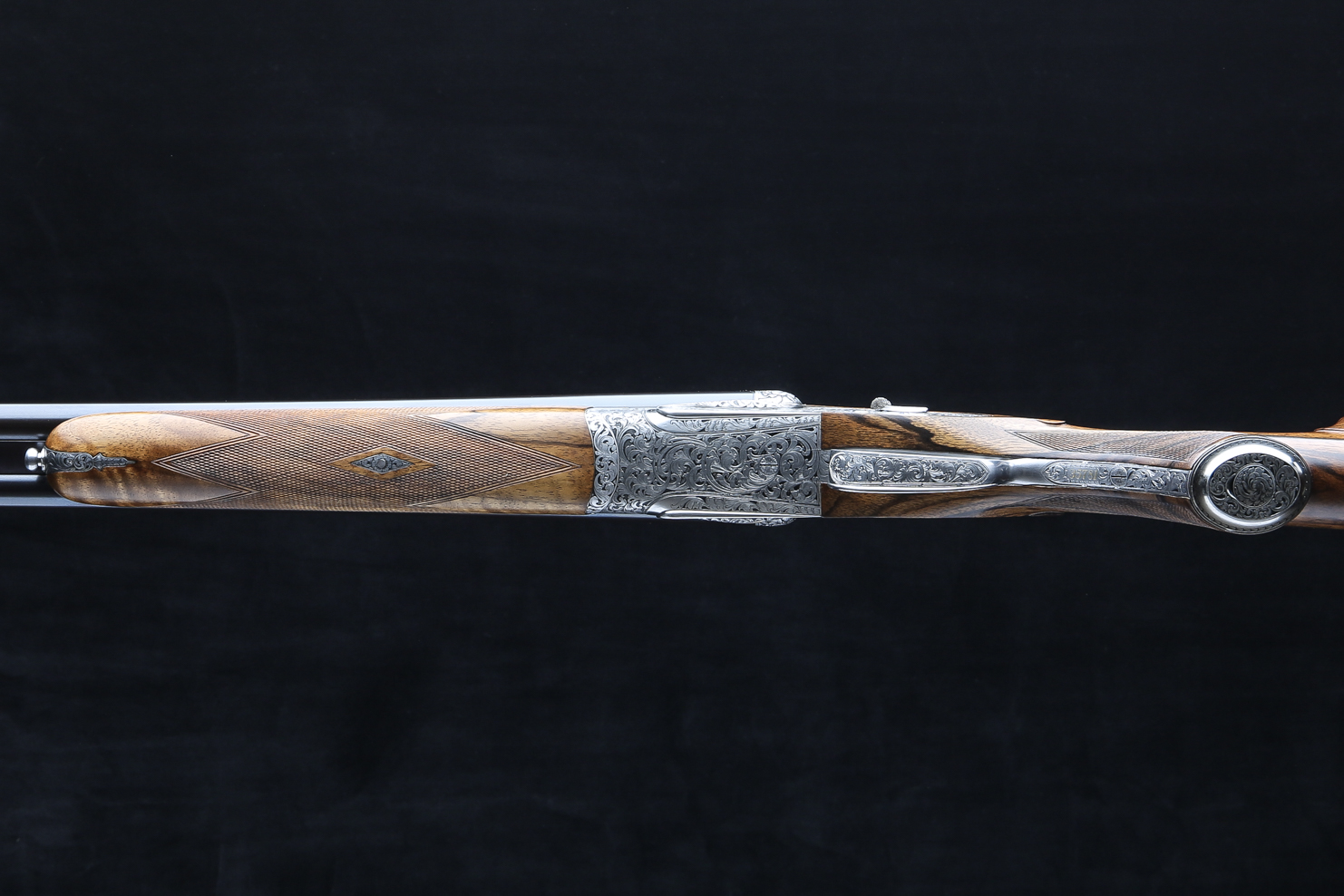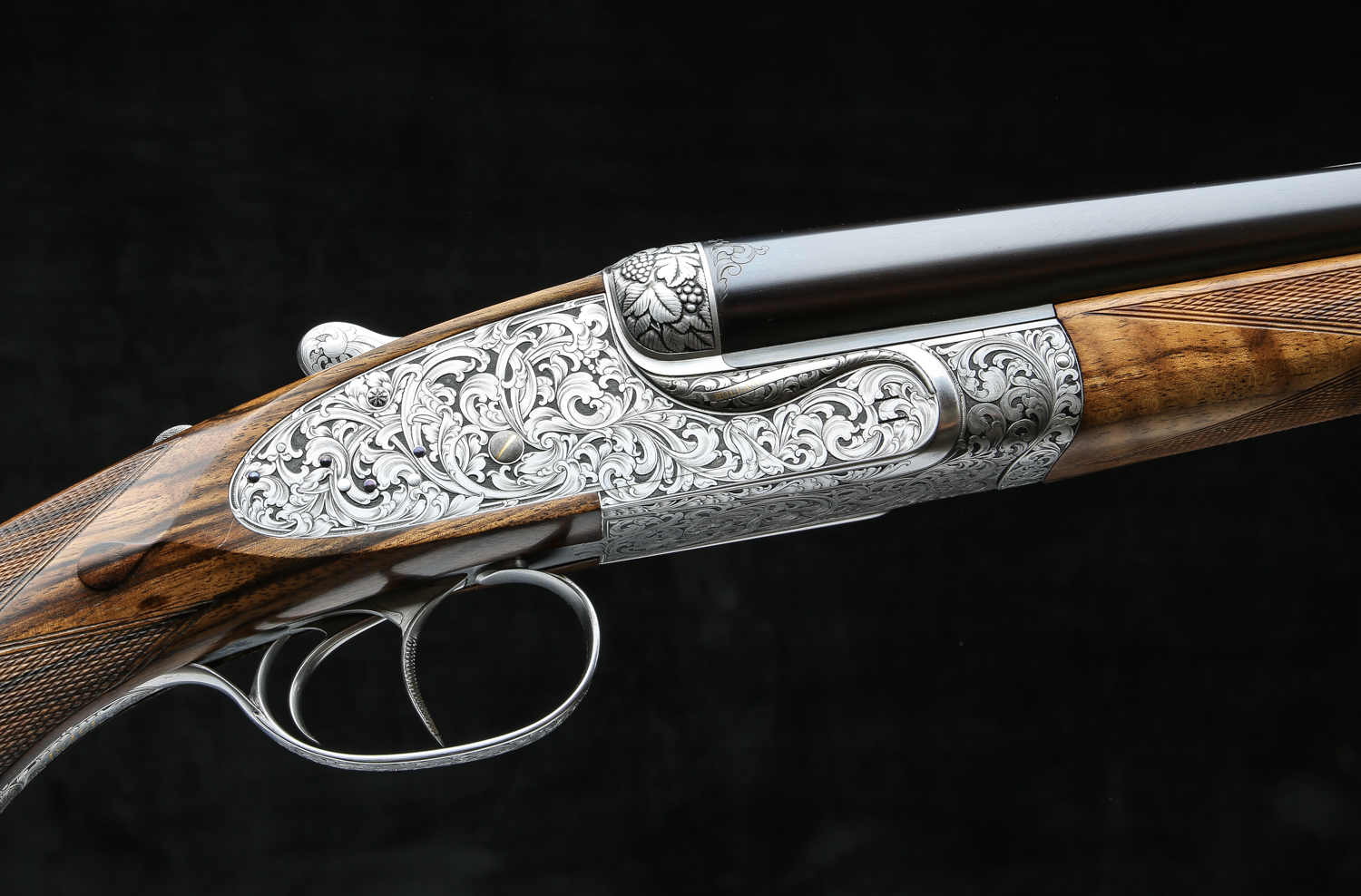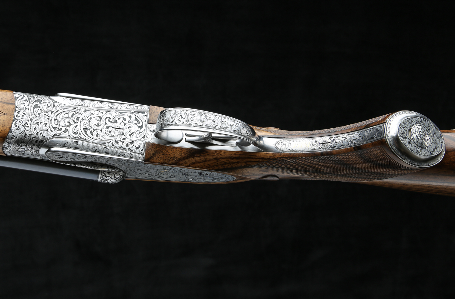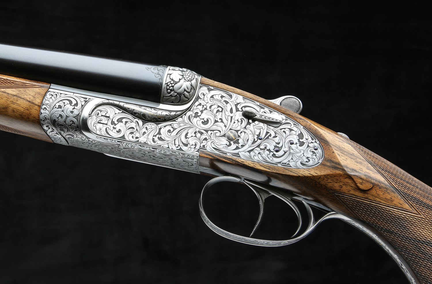 The action body, lock plates, and furniture have a brushed bright finish and are engraved by world renowned English engraver, Phil Coggan. One of the finest engravers of modern times, Mr. Coggan's work is highly sought after by collectors. The full coverage deluxe bold scroll is expertly cut and the fences deeply carved with fruiting grape vines and leaves. The Maker's name is inlayed in gold on the action's bolsters and Maker's name, caliber, and address are inlayed in gold on top of the barrels and top rib. The serial number and the word "SAFE" are also inlayed in gold. The engraver's signature is on the trigger plate.