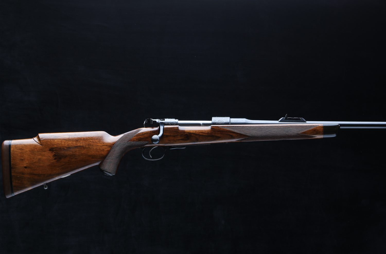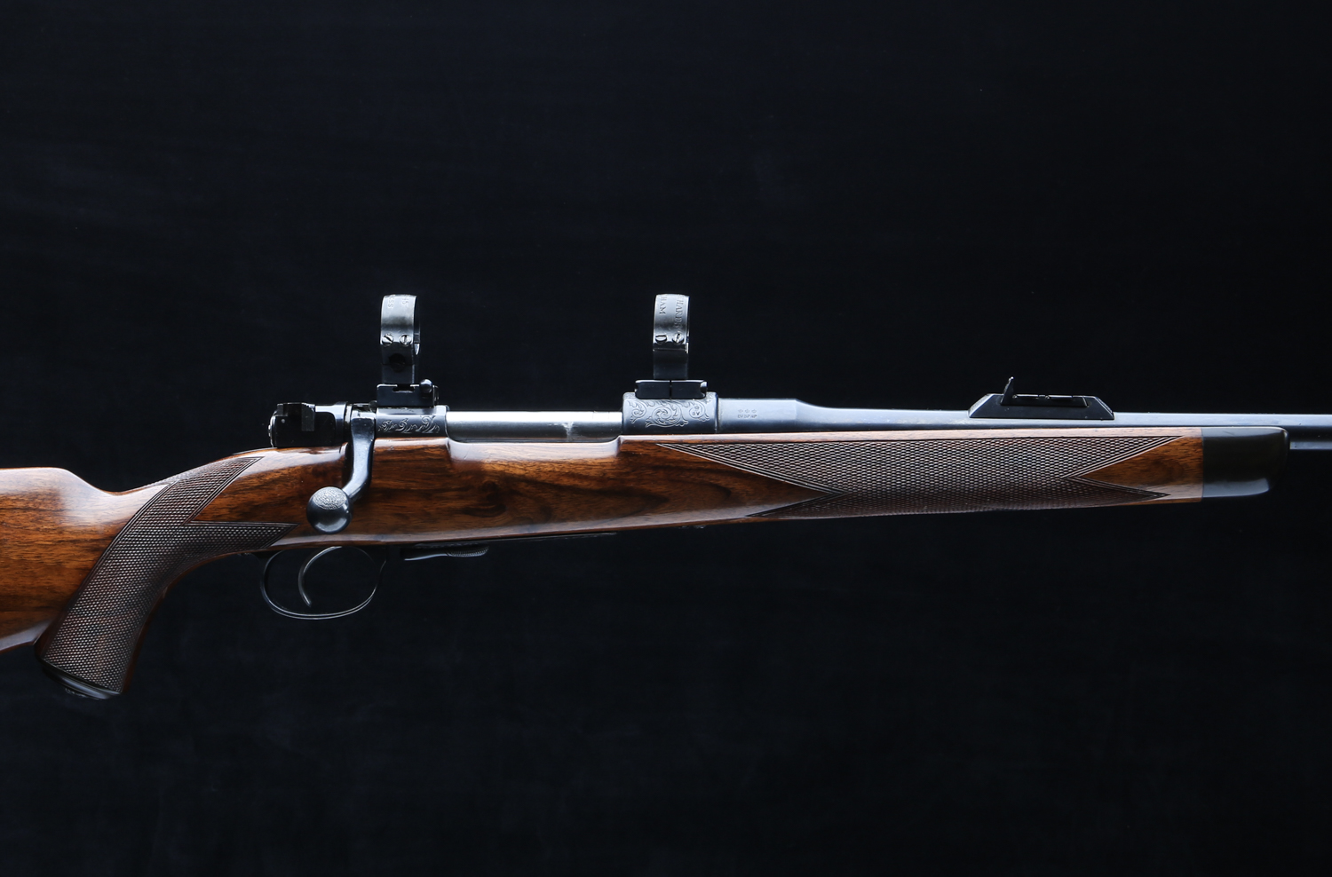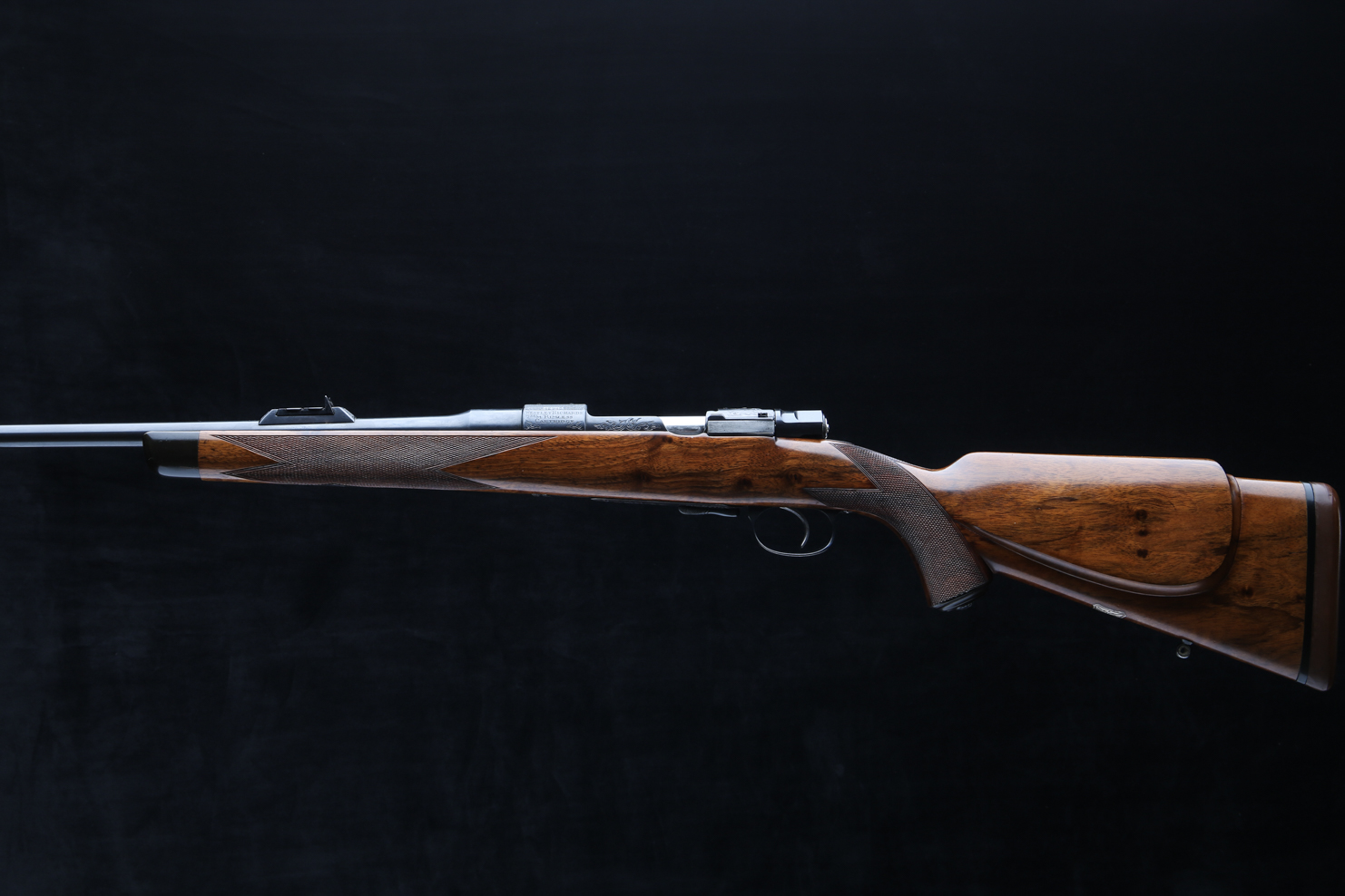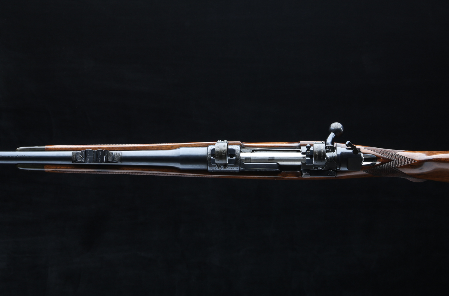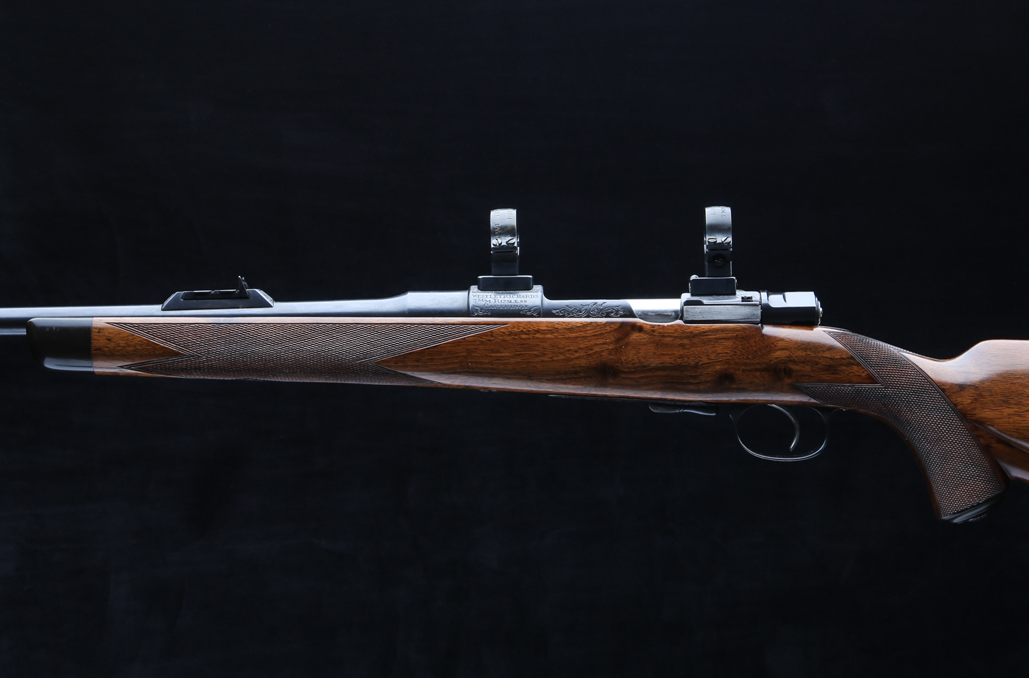 Based on a standard length Mauser action with an upgraded bolt shroud and 3-postion M70 type safety to accommodate a telescopic sight. Action is also drilled and tapped and rifle includes modern swing off, 1" rings, appropriately engraved with the Maker's name and rifle's serial number. The Original Mauser one-piece bottom metal is fitted with Westley's distinctive lever for the hinged floor plate.