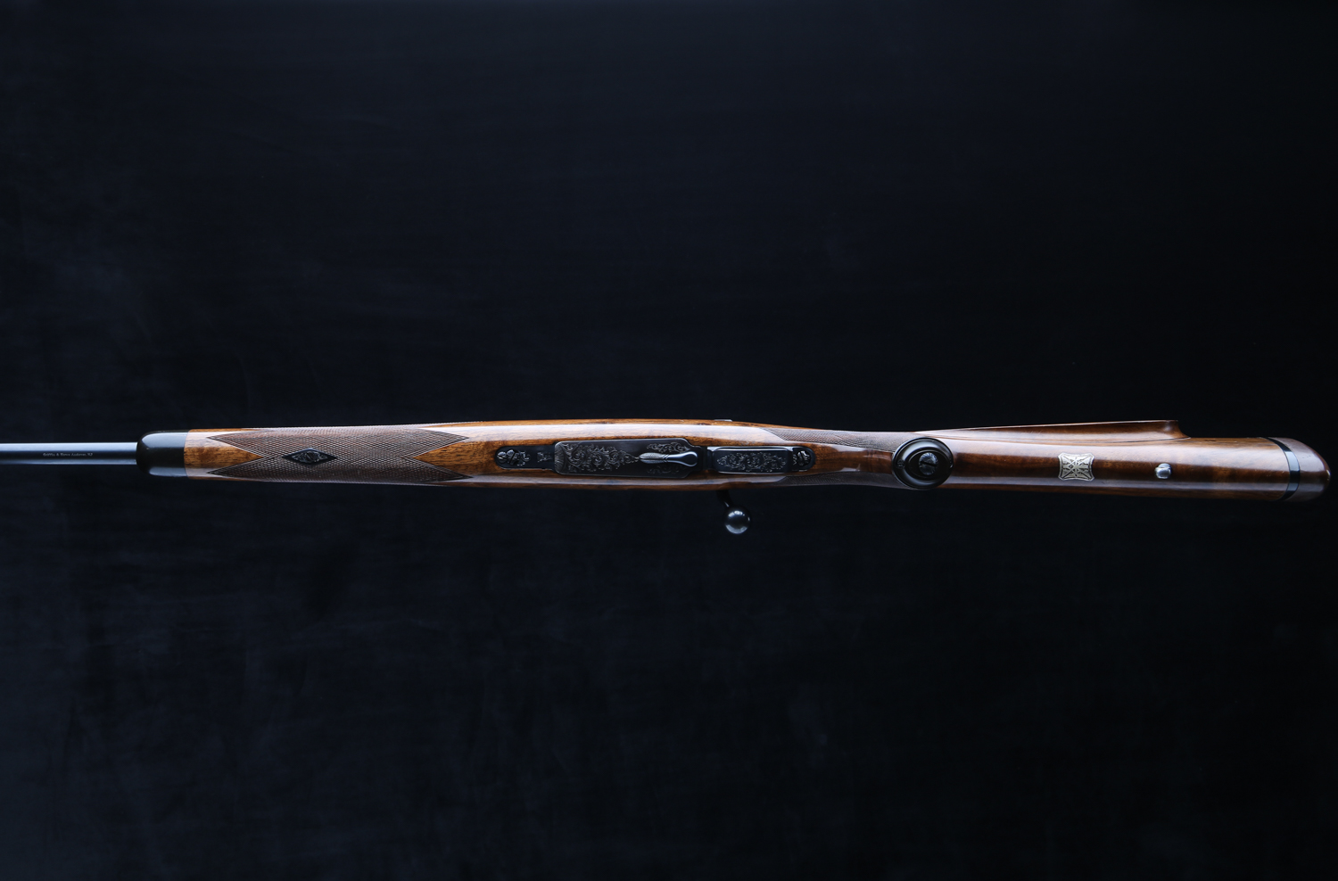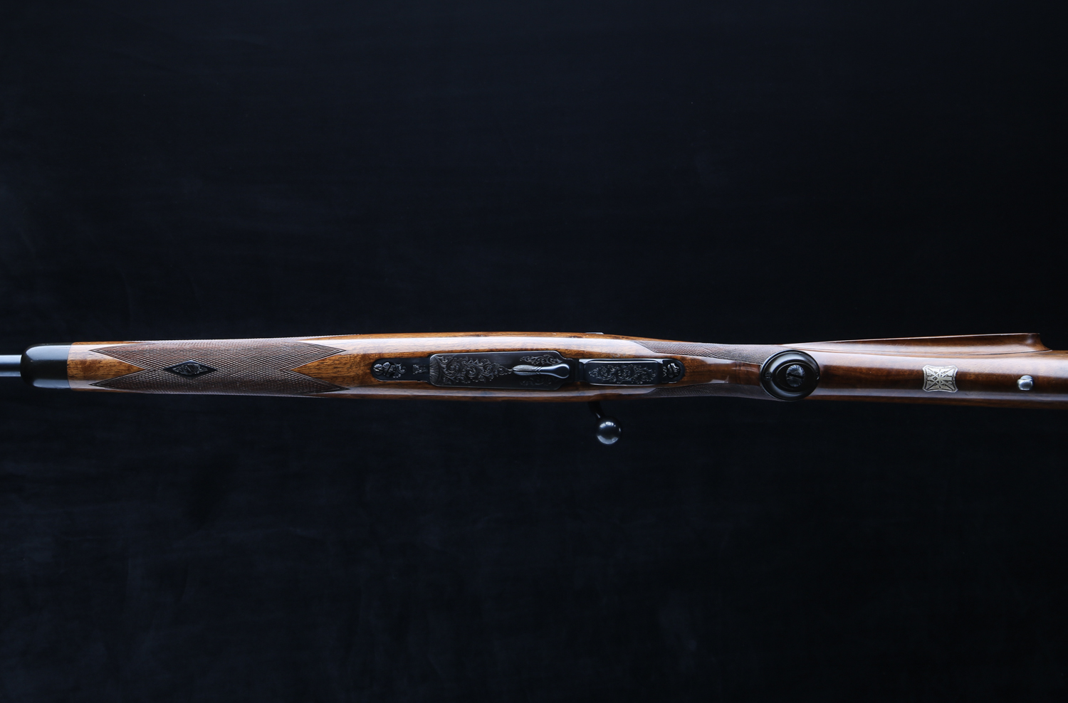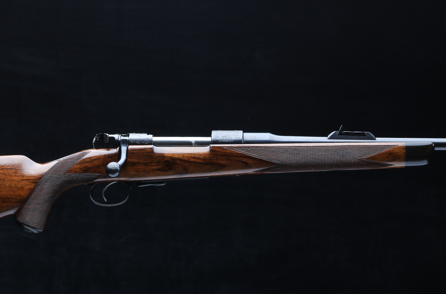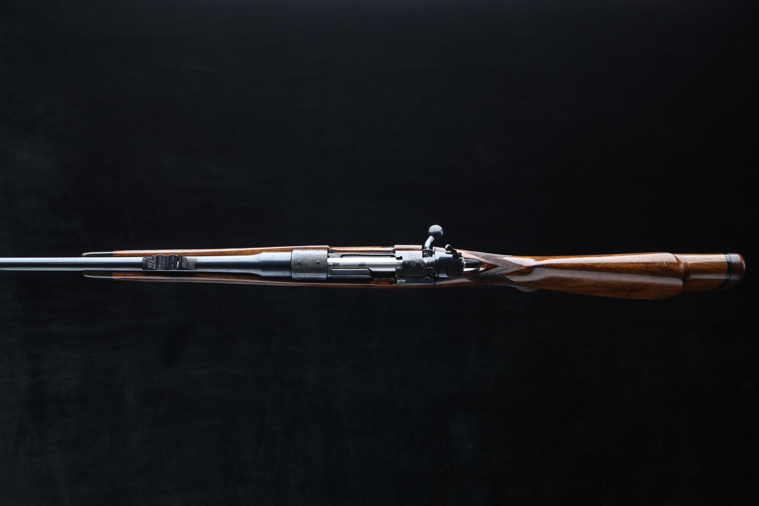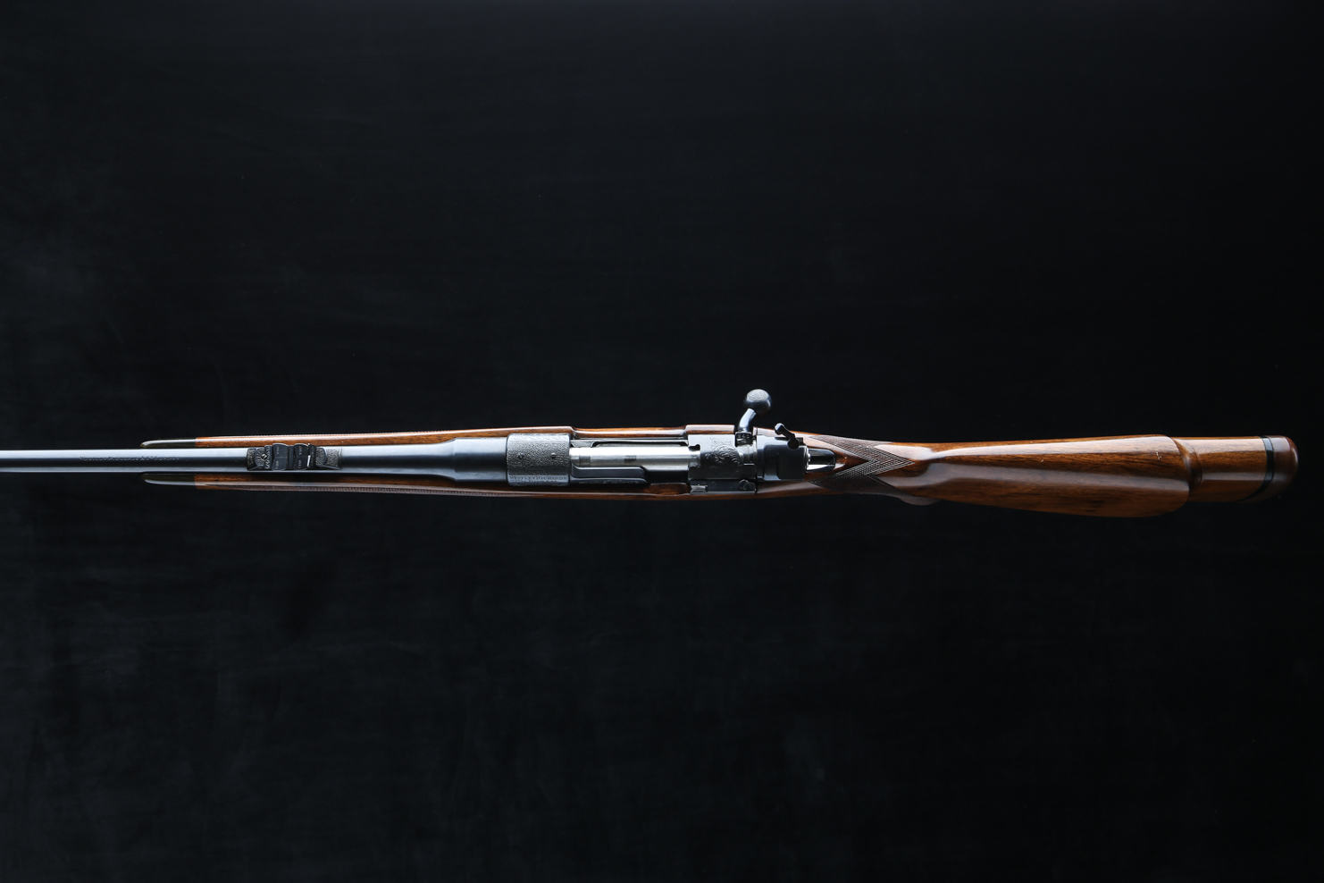 Based on a standard length Mauser action with an upgraded bolt shroud and 3-postion M70 type safety to accommodate a telescopic sight. Action is also drilled and tapped and rifle includes modern swing off, 1" rings, appropriately engraved with the Maker's name and rifle's serial number. The Original Mauser one-piece bottom metal is fitted with Westley's distinctive lever for the hinged floor plate.