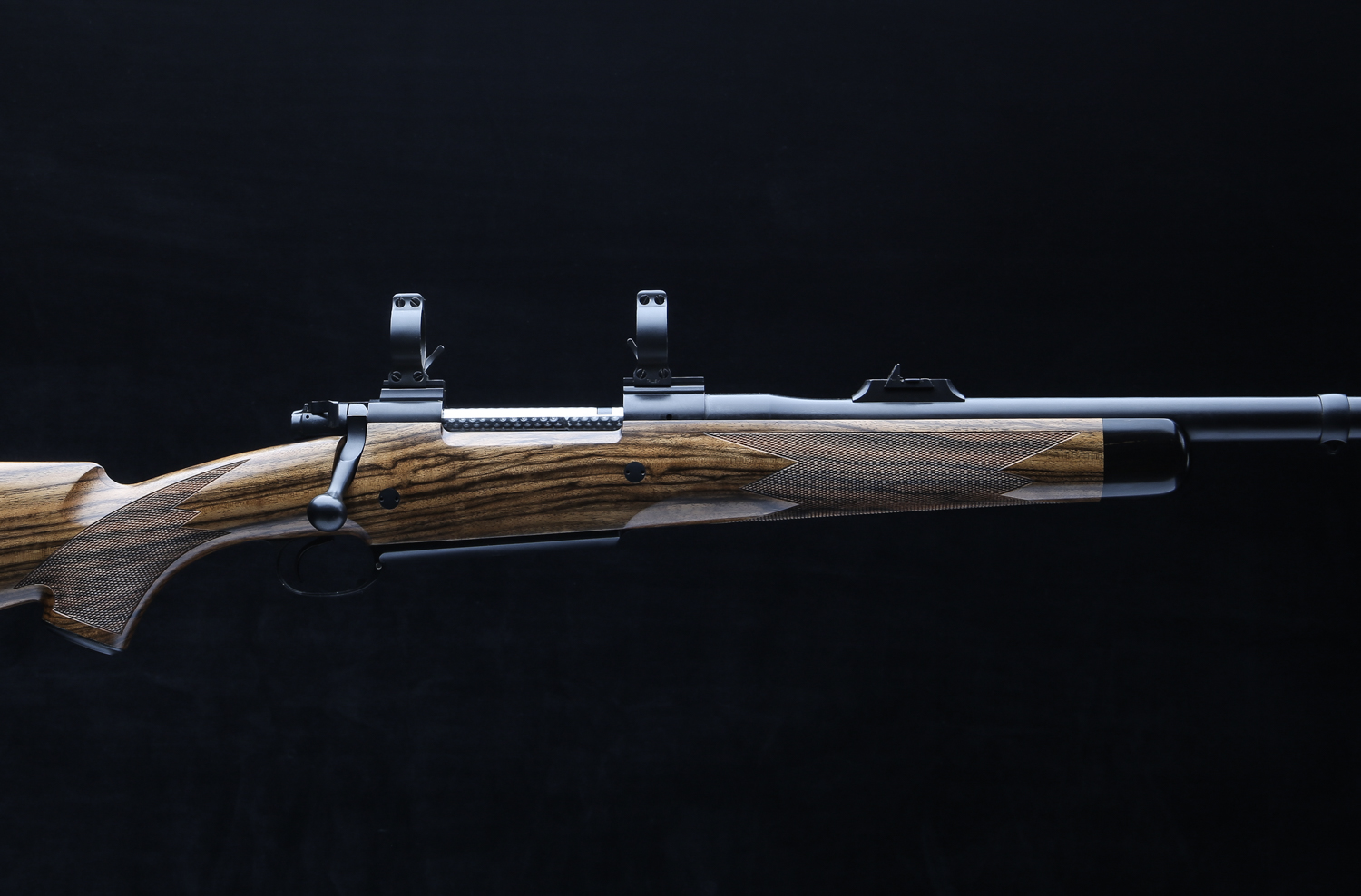 Dakota Arms made the M76 action to accommodate 6 different cartridge families, the largest designed around the .416 Rigby case which was available only in the African grade. The control round feed proprietary action incorporates the best features of both the Mauser M98 and the Winchester M70. The African has a slightly deeper magazine and is fitted with one-piece bottom metal that has  bit of a drop-belly straddle floorplate with an inside-the-bow release coupled with the magnum sized action holds 4 down in the magazine with room to close the bolt on a chambered round, giving the shooter a 5 round capacity. Dakota Arms actions also have M70 type trigger and safety. The bolt of this rifle is jeweled and the action fitted with Talley 30mm Lever Lock rings and dovetail bases.