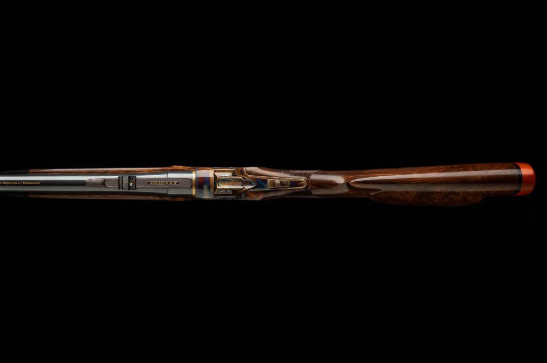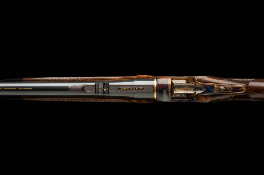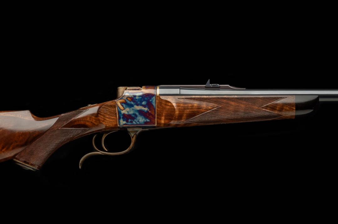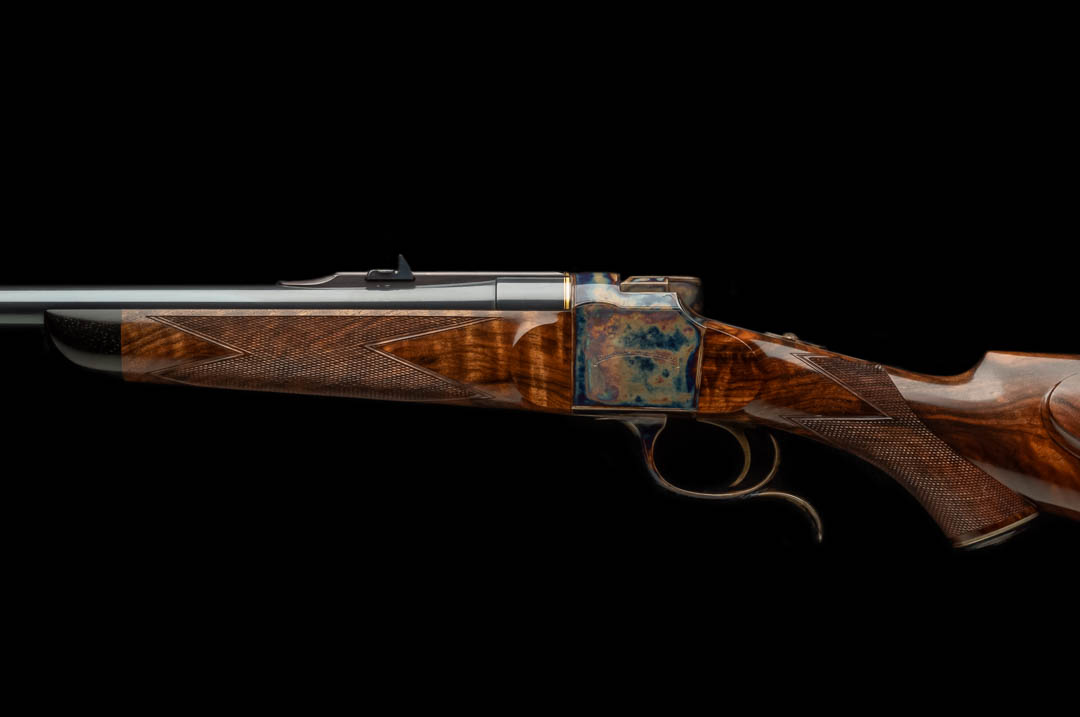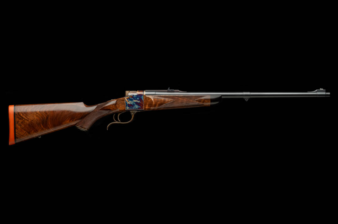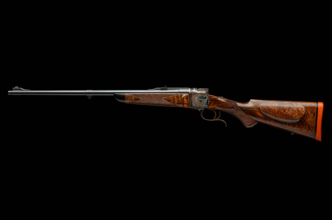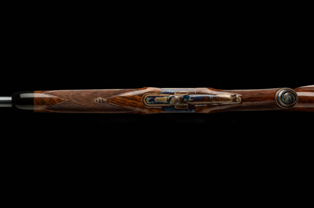 The finish is top class throughout, with the aesthetic of a purposeful hunting rifle. Sparse engraving but first rate where it is found, a well figured walnut pistol-hand stock with steel grip cap. Fully colour-case-hardened throughout.