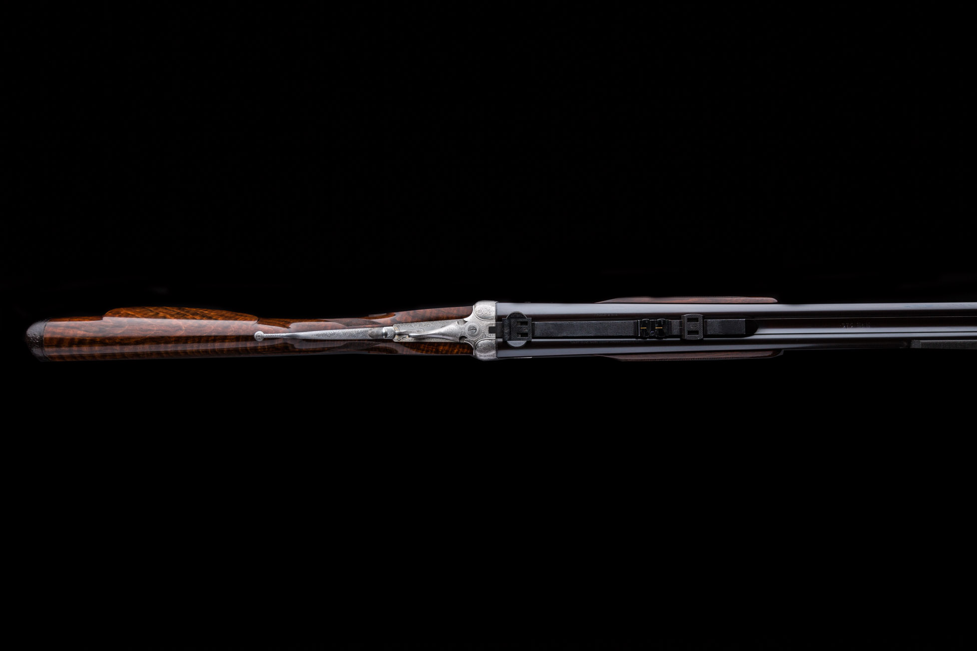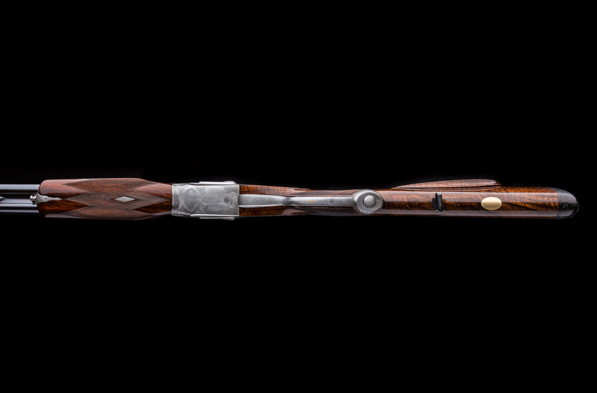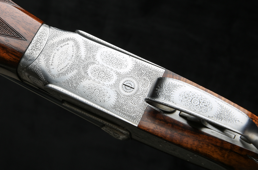 The Beesley patent self-opening action has sideclips and Purdey’s reinforced bolstered frame, disk set strikers, a bolted safety, and two triggers. Stock is reinforced with an extended top strap and the rolled trigger bow and an extended guard bow tang. The receiver is has a brushed bright finish with well-cut house Rose & Scroll, gold lined cocking indicators and the words “SAFE” and “BOLTED” as well as the serial number are inlaid in gold.
